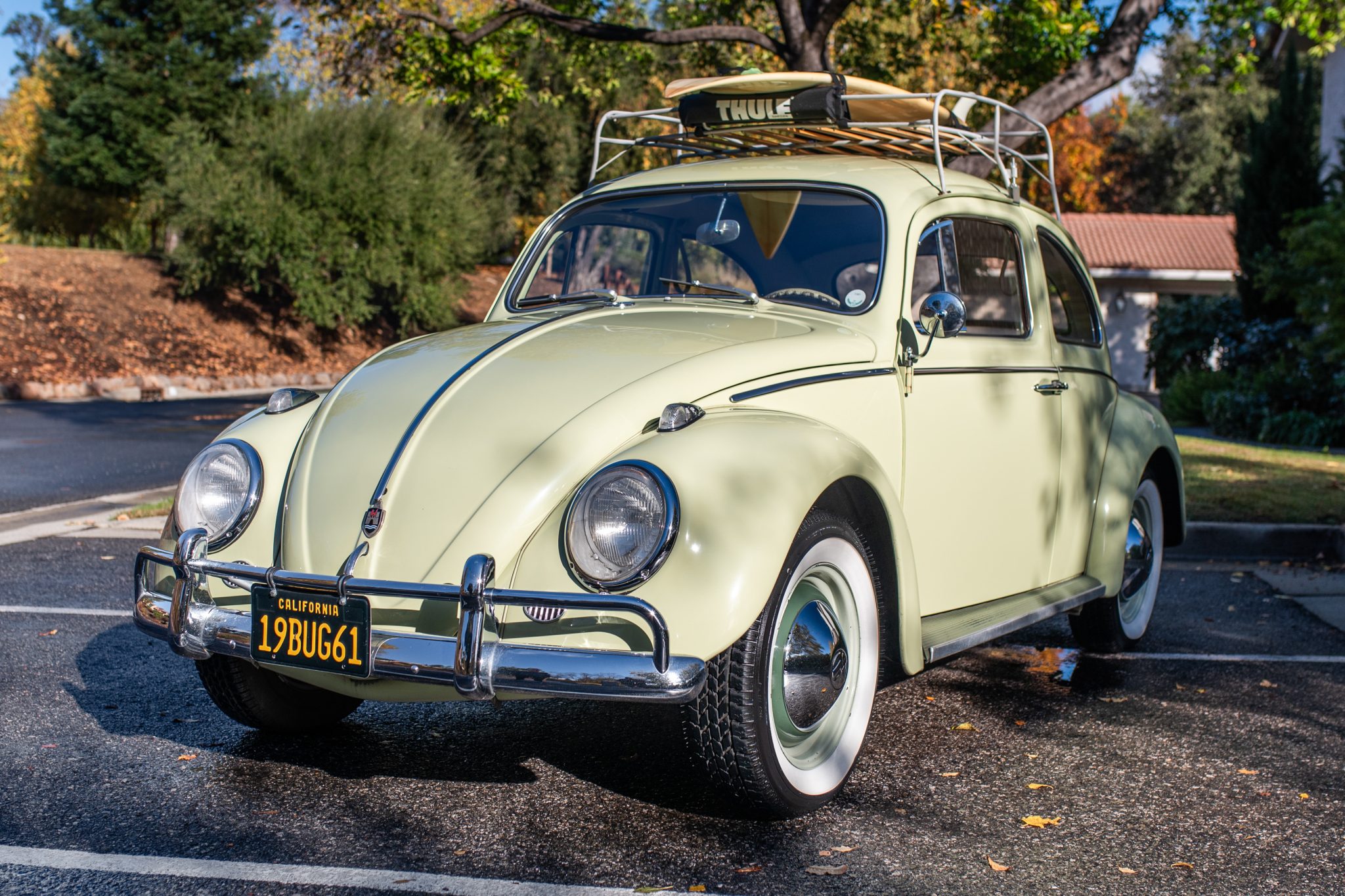 The 15″ steel wheels wear chrome VW-stamped hubcaps and are mounted with 165-series Coker Classic whitewall tires, and a matching spare is housed in the front trunk. Stopping power is provided by drum brakes at all four corners. The rear brakes and wheel cylinders were replaced in 2020.