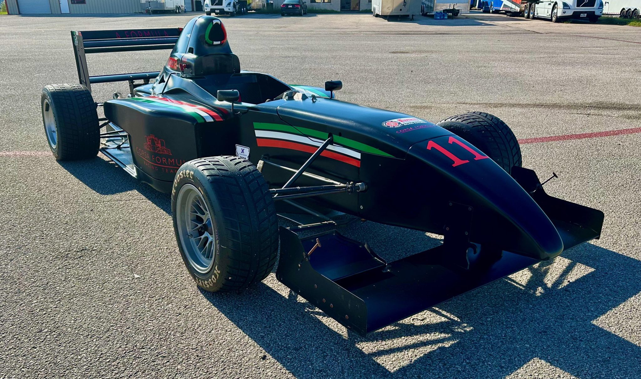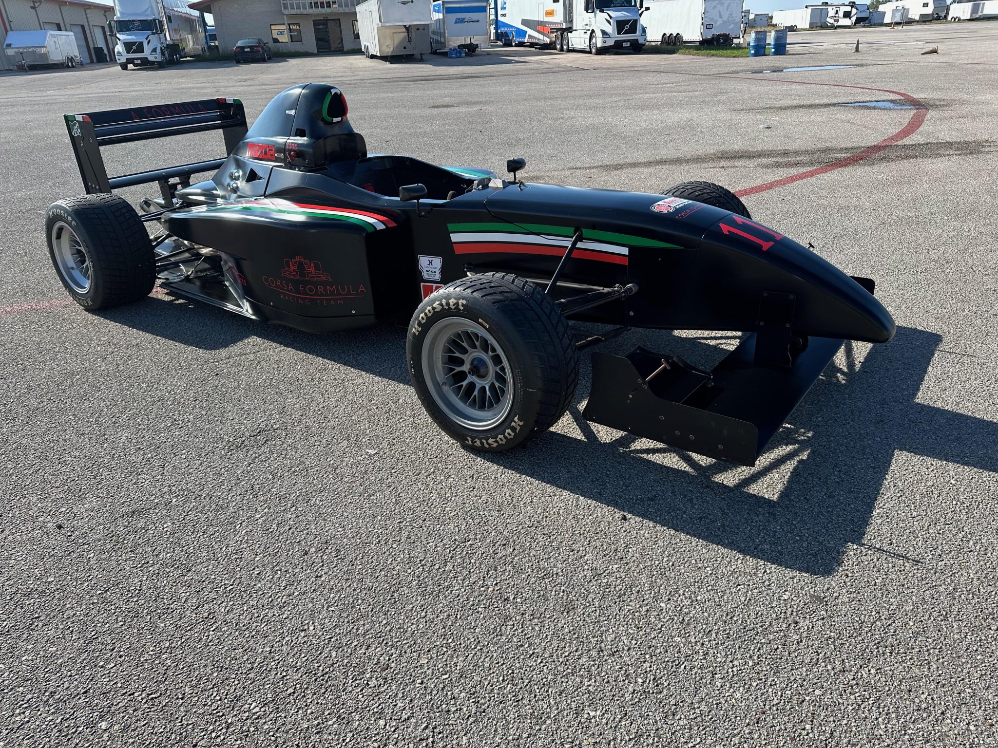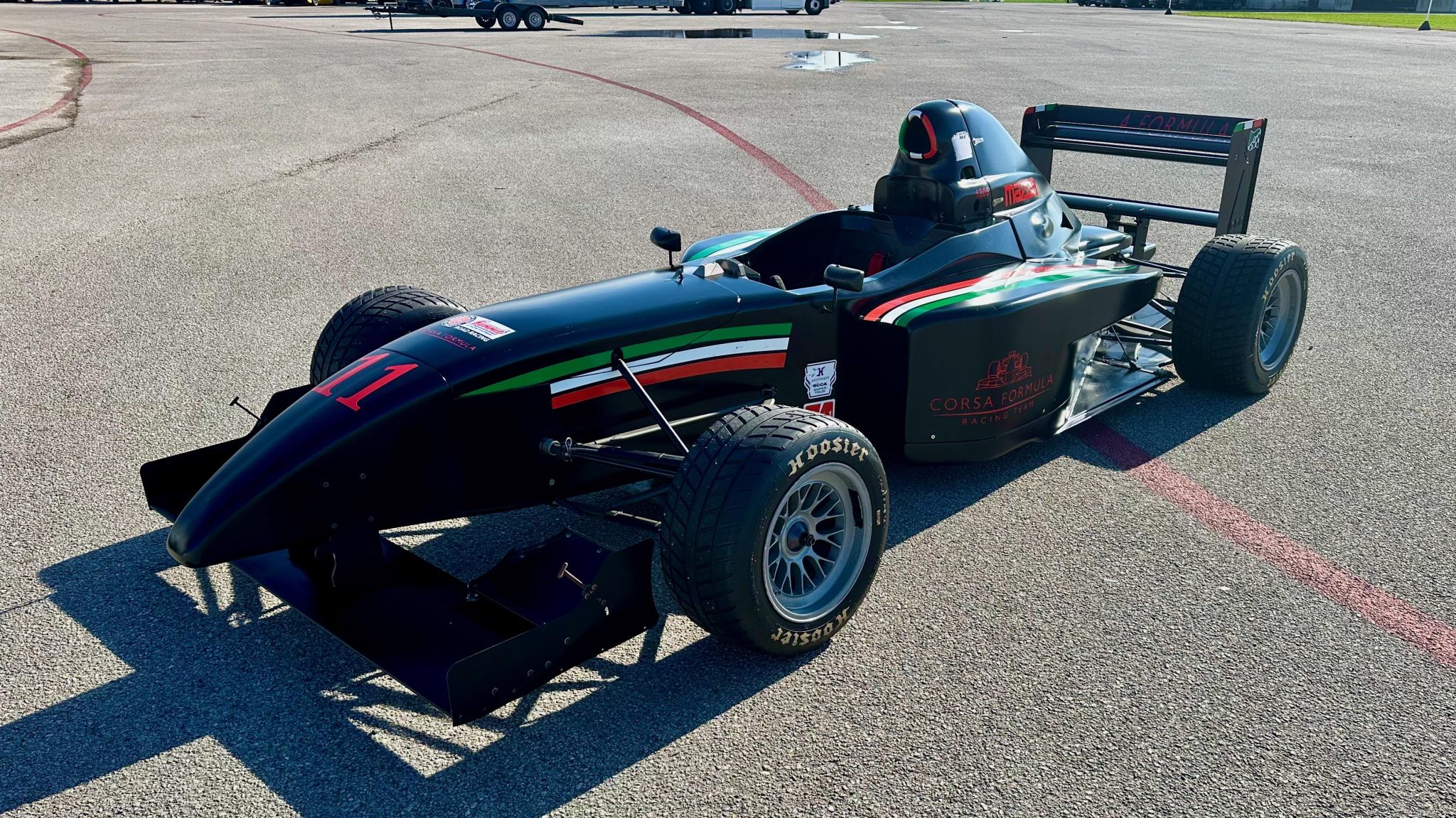 BBS center-lock wheels are mounted with 210/550 front and 275/570 Hoosier tires. The four-wheel independent suspension features adjustable coilovers, and stopping power is provided by Alcon calipers over slotted rotors at all four corners.