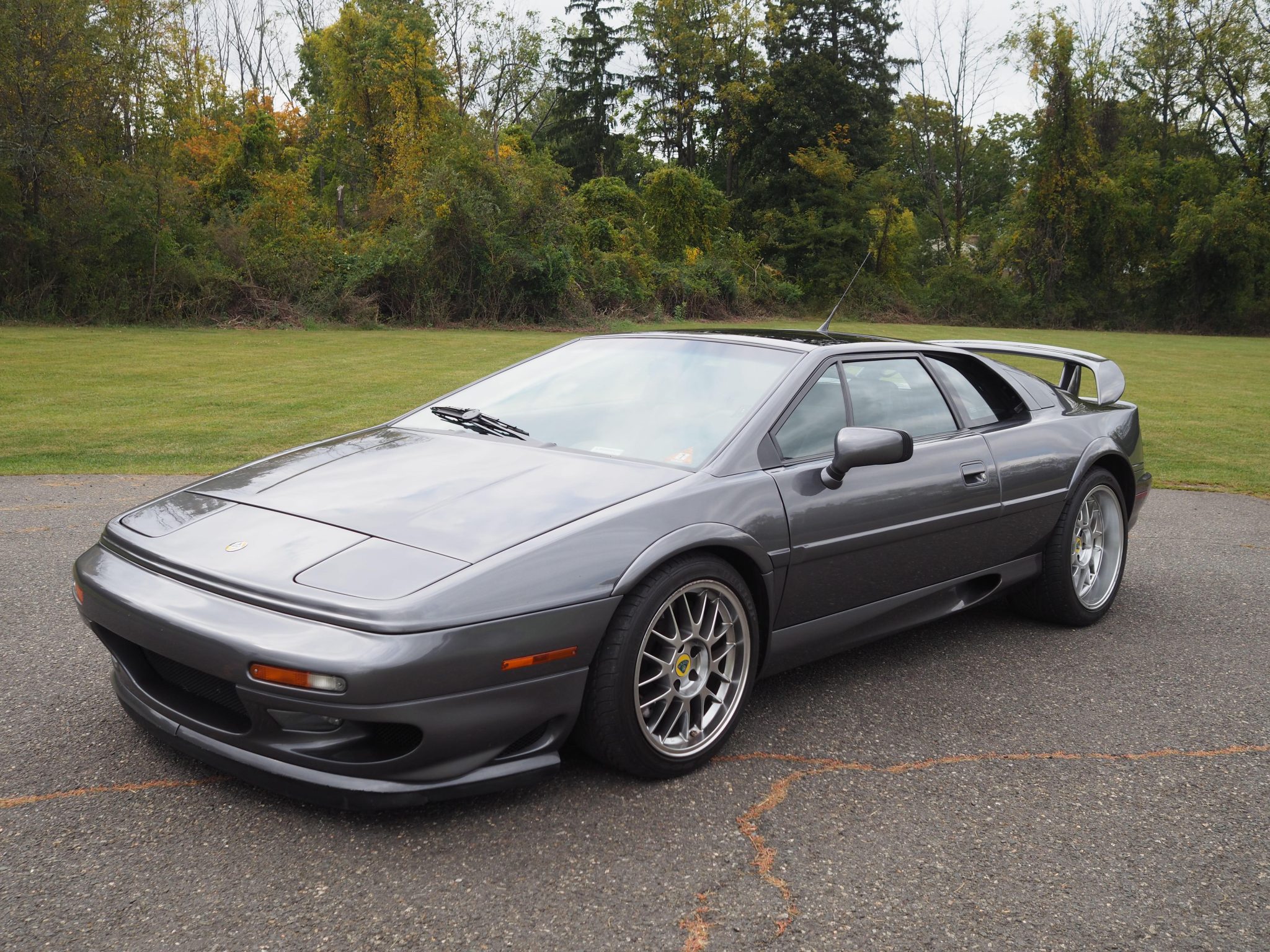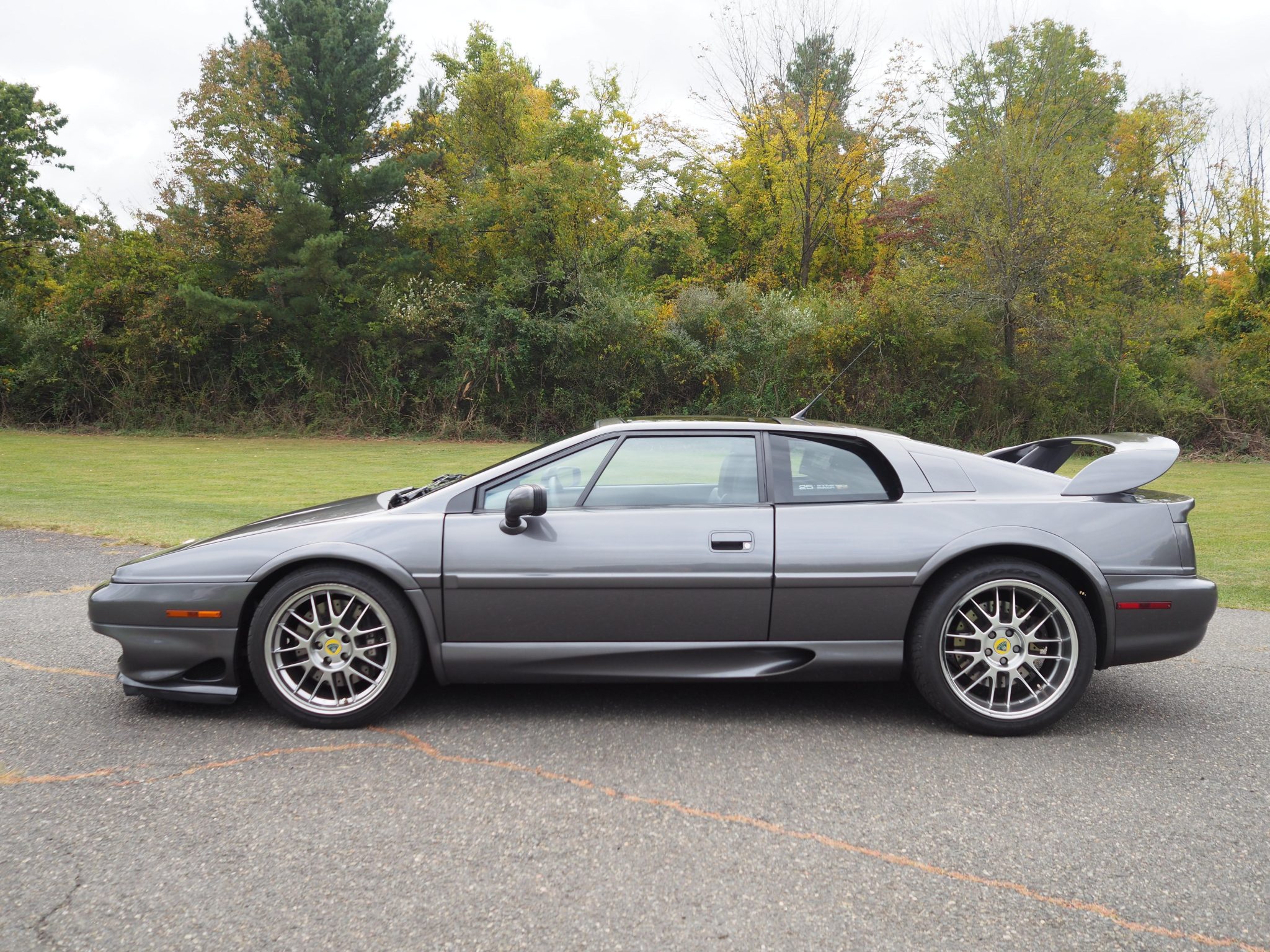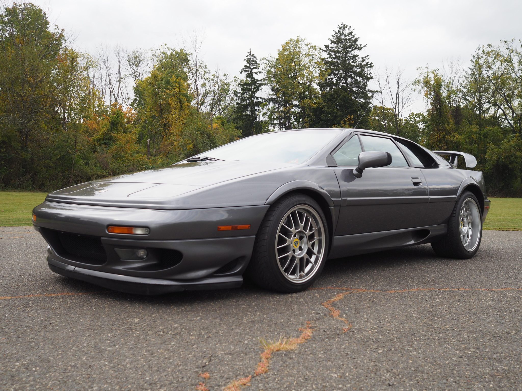 The 17″ front and 18″ rear OZ Monoblock Nova wheels are mounted with older Dunlop SP Sport 9000 tires. The left-rear wheel has curb marks. Braking is handled by AP Racing front calipers and cross-drilled rotors at each corner.
