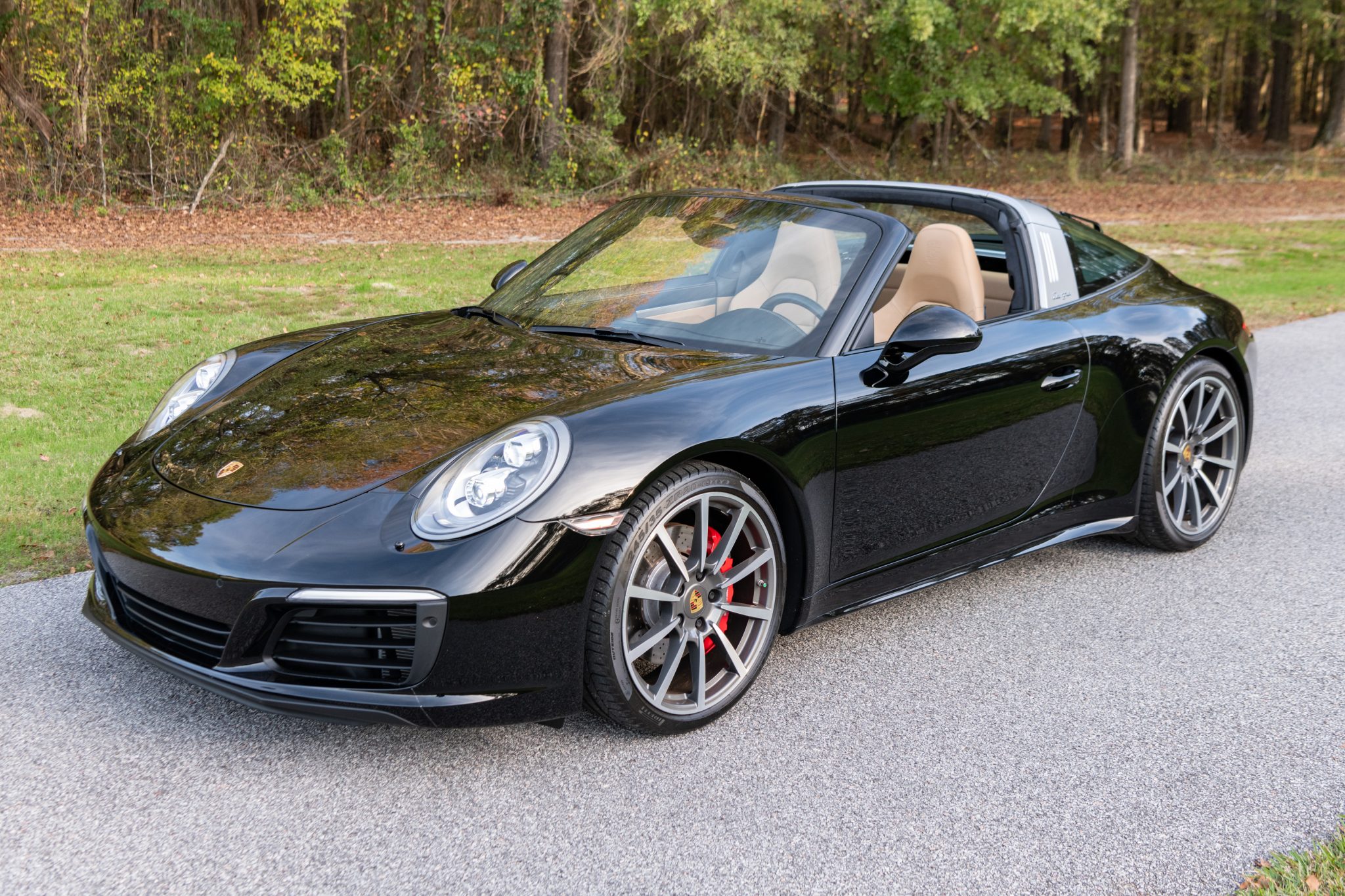 The 20″ Carrera Classic alloy wheels are mounted with Pirelli P Zero tires. Braking is handled by red-painted Porsche-branded calipers over cross-drilled and ventilated discs. The car is equipped with Porsche Active Suspension Management (PASM), Power Steering Plus, a front-axle lift system, and Porsche Dynamic Chassis Control (PDCC).