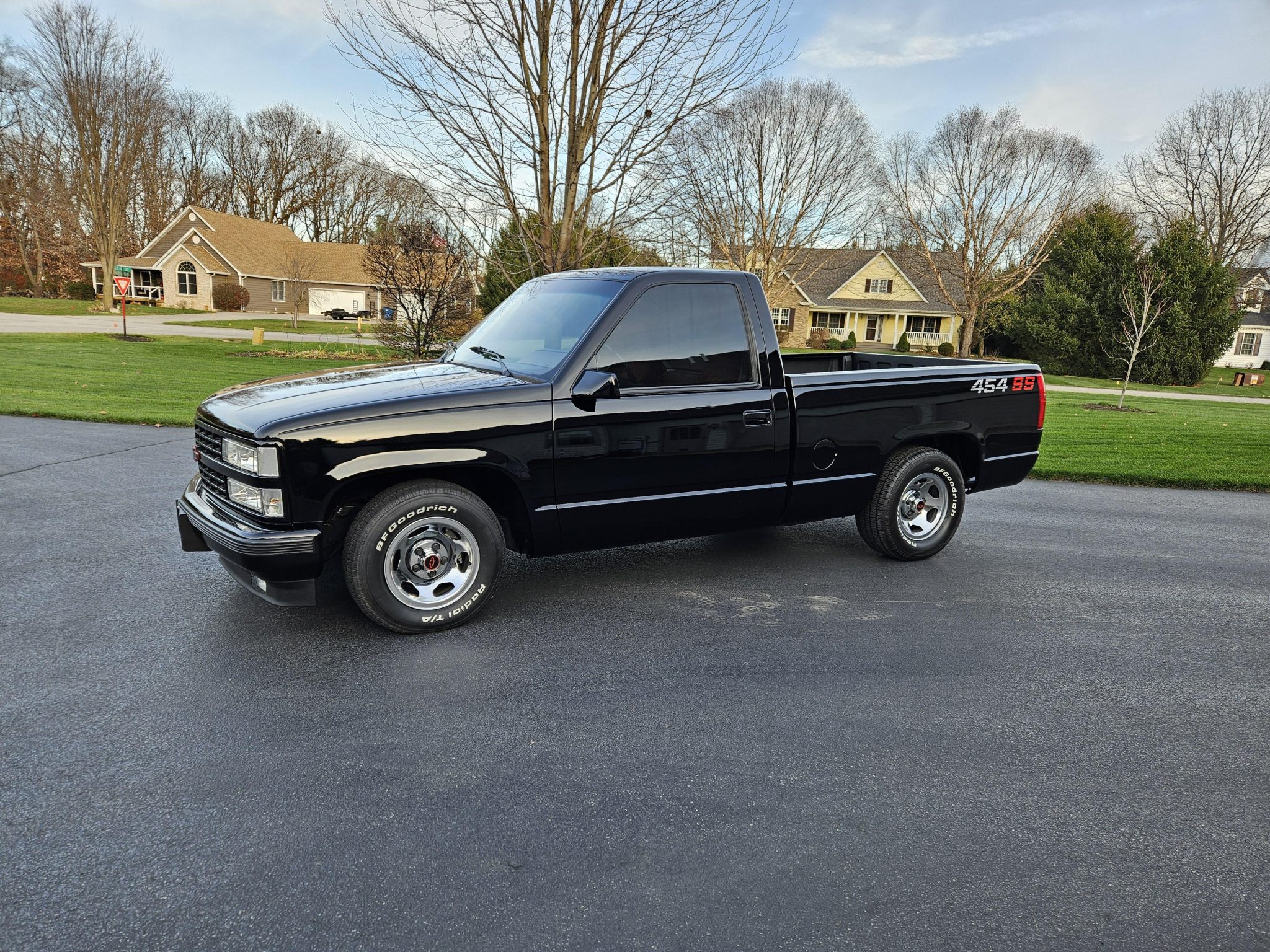 Chrome-finished 15″ wheels are mounted with BFGoodrich Radial T-A tires that have 2010 and 2023 date codes. All 454 SS examples were equipped with the Performance Handling Package, which included a 32mm front sway bar, a 12.7:1 steering ratio, and Bilstein dampers. Stopping power is provided by front discs and anti-lock rear drums. The seller notes the truck has been lowered by two inches in the front and four inches in the rear, and the frame has a built-in C notch.