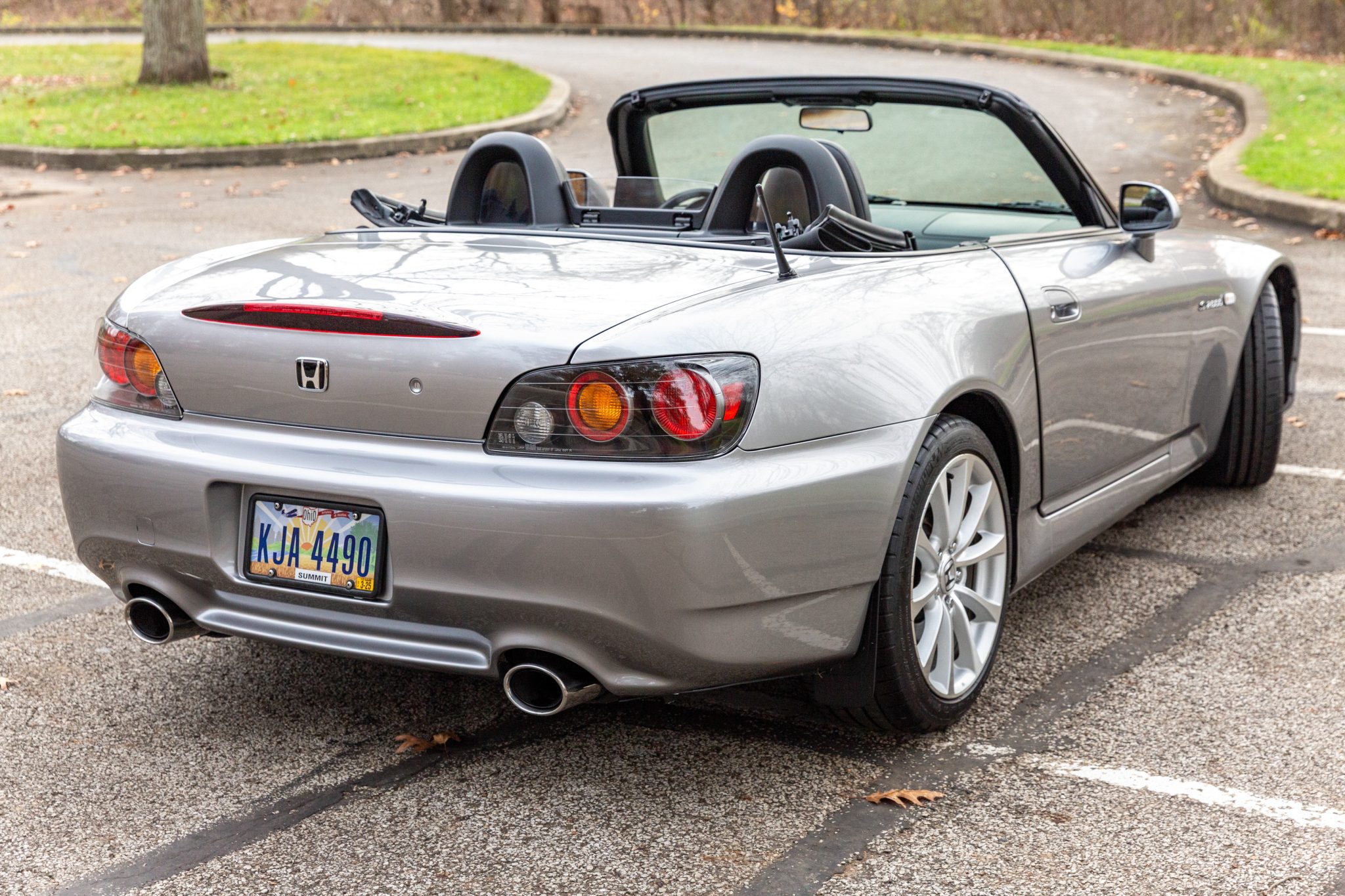 The 17″ 10-spoke wheels are mounted with Michelin tires. The car features double-wishbone suspension and four-wheel disc brakes with black-painted calipers. Two wheels have curb damage.