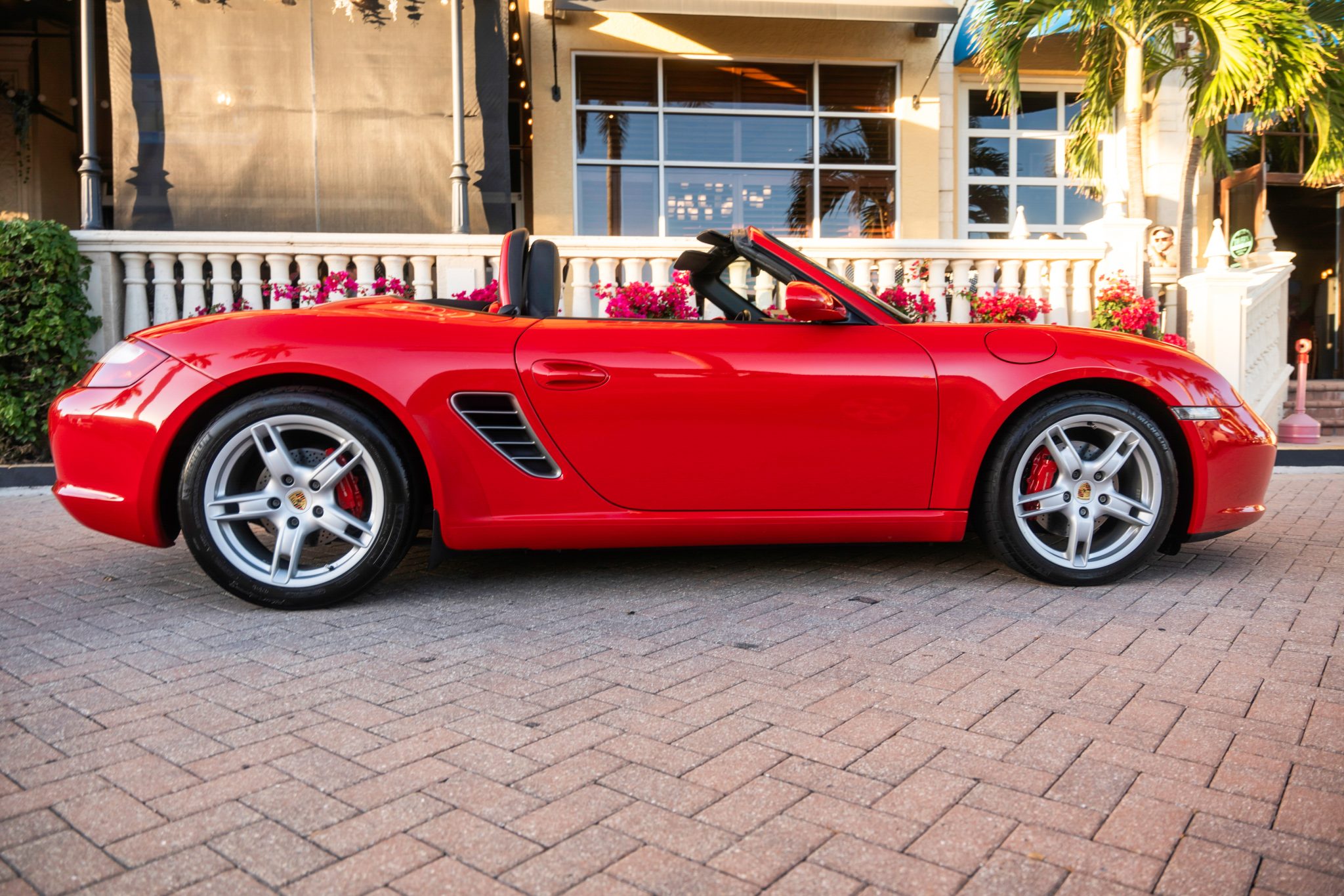 The 18″ Boxster S wheels are mounted with Michelin Pilot Sport N4 tires, which were replaced in November 2023. The car is equipped with Porsche Active Stability Management, and braking is handled by four-piston Porsche-branded calipers over cross-drilled rotors. The seller notes that the brake rotors and pads were replaced in August 2023, the front control arms were replaced in January 2024, and work in May 2024 included replacing the dampers, springs, and shock mounts.