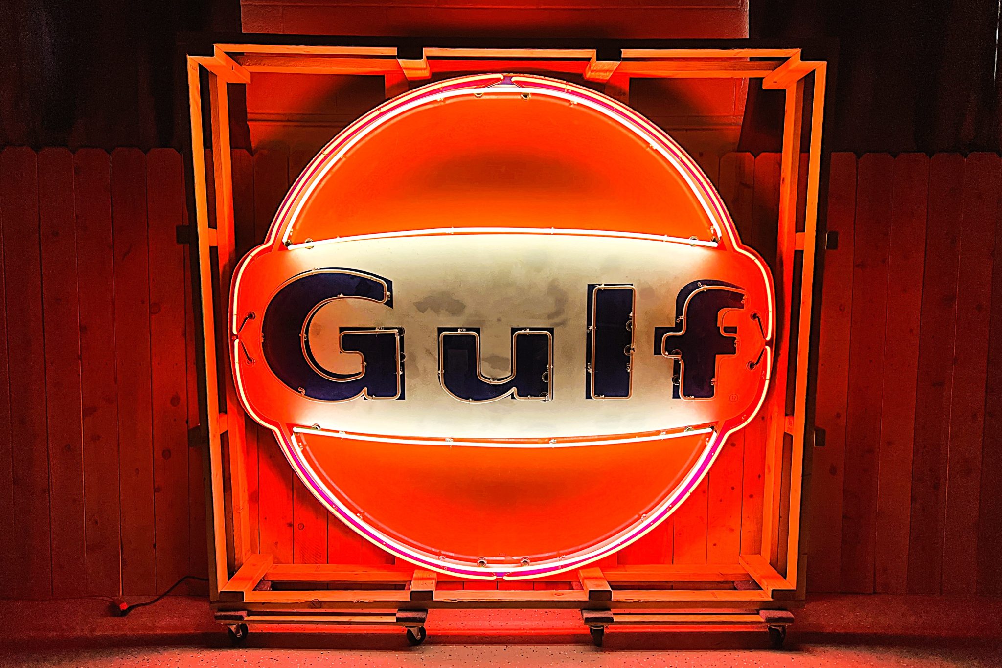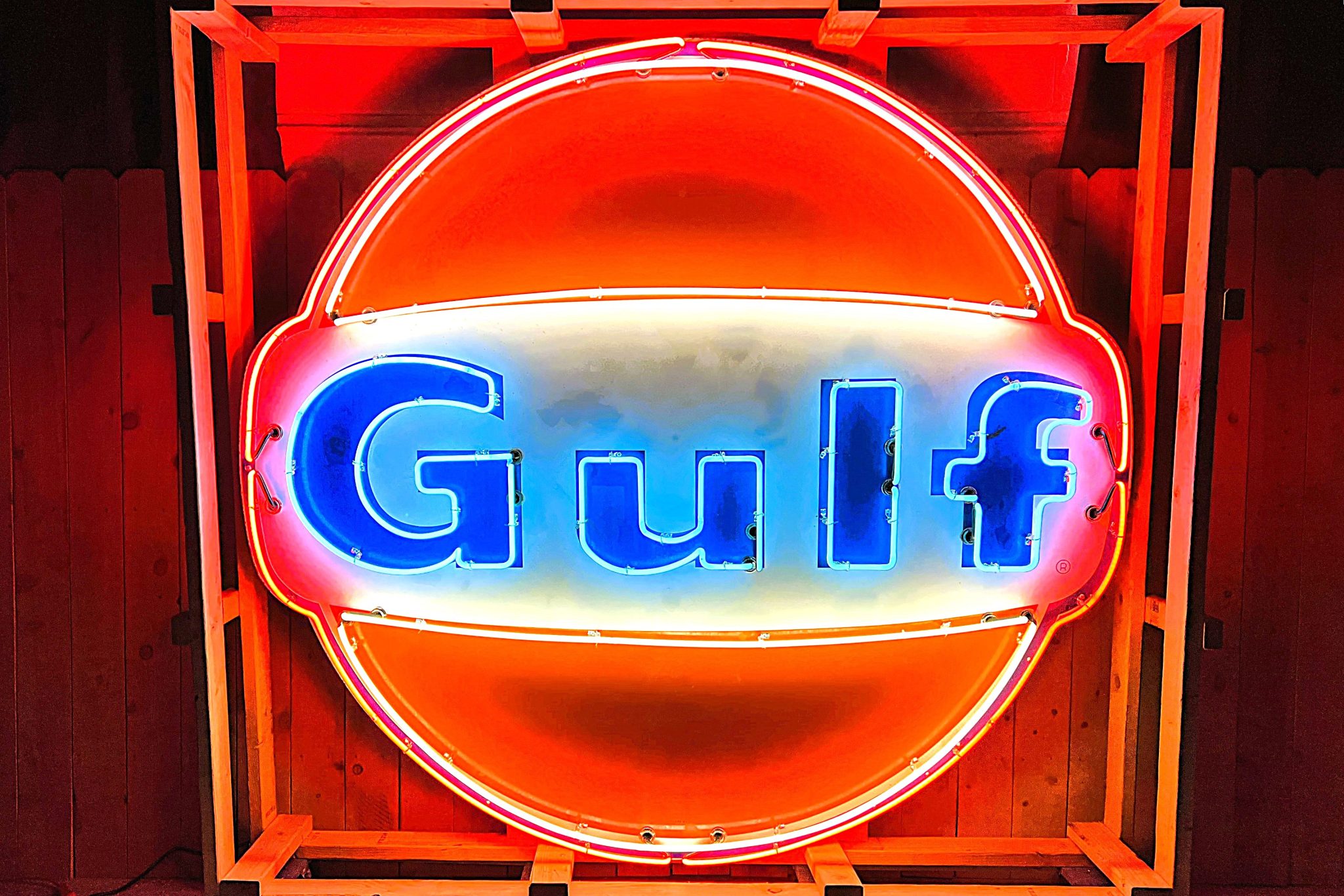 The blue, white, and orange neon lights were installed in 2024 by a craftsman based in Michigan. Additionally, the sign is equipped with an animator that enables the Gulf letters to illuminate individually in order, then flash, and then the sequence starts over. The animator can be turned off, and a speed dial allows it to play faster or slower.
