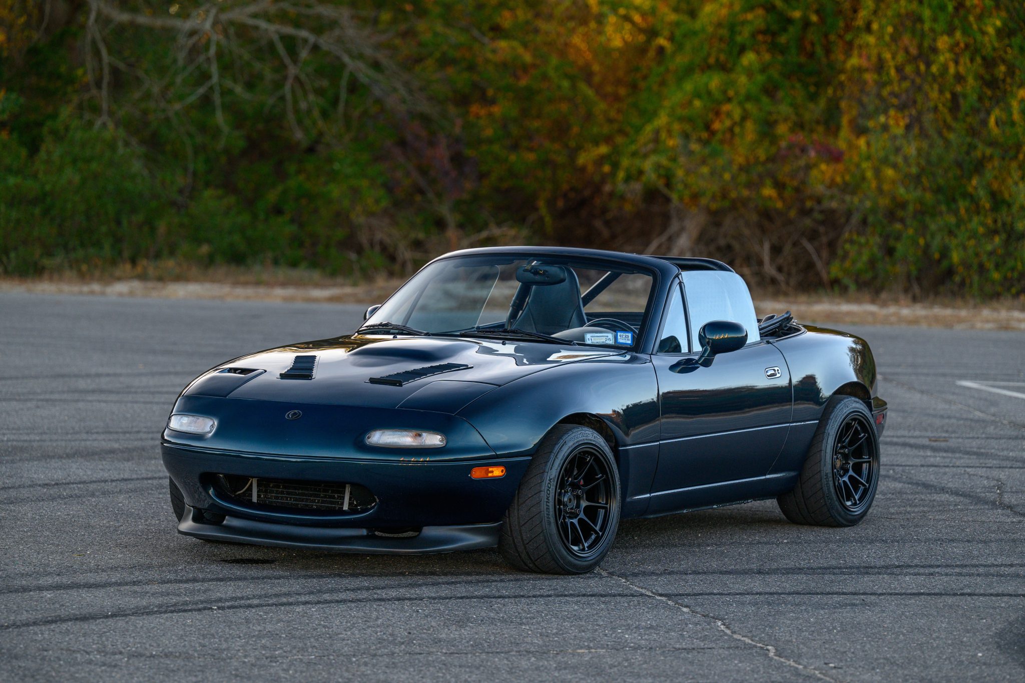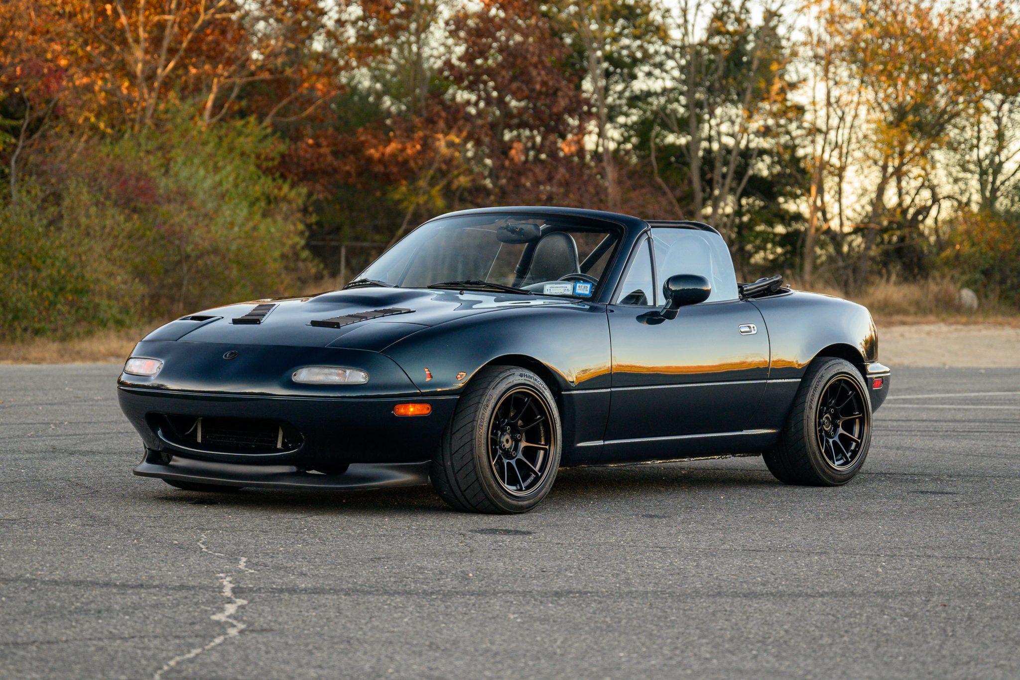 Suspension includes V8Roadsters 30-way monotube coilovers with revised spring rates, Jackson Racing sway bars, and Flyin’ Miata sway bar end links and frame-rail stiffeners. The car rides on Konig Dekagram 15×10″ wheels that are finished in matte black and mounted with 245/40 Hankook Ventus RS4 tires. The StopTech front big-brake kit features two-piece rotors and STR-42 calipers, while the M-Tuned rear setup features larger Volkswagen Corrado-spec rotors. A Wilwood master cylinder and proportioning valve are fitted. A power steering belt was replaced in July 2024. The seller reports a vibration around 90mph.