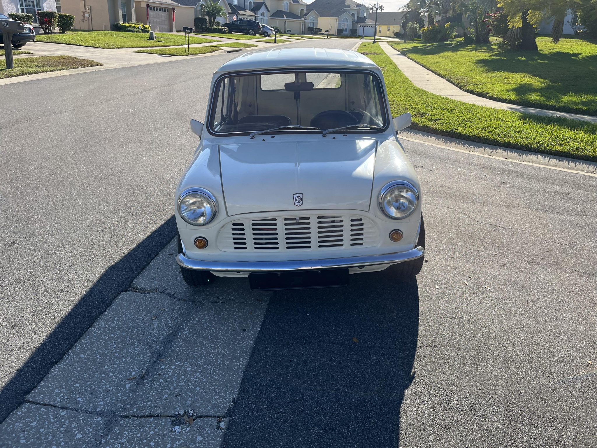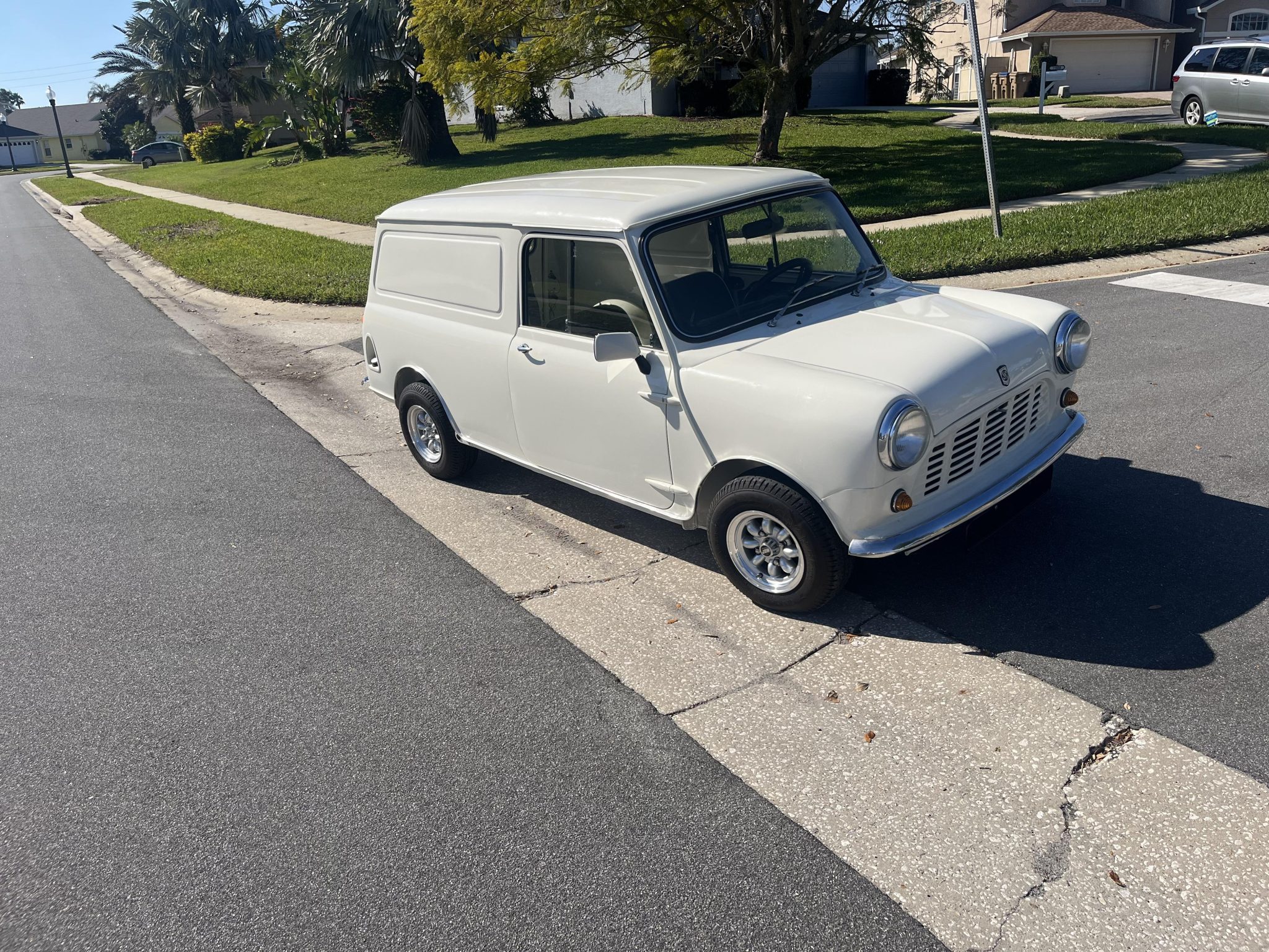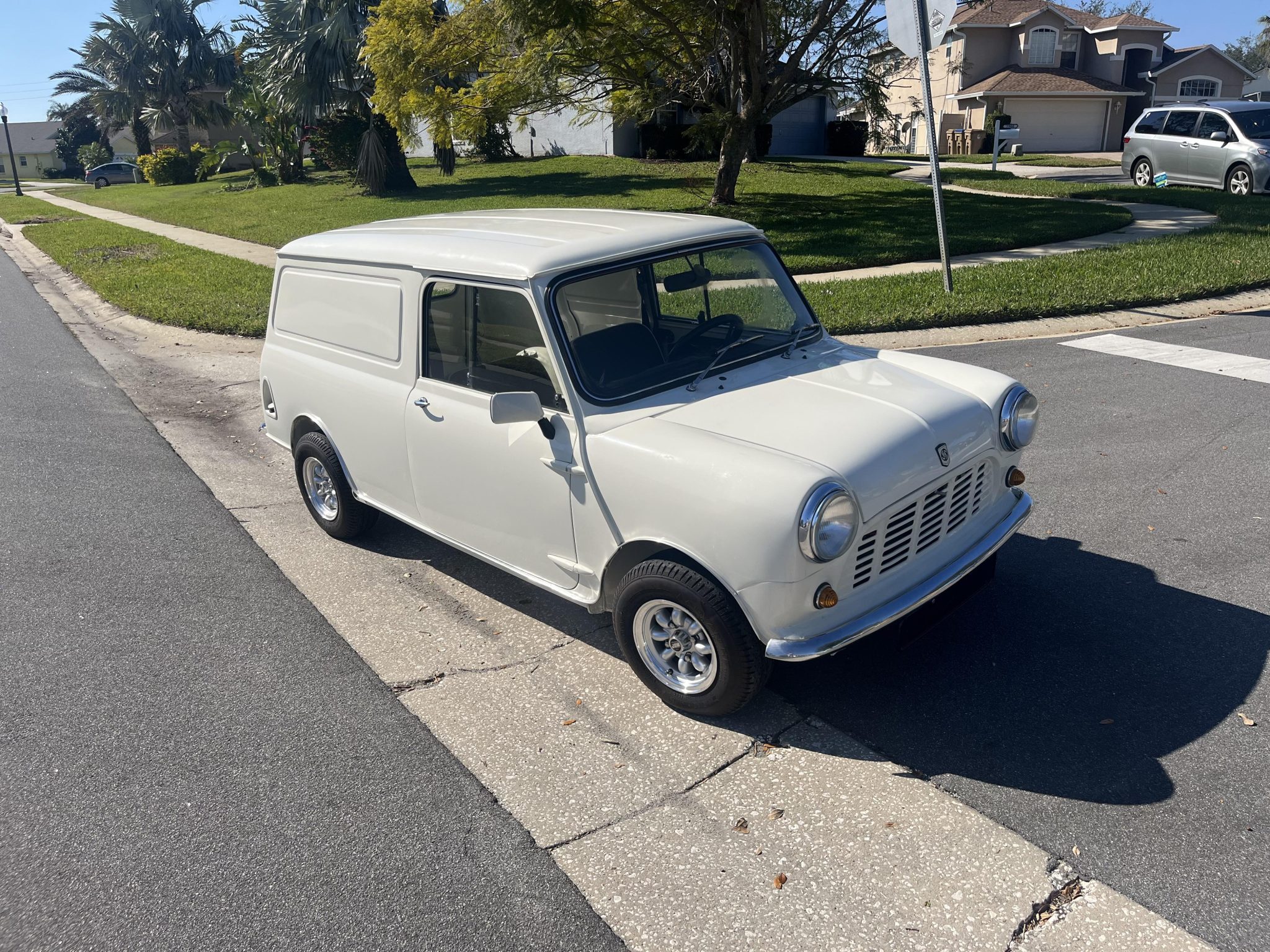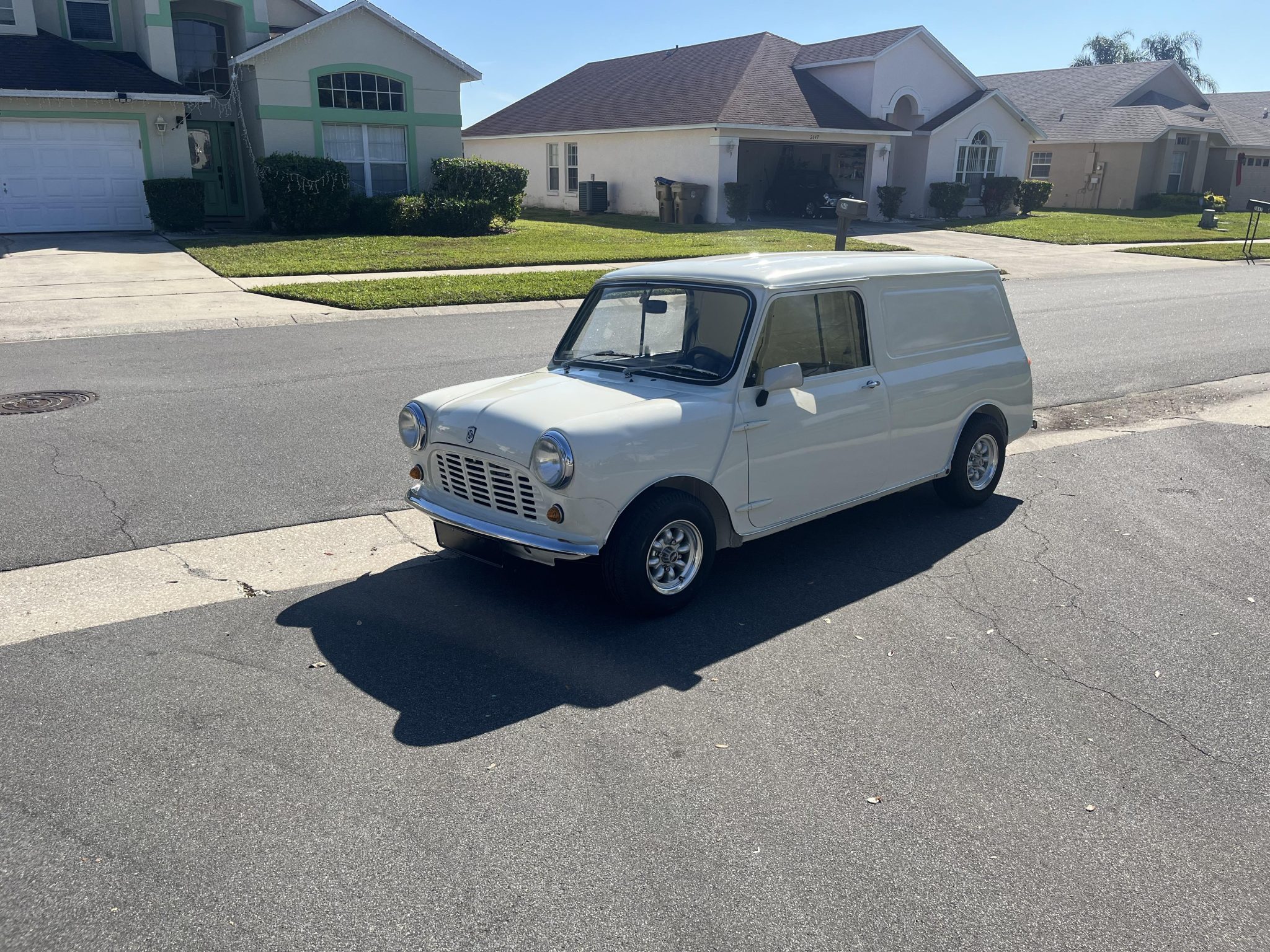 Minilite-style 10” alloy wheels from John Brown Wheels are mounted with 165/70 Yokohama Advan HF Type-D A008 tires. Braking is handled by four-wheel drums with twin leading shoes up front. The springs, tires, and brake shoes and slave cylinder were reportedly replaced under current ownership.