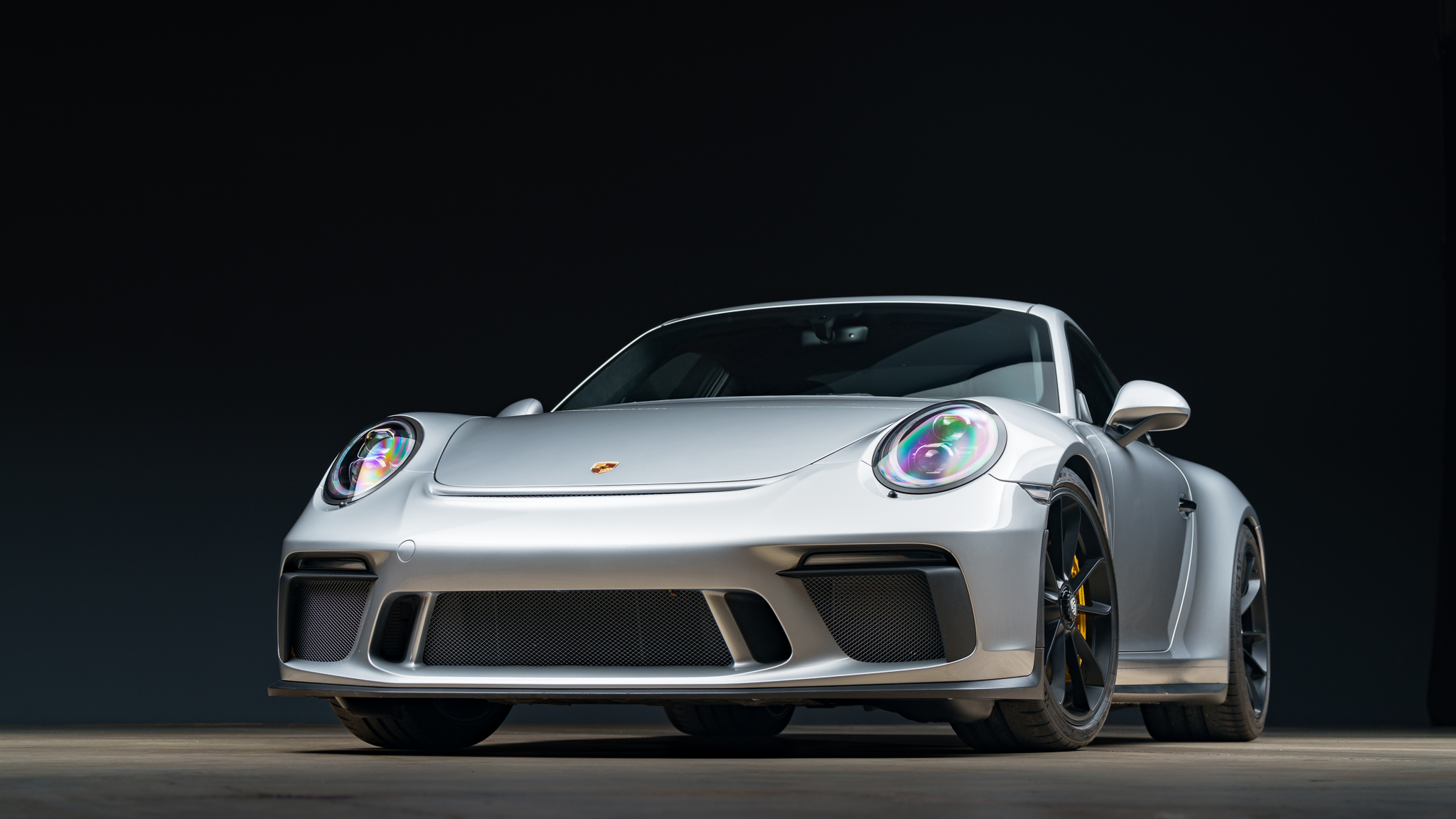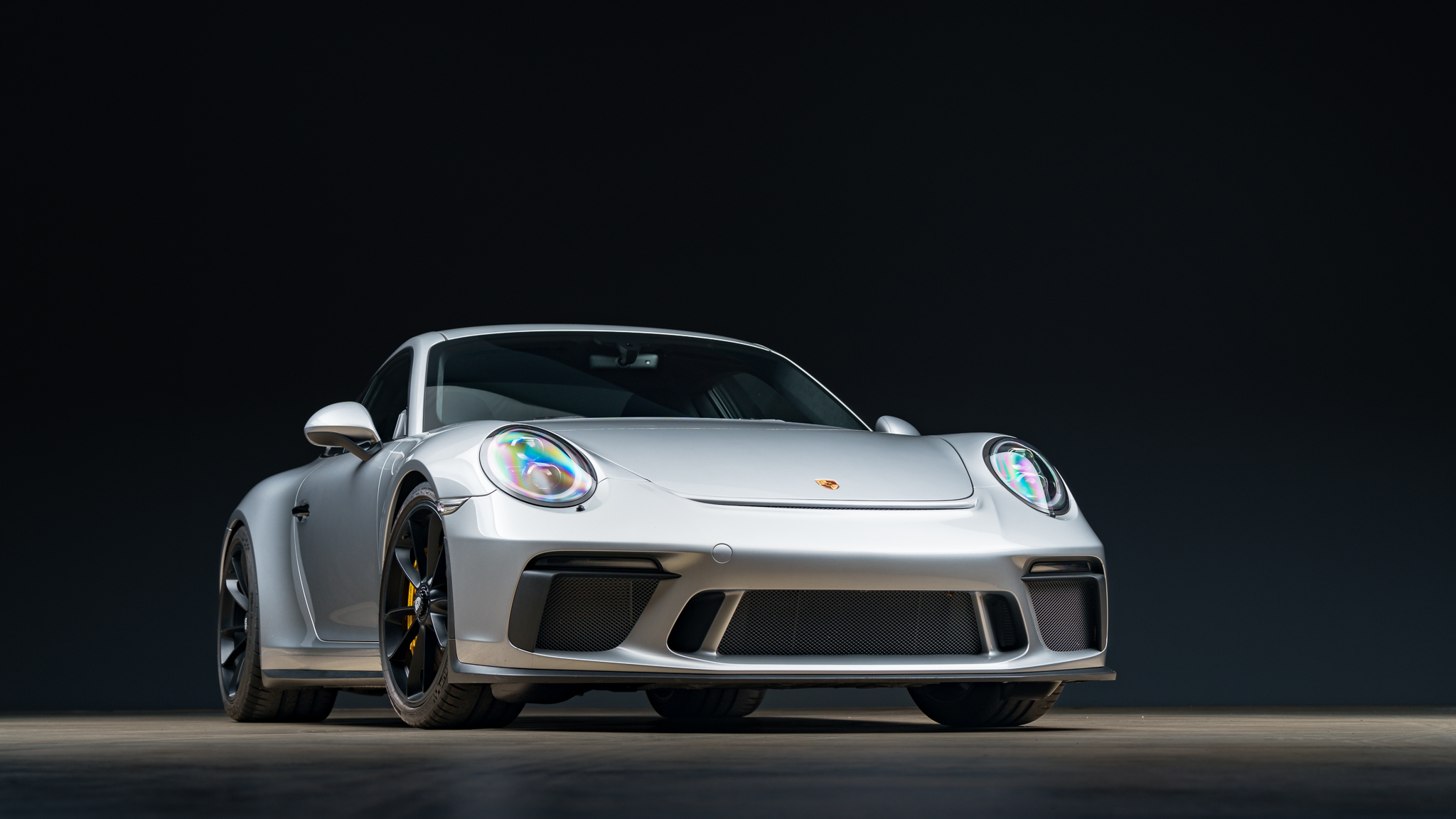Satin Black-finished 20″ center-lock alloy wheels are mounted with Michelin Pilot Sport Cup 2 tires. Braking is handled by yellow Porsche-branded calipers over ceramic-composite rotors, and the car is equipped with a front-axle lift system.