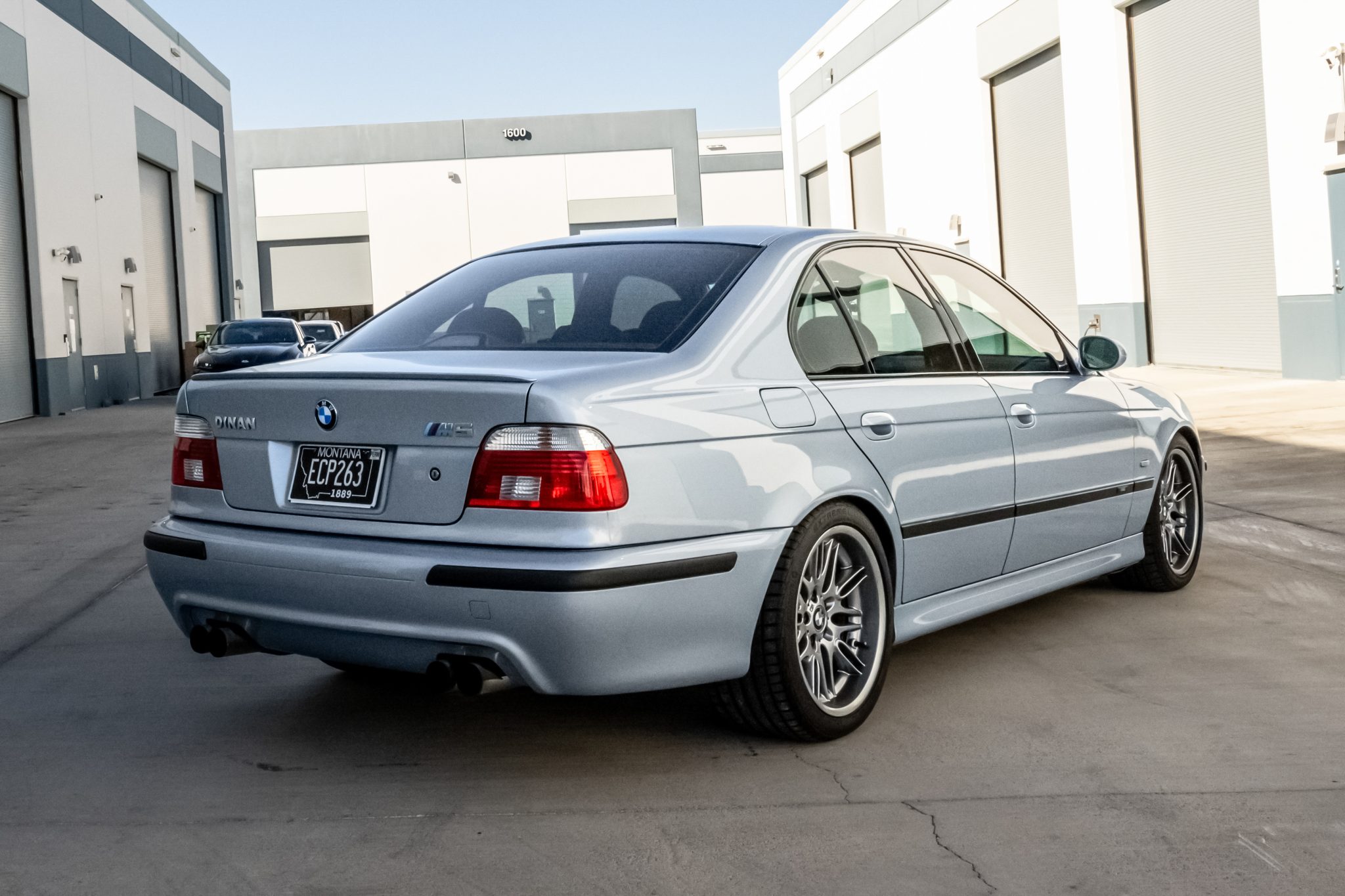 Chrome Shadow 18″ Style 65 wheels are mounted with 245/40 front and 275/35 rear Continental ExtremeContact tires. The car is equipped with Dinan front and rear strut tower braces, and the seller states that it also has Dinan Stage 3 suspension components including springs, adjustable shocks, camber plates, and front and rear sway bars. The car features Dynamic Stability Control (DSC) with All Season Traction, and braking is handled by four-wheel ventilated discs measuring 13.6″ and 12.9″ front and rear, respectively.