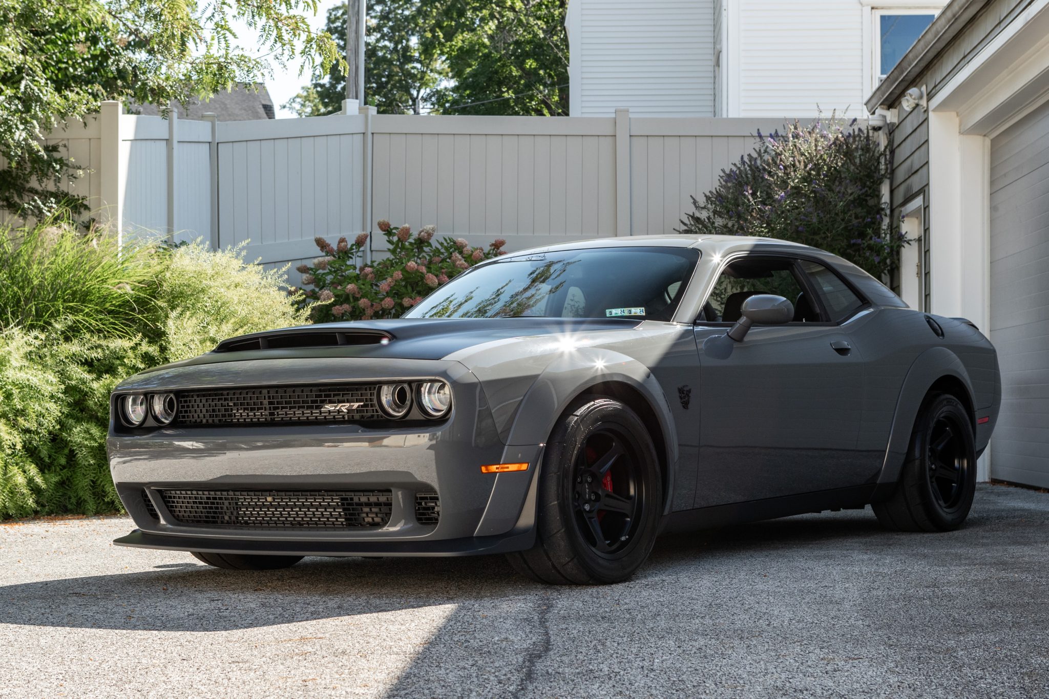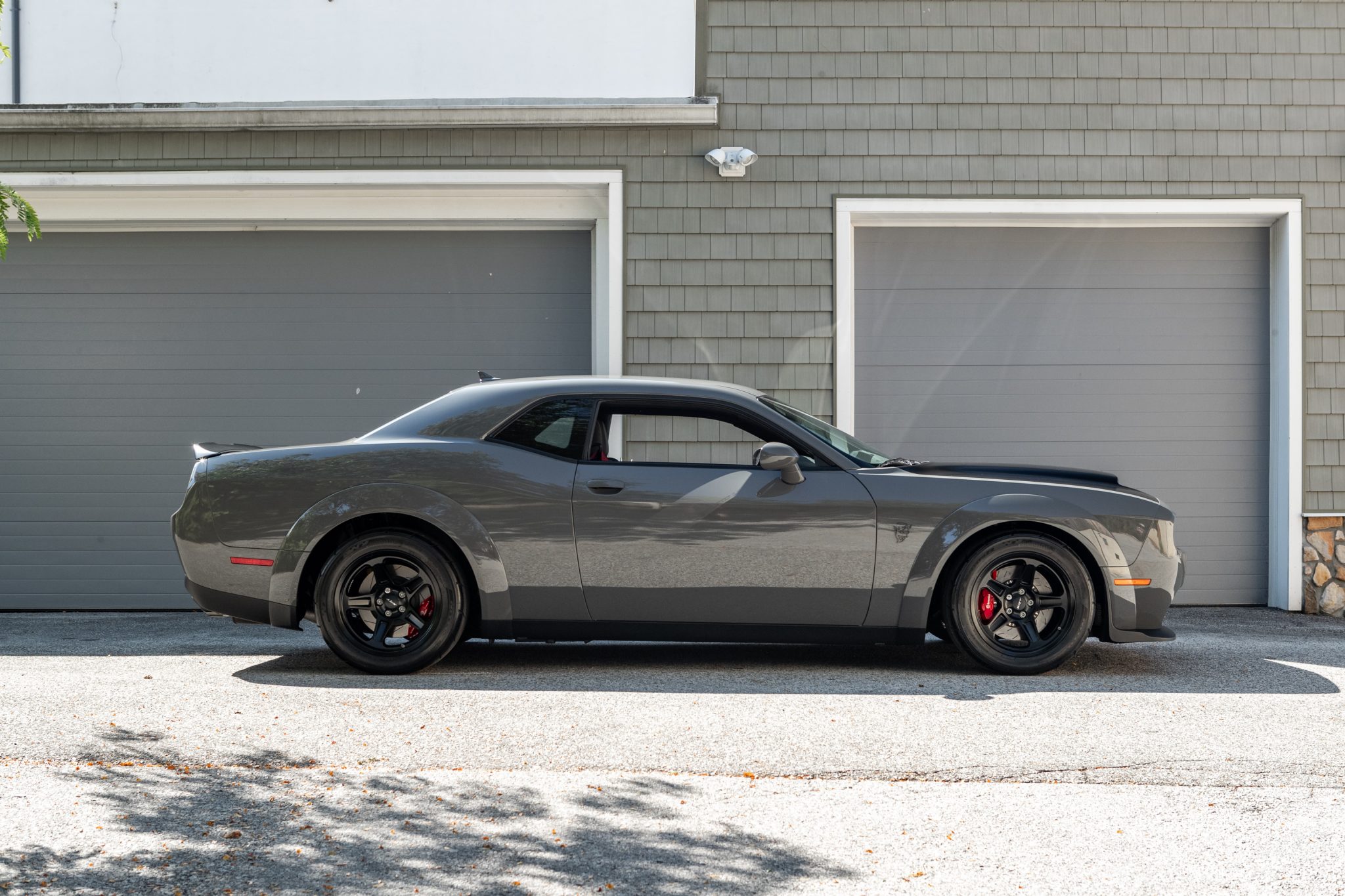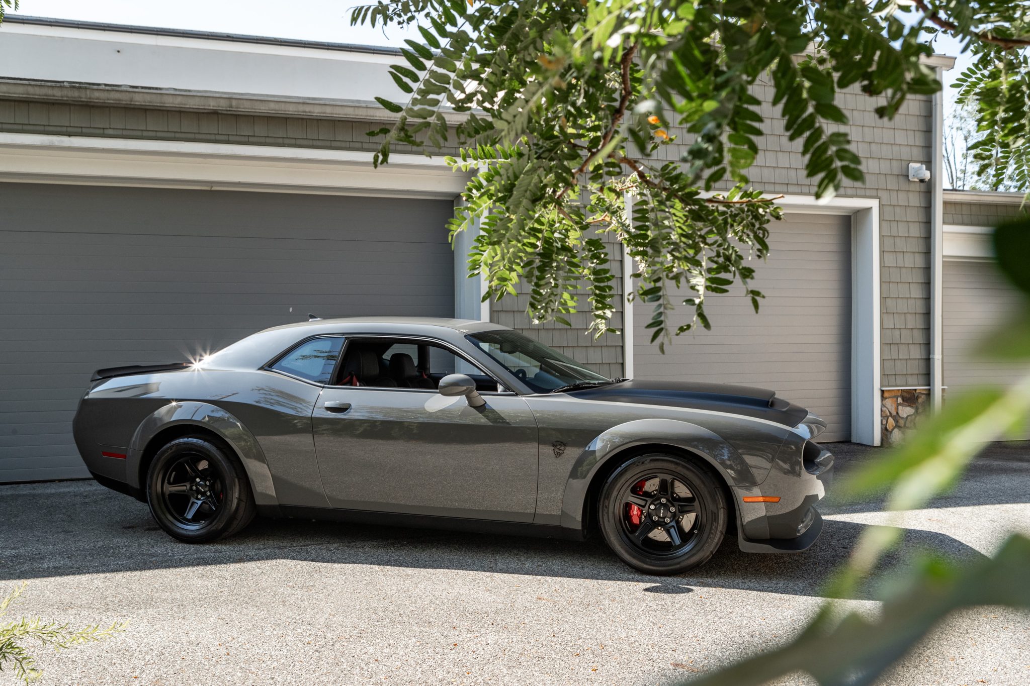 Black 18″ Hole Shot aluminum wheels are mounted with Nitto NT05R tires measuring 315/40 all around. Braking is handled by red-finished Brembo calipers fitted over slotted rotors at all four corners. The Demon is equipped with an active damping suspension as well as Drag Mode and Launch Assist, which alter the engine management profiles and activate the transbrake and line lock functions.
