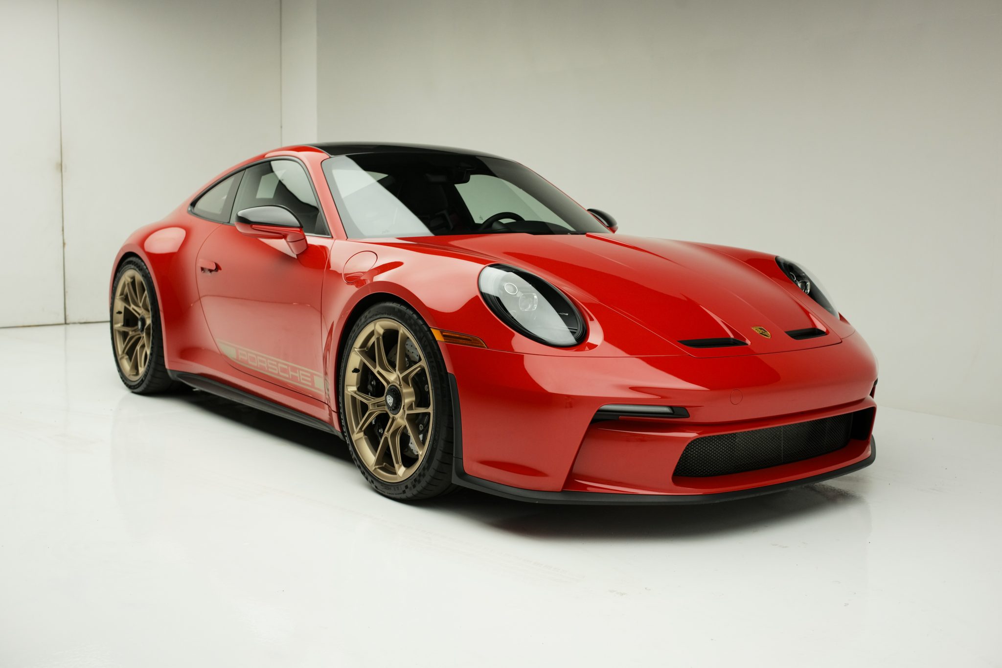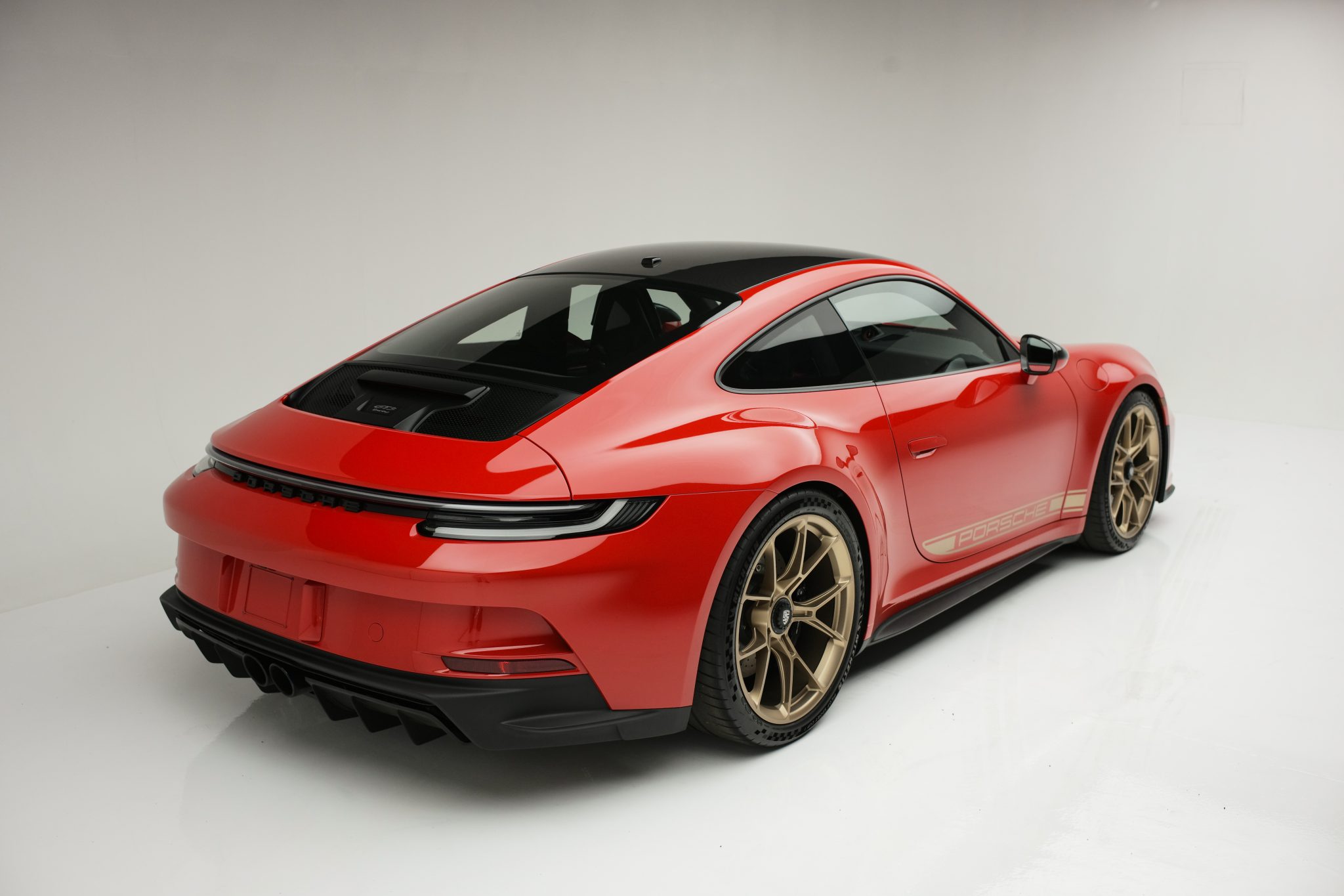 Satin Neodyme-finished 20″ front and 21″ rear GT3 center-lock wheels are mounted with Michelin Pilot Sport Cup 2 tires. Stopping power is provided by Porsche Ceramic Composite Brakes (PCCB) with black-finished calipers over cross-drilled and ventilated discs at each corner. The car is equipped with a front-axle lift system and rear-axle steering.