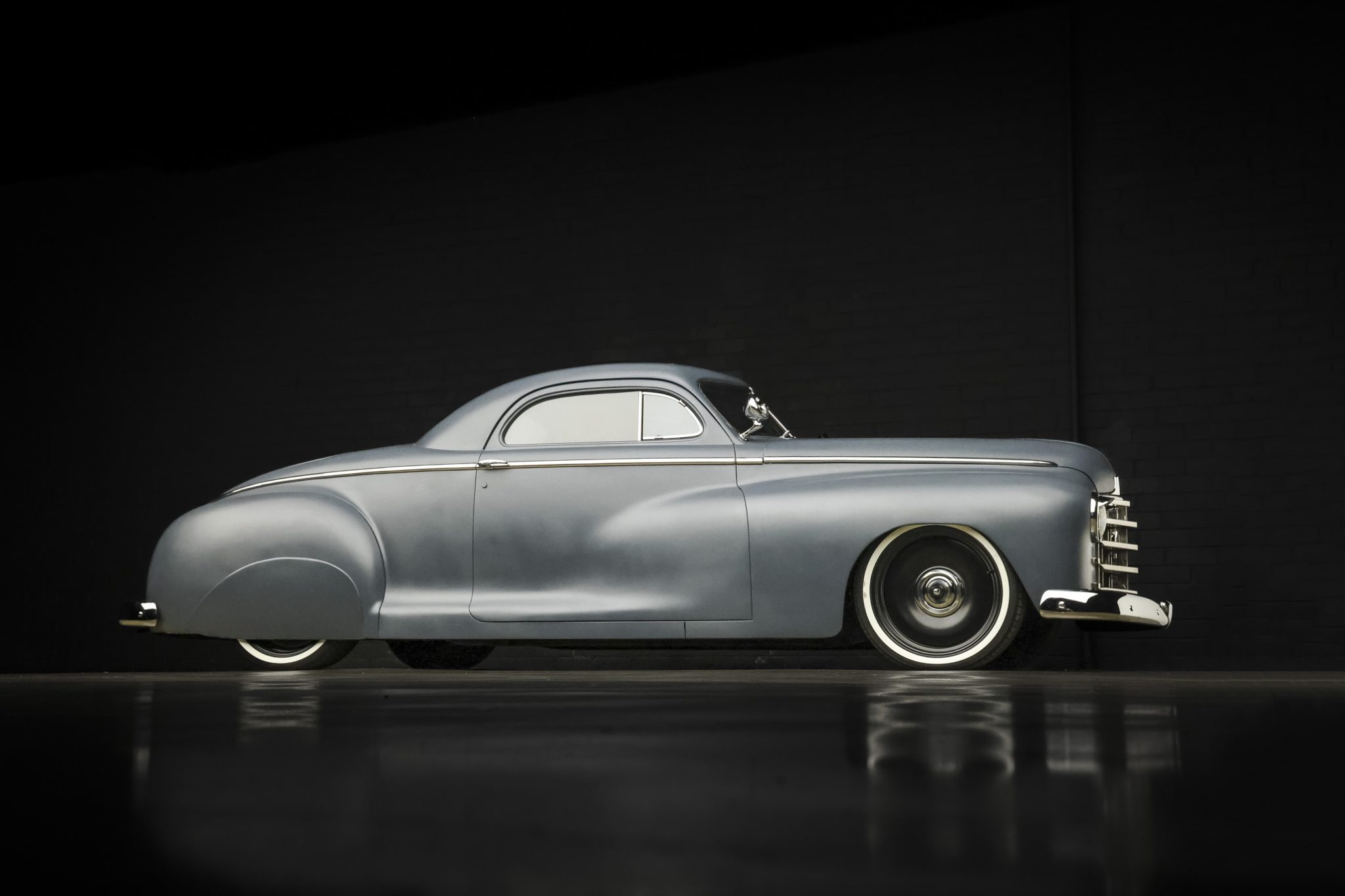 Smoothie-style 16” wheels are finished in satin black and wear polished bullet hubcaps. Coker whitewall tires have been installed. The frame has been notched, Chevrolet S-10 front rails have been grafted to the frame, and Chassis Engineering 3” de-arched leaf springs have been relocated inside the rails. An Air Lift Performance suspension system has been installed, and a JEGS electric brake booster provides assistance to the front discs and rear drums.