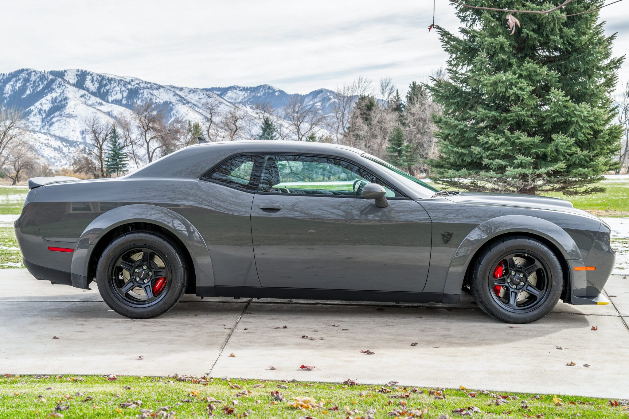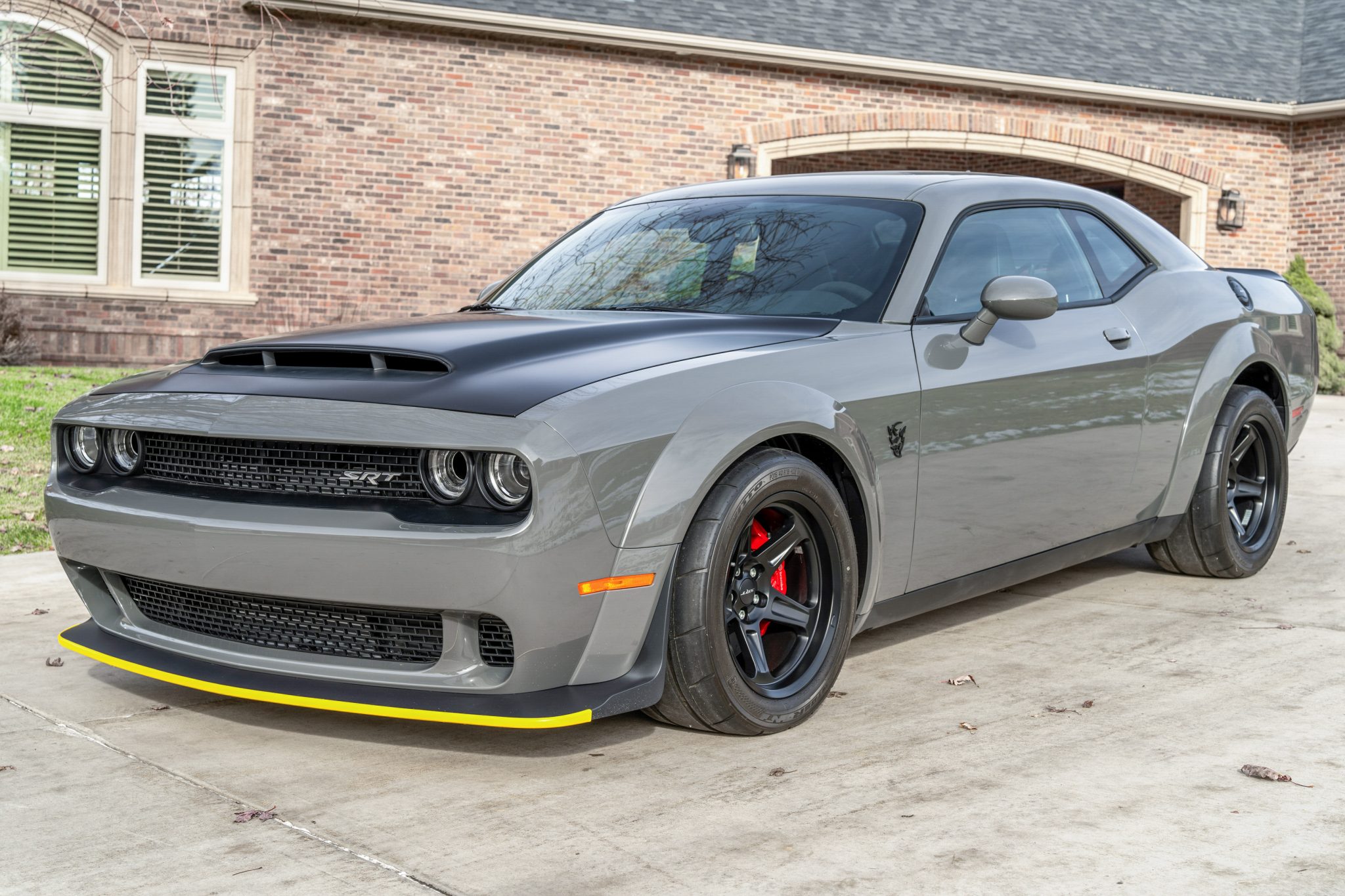 The 18″ Hole Shot aluminum wheels are mounted with 315/40 Nitto NT05R tires. Braking is handled by red-finished Brembo calipers fitted over slotted rotors at all four corners. The Demon is equipped with an active damping suspension as well as Drag Mode and Launch Assist, which alter the engine management profiles and activate the transbrake and line lock functions.