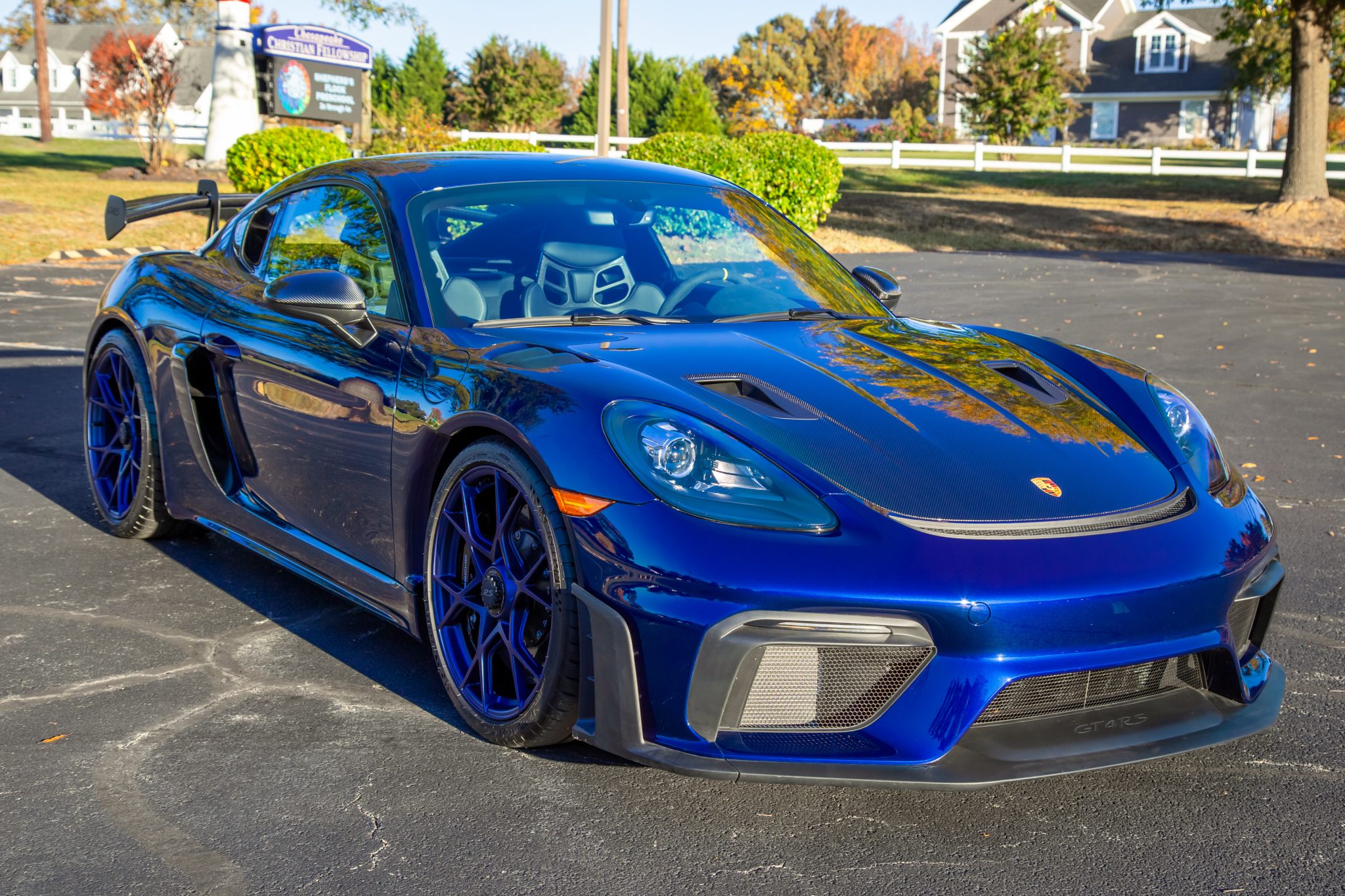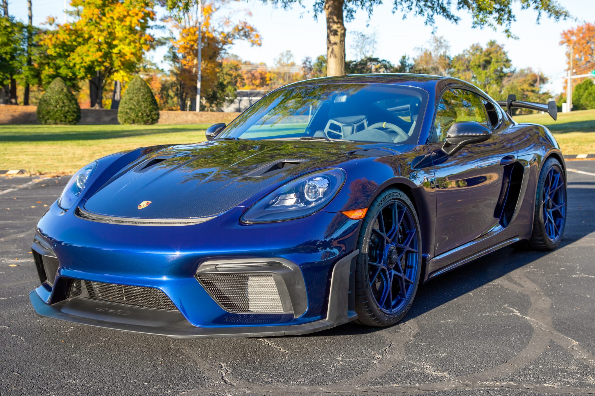 Center-locking 20″ forged aluminum wheels are finished in Satin Indigo Blue and wrapped in 245/35 front and 295/30 rear Michelin Pilot Sport Cup 2 tires. A front-axle lift system was optioned from the factory as well as Porsche Ceramic Composite Brakes (PCCB) featuring high-gloss black Porsche-branded calipers at all four corners.