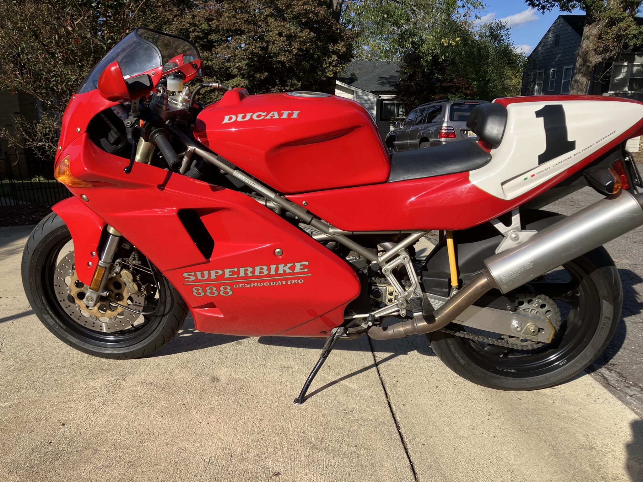 Three-spoke 17″ Brembo wheels are finished in black and were mounted with Pirelli Diablo Rosso tires in 2022. Suspension consists of an inverted fork along with a monoshock attached to the box-section swingarm. Braking is from triple discs with drilled rotors and gold-finished Brembo calipers.