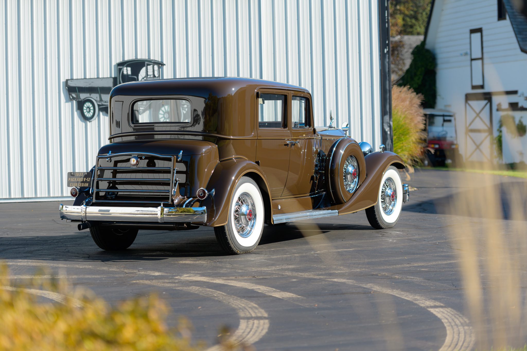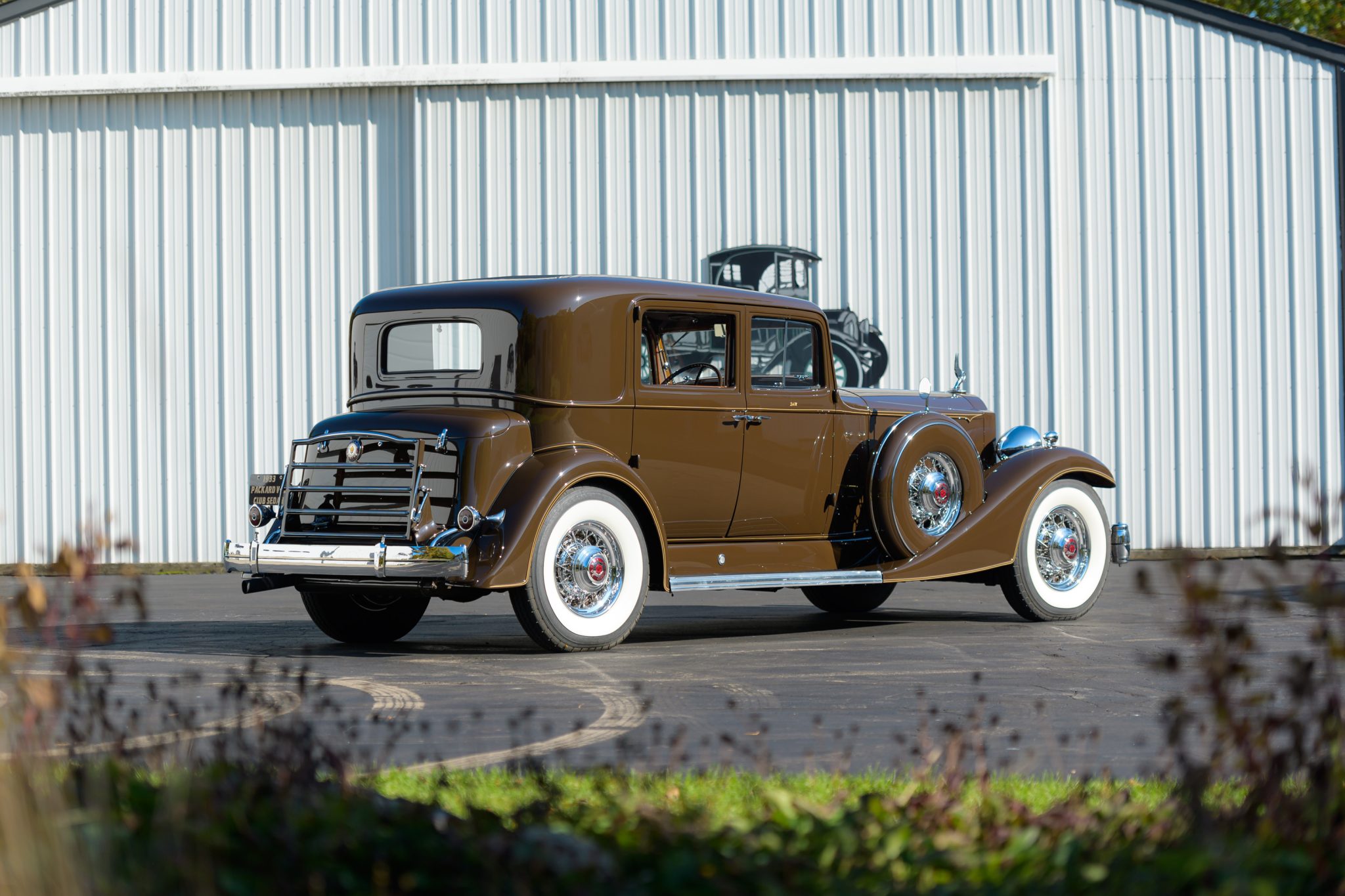 The body is said to have been repainted in black under previous ownership, and was returned to its current shade of brown with cream pinstriping during the refurbishment performed approximately 20 years ago. Features include doors latching at the B pillars, counterweighted bumpers, V-shaped headlight lenses, Trippe driving lights, a body-color radiator shell, thermostatically controlled radiator shutters, a fabric roof panel, and a fold-down rear luggage rack. One of the driving lamps is said to have a burned-out bulb.