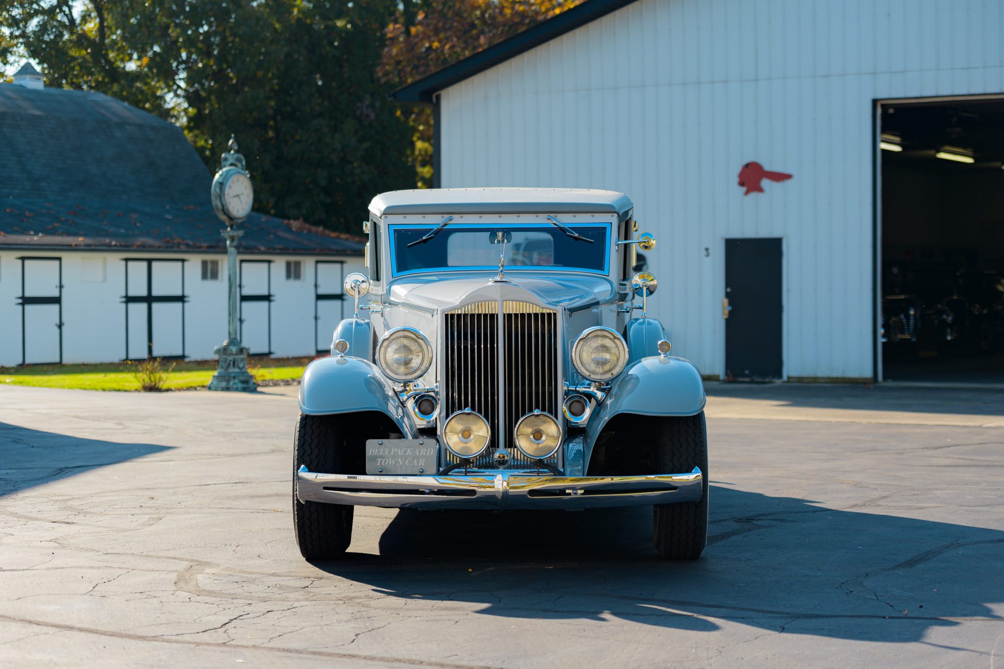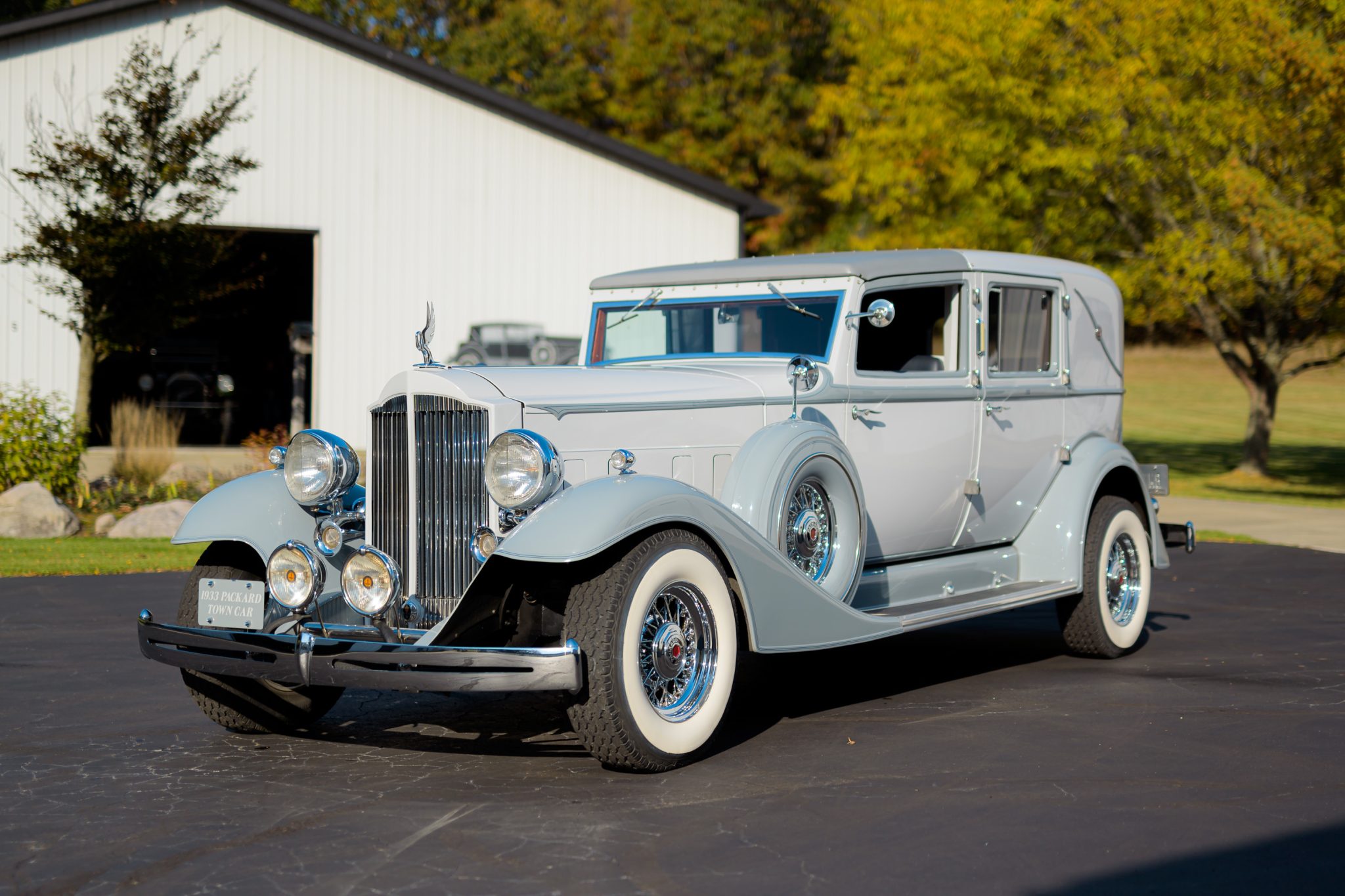 The body is finished in pale gray with darker gray fenders and shoulder-line trim accented by blue pinstriping. Features include rear-hinged doors with stainless-steel hinge hardware, a body-color radiator shell, headlights with V-shaped lenses, Trippe-style driving lights, a cormorant radiator mascot, a removable front roof panel trimmed in gray, a driver-side mirror, simulated landau bars, and a fixed rear luggage rack and trunk assembly.