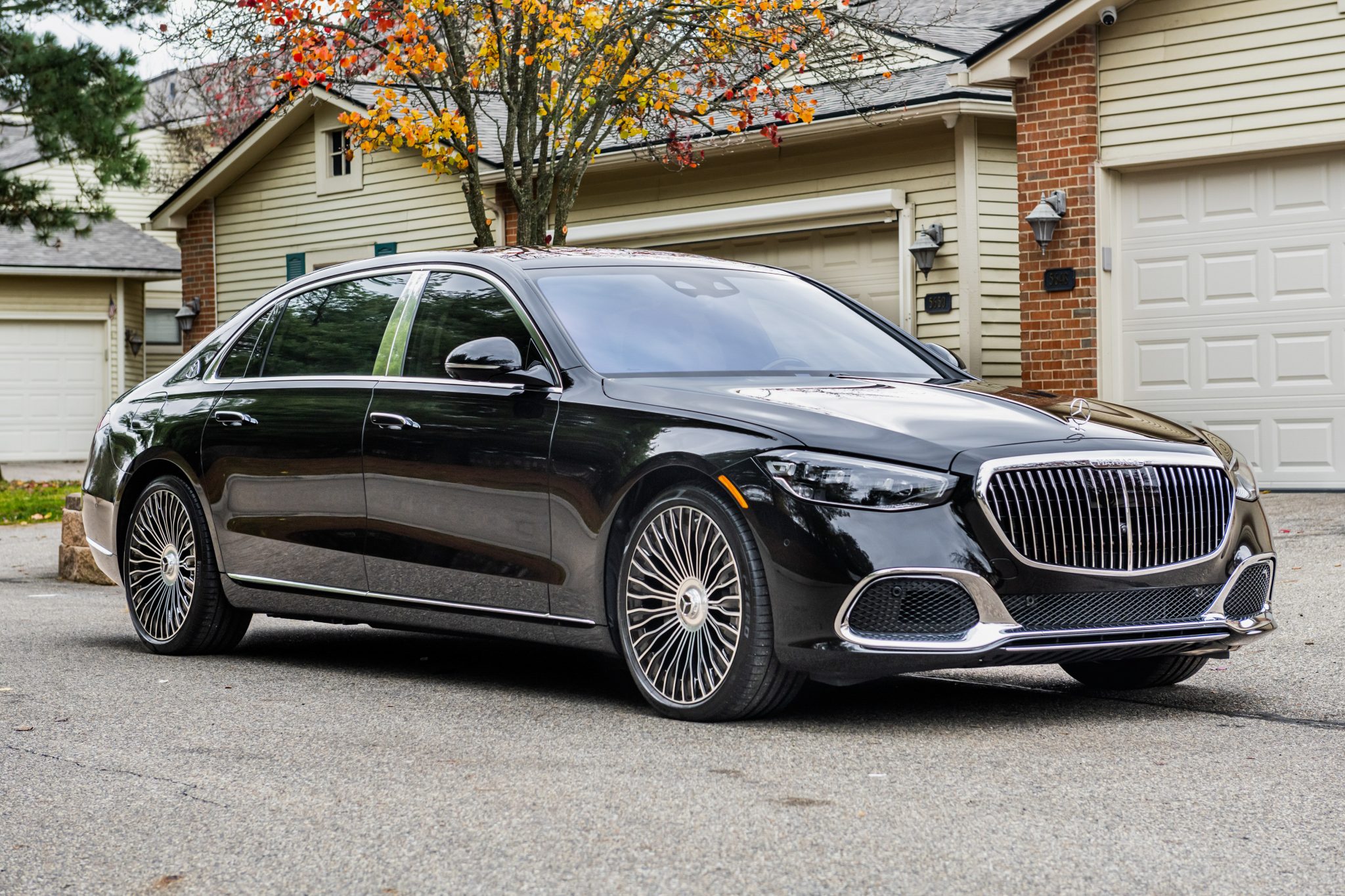 Multi-spoke 21″ Maybach wheels have been installed and are mounted with 265/35 Pirelli P Zero tires. The car was optioned with rear-axle steering, and standard equipment included Airmatic air suspension and adaptive braking technology.