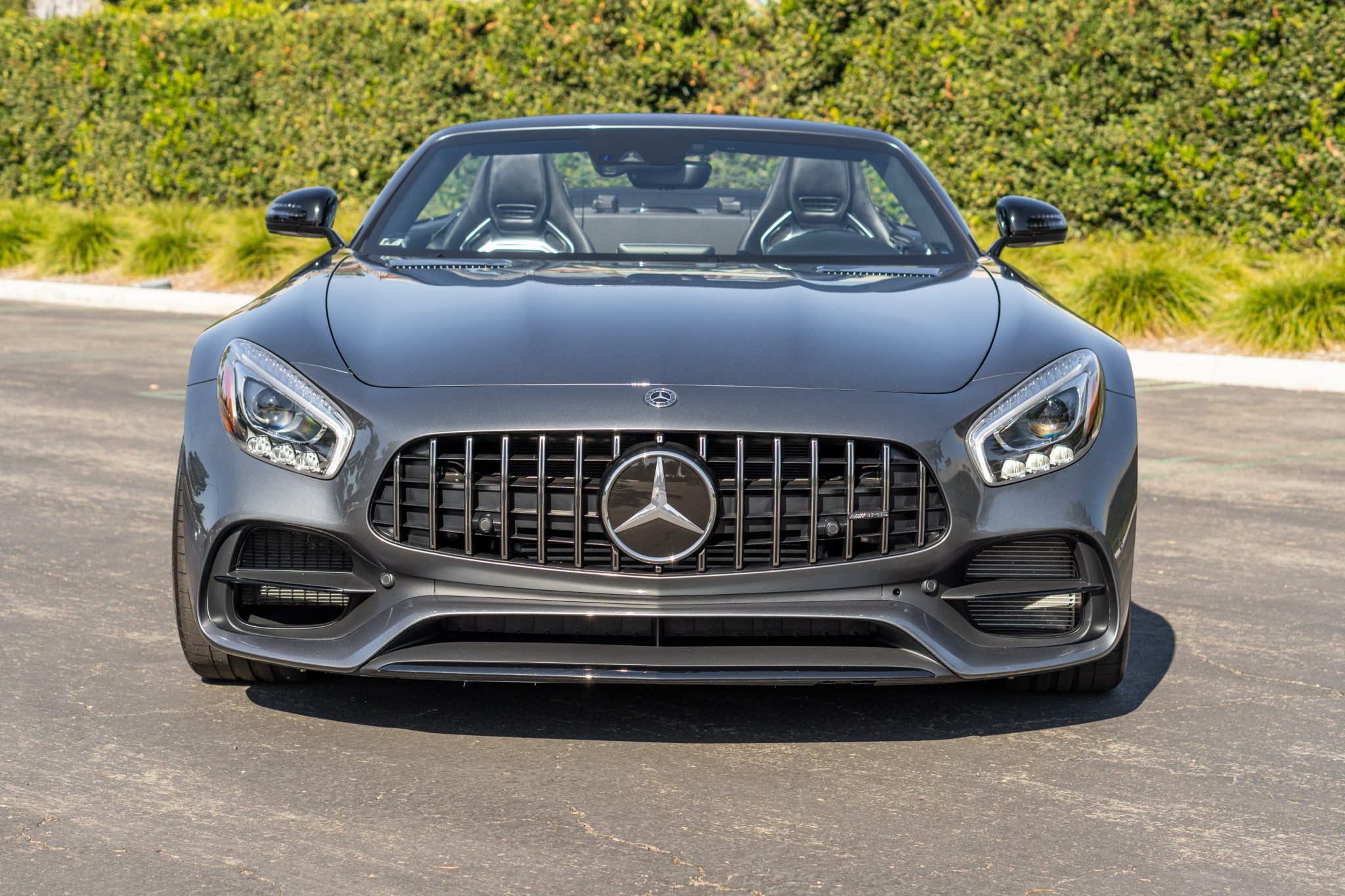 The 19″ and 20″ AMG cross-spoke forged wheels are mounted with Continental tires showing 2021 date codes. Silver-finished calipers are fitted over cross-drilled and slotted discs at all four corners. The car came equipped from the factory with an AMG Ride Control adaptive suspension with driver-selectable modes. Curb damage is located on the left-rear wheel.