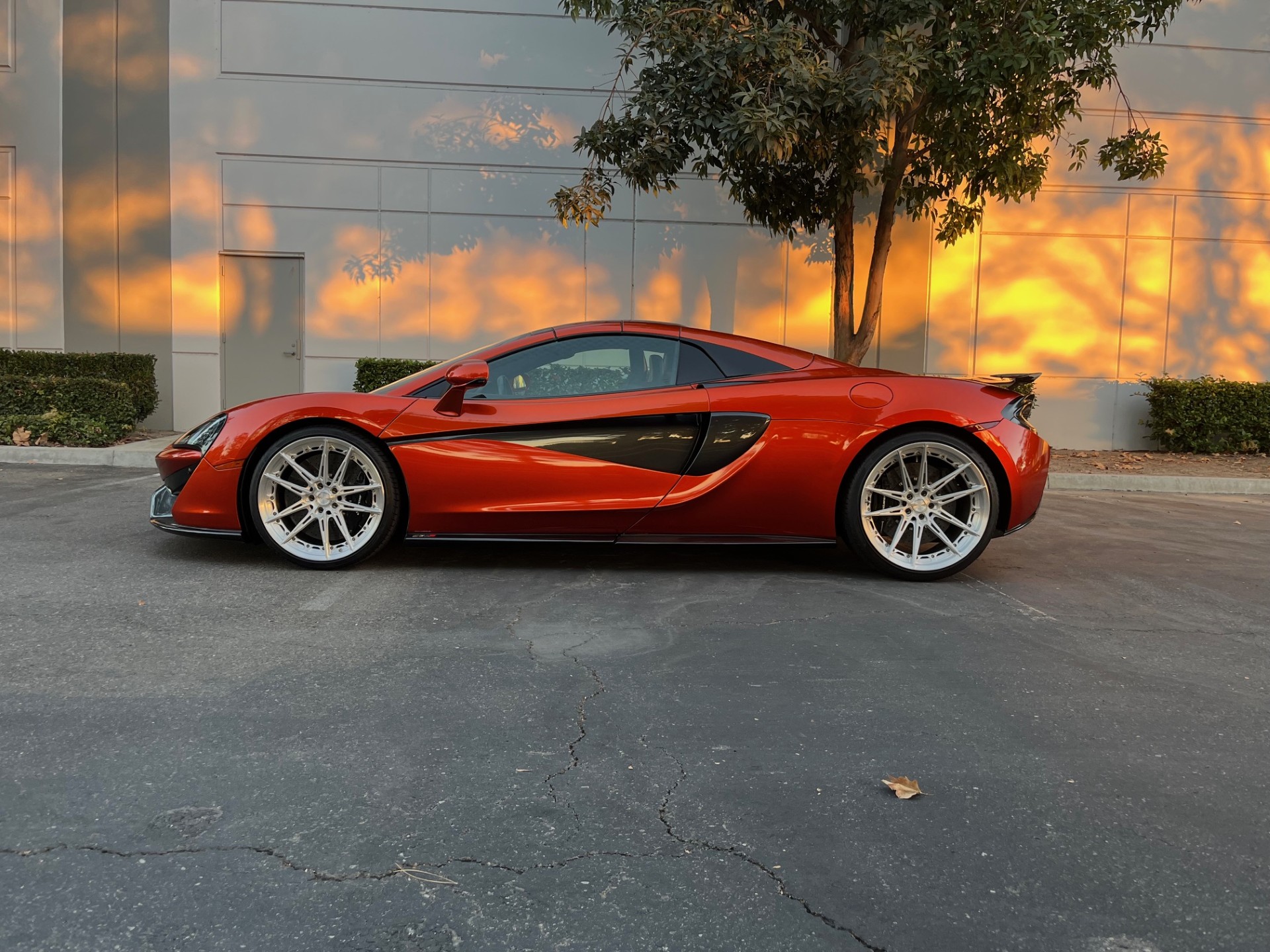 Aftermarket 20″ and 21″ multi-spoke wheels are mounted with Pirelli P Zero tires, and a spare set of wheels and tires is included in the sale. The vehicle is equipped with an active damping suspension, and stopping power is provided by black-finished McLaren-branded calipers over carbon-ceramic rotors at each corner.