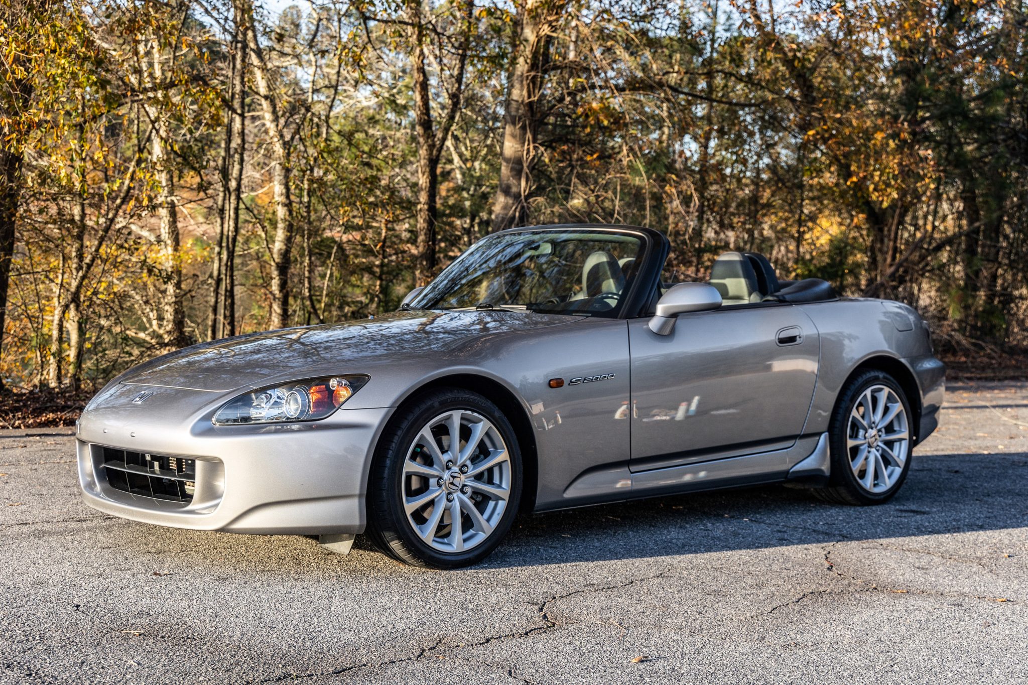 The 17″ 10-spoke wheels have curb damage and are mounted with Velozza tires. The car features double-wishbone suspension and four-wheel disc brakes.