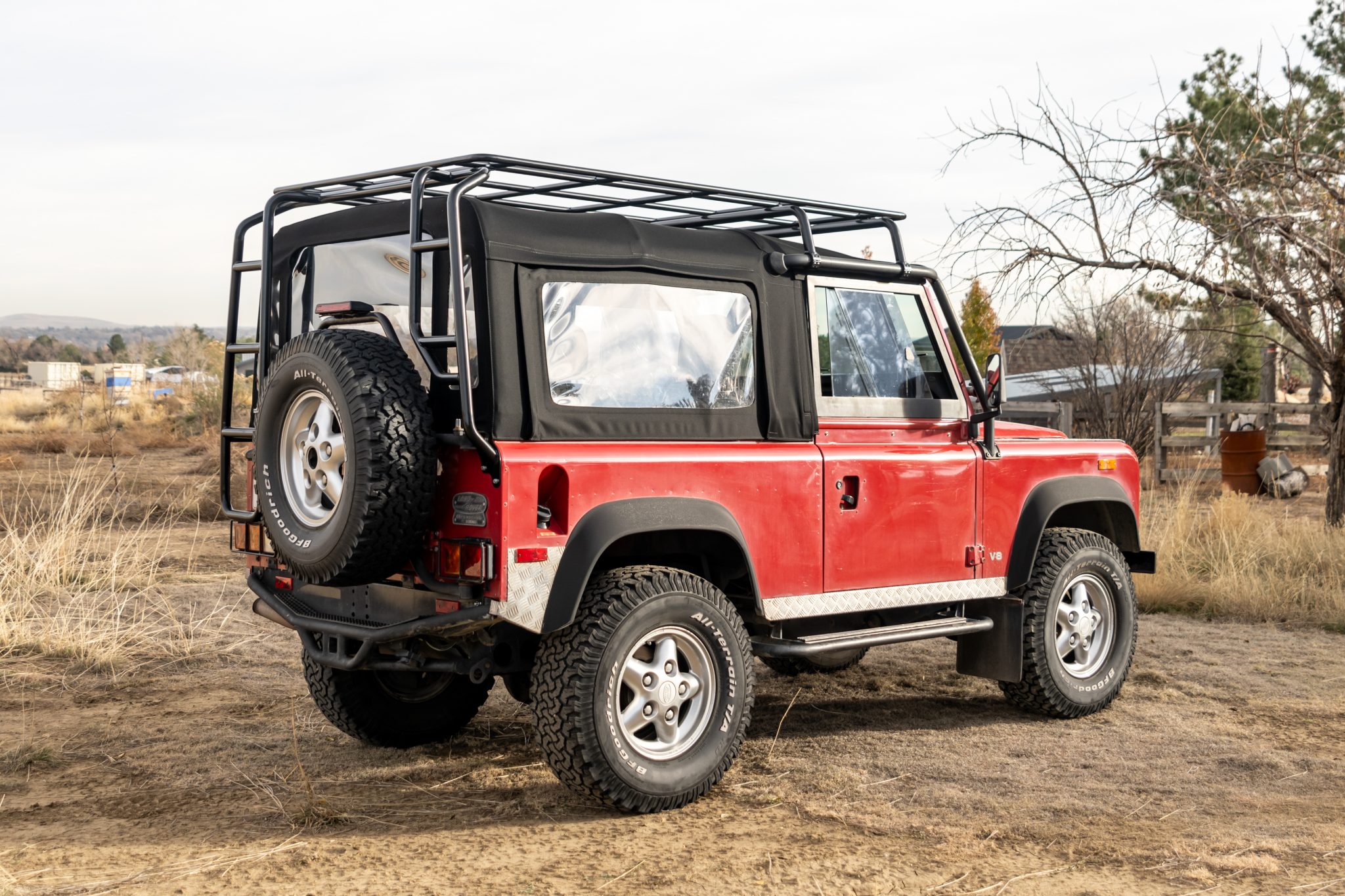 The 16″ five-spoke wheels are mounted with BFGoodrich All-Terrain T/A KO tires measuring 285/75. A matching spare is secured to a swing-out carrier at the rear. Stopping power is provided by power-assisted discs at all four corners.