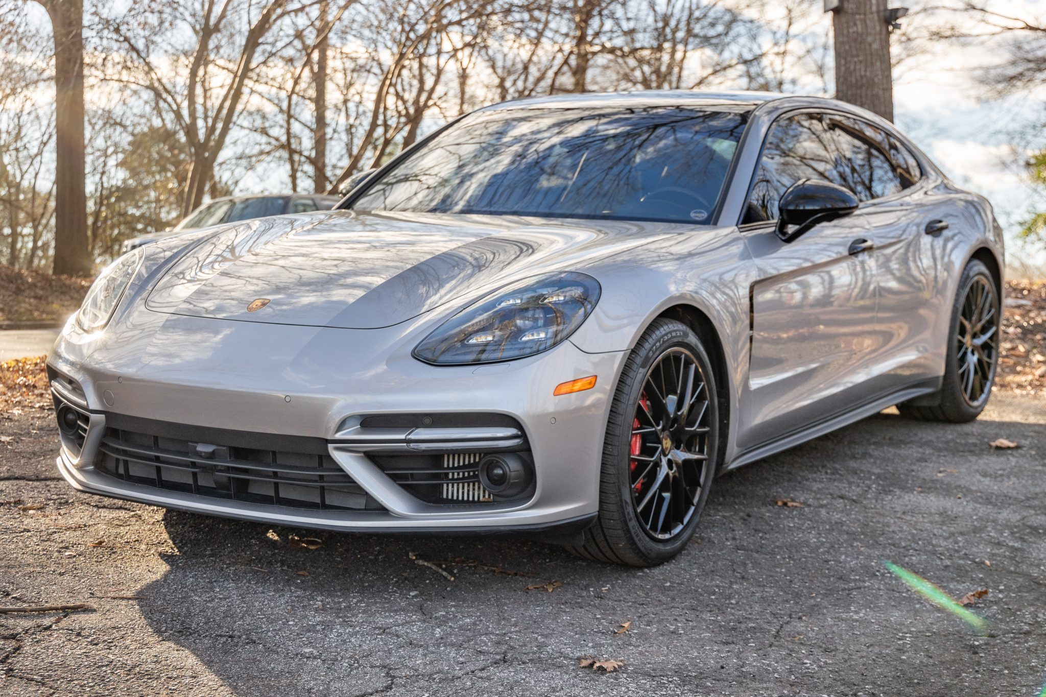 The 21″ SportDesign alloy wheels are finished in gloss black, and they were mounted with 275/35 front and 315/30 rear Pirelli Cinturato P7 tires in May 2023. An adaptive air suspension with Porsche Active Suspension Management (PASM) came standard on Turbo models, and braking is handled by red-finished Porsche-branded calipers fitted over slotted rotors. The front brake rotors were replaced in October 2022 along with the brake pads at each corner.