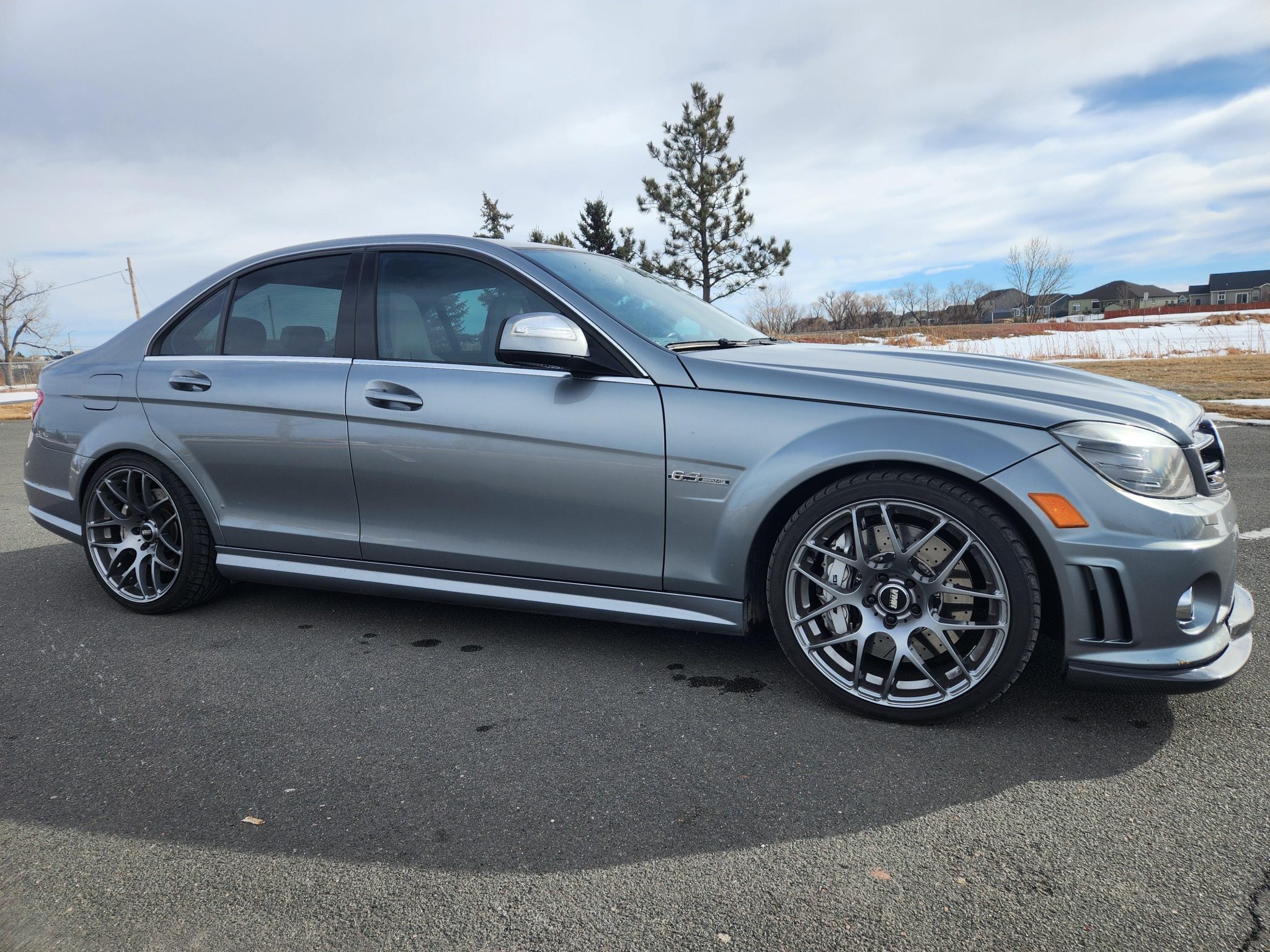 Gray-finished 19″ VMR wheels are mounted with 235/35 front and 275/30 rear Ohtsu FP800 tires. The C63 AMG features a revised front suspension with a widened front track compared to the standard C-Class as well as an Electronic Stability Program (ESP). Coilovers have been fitted, and braking is handled by silver-finished AMG-branded six- and four-piston calipers over drilled and slotted rotors.