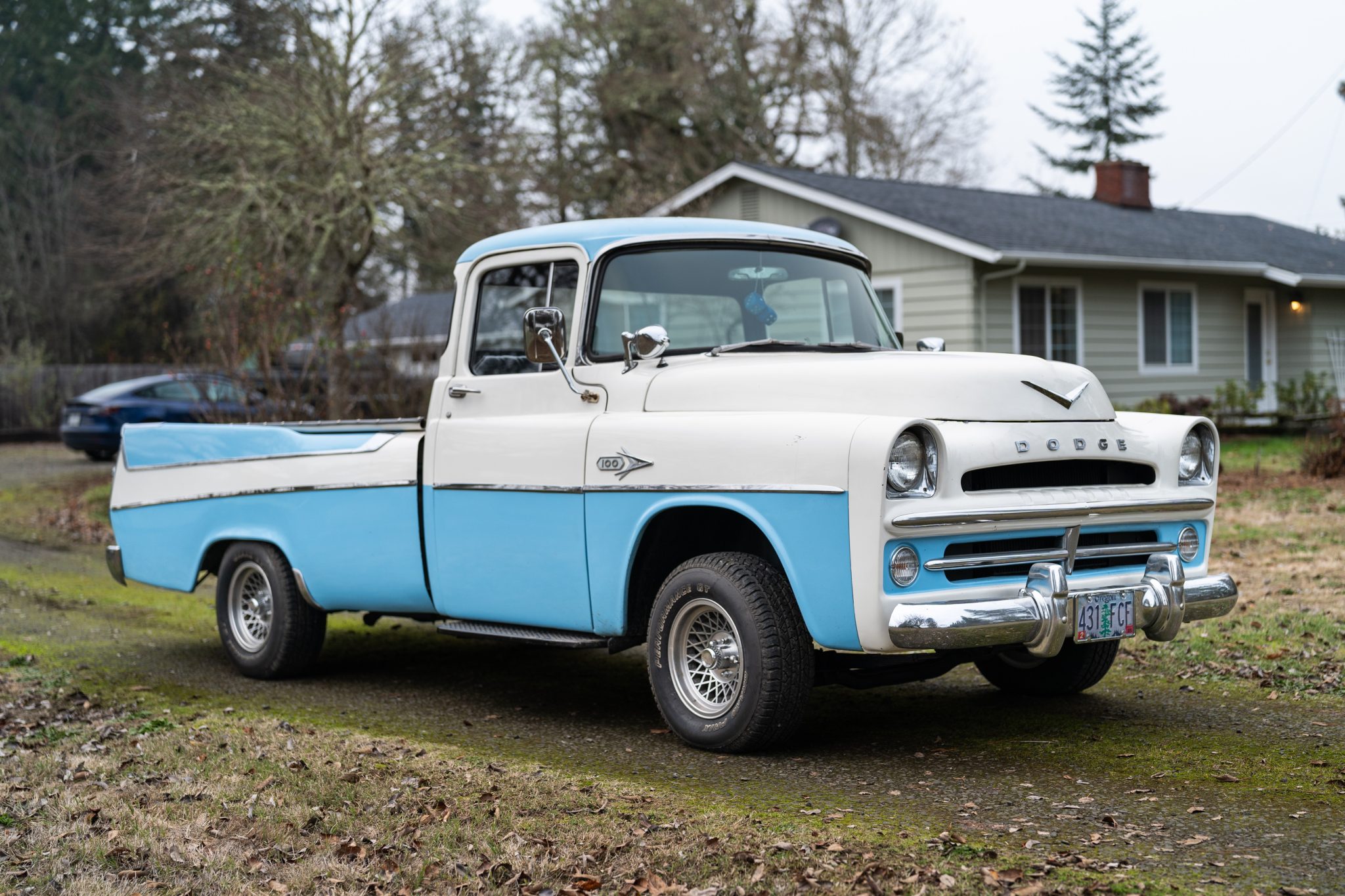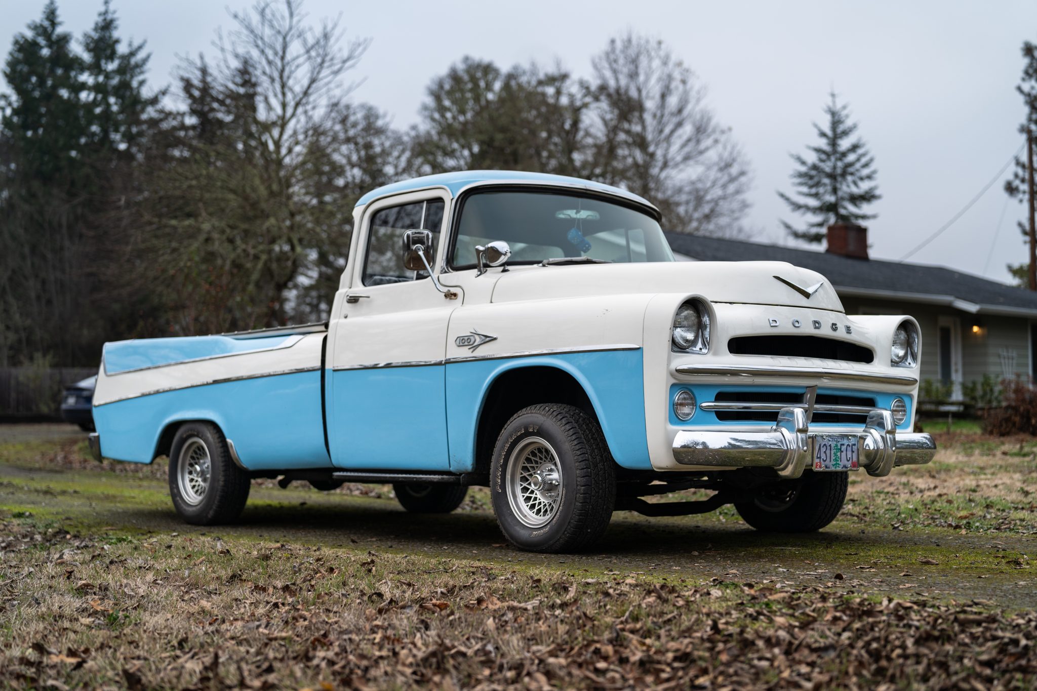 This truck was repainted in two-tone blue and white under prior ownership. Other features include a chrome front bumper and grille sections, A-pillar-mounted spotlights, dual side mirrors, quarter-panel stone guards, a black tonneau cover, and wood-slat bed flooring with bright trim strips. The seller notes pitted chrome as well as chips, scratches, and cracks in the paint.