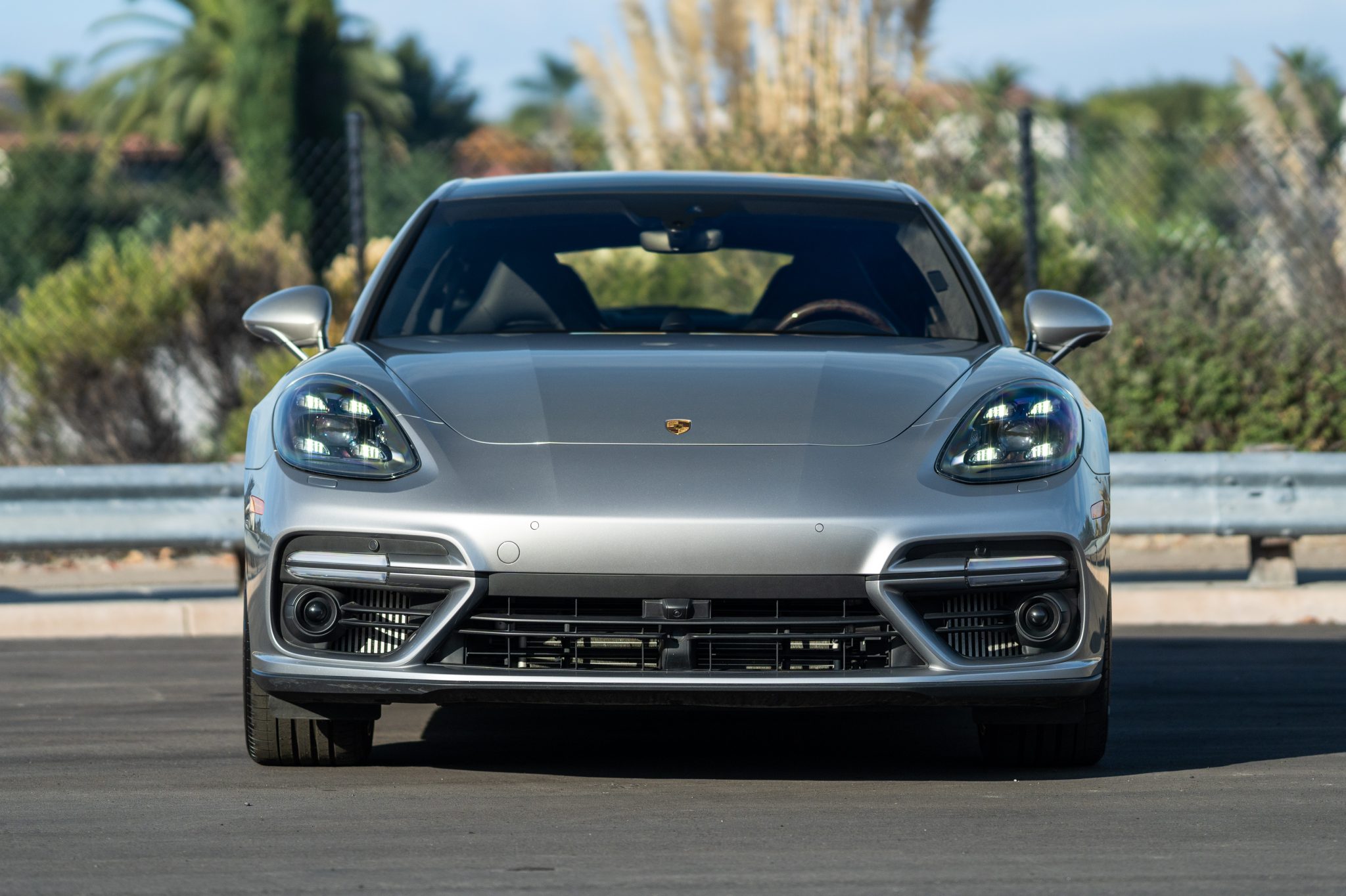 Optional 21″ SportDesign alloy wheels finished in Platinum Silver are mounted with Pirelli P Zero tires. The car is equipped with rear-axle steering, Power Steering Plus, and an adaptive air suspension that includes Porsche Active Suspension Management (PASM) and optional Porsche Dynamic Chassis Control Sport (PDCC Sport). Stopping power is provided by Porsche Ceramic-Composite Brakes (PCCB).