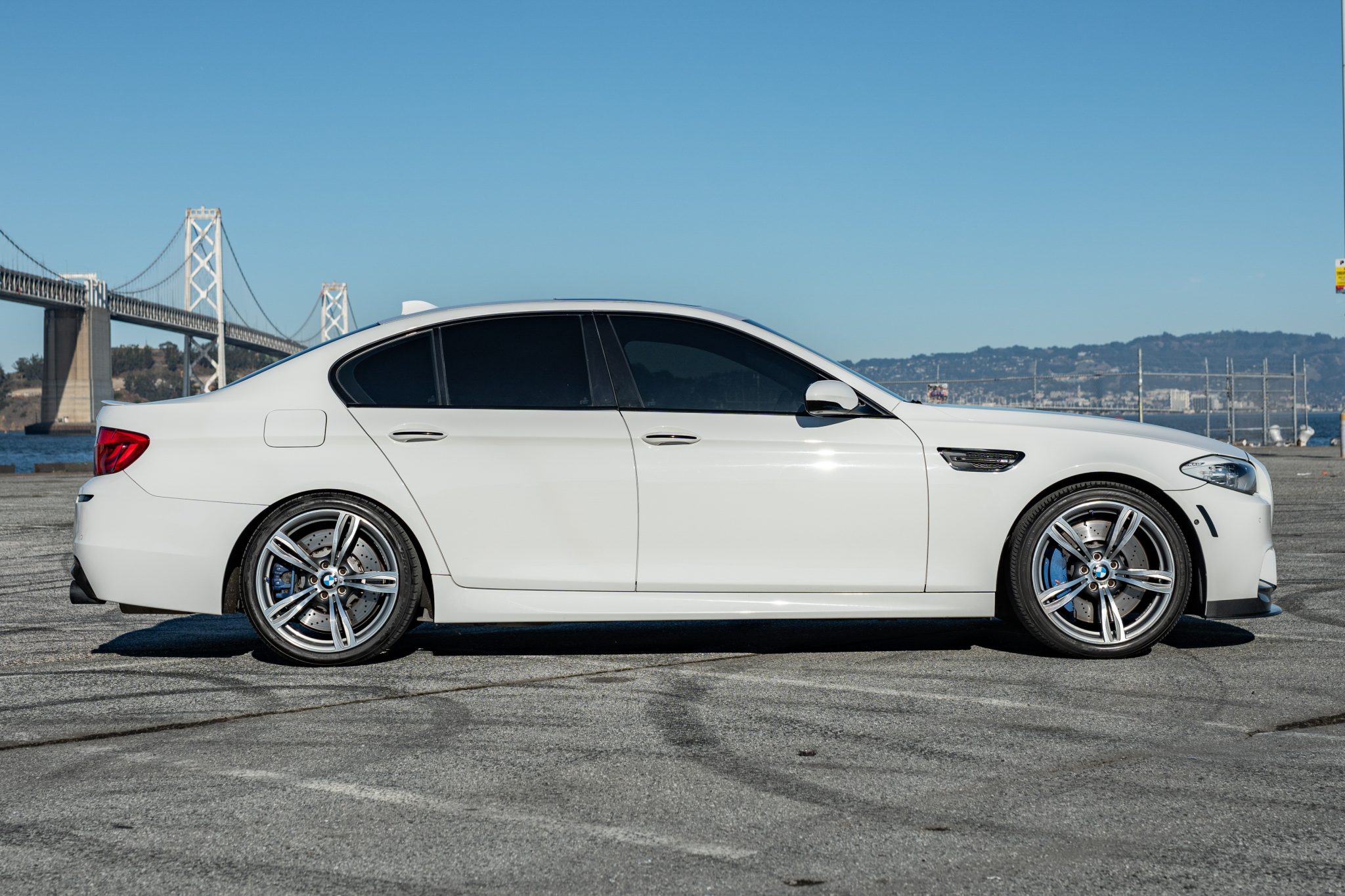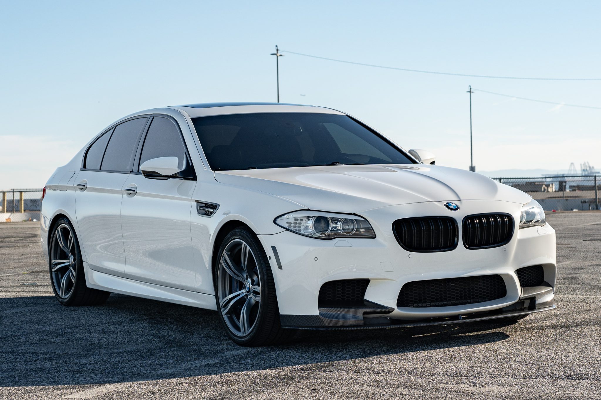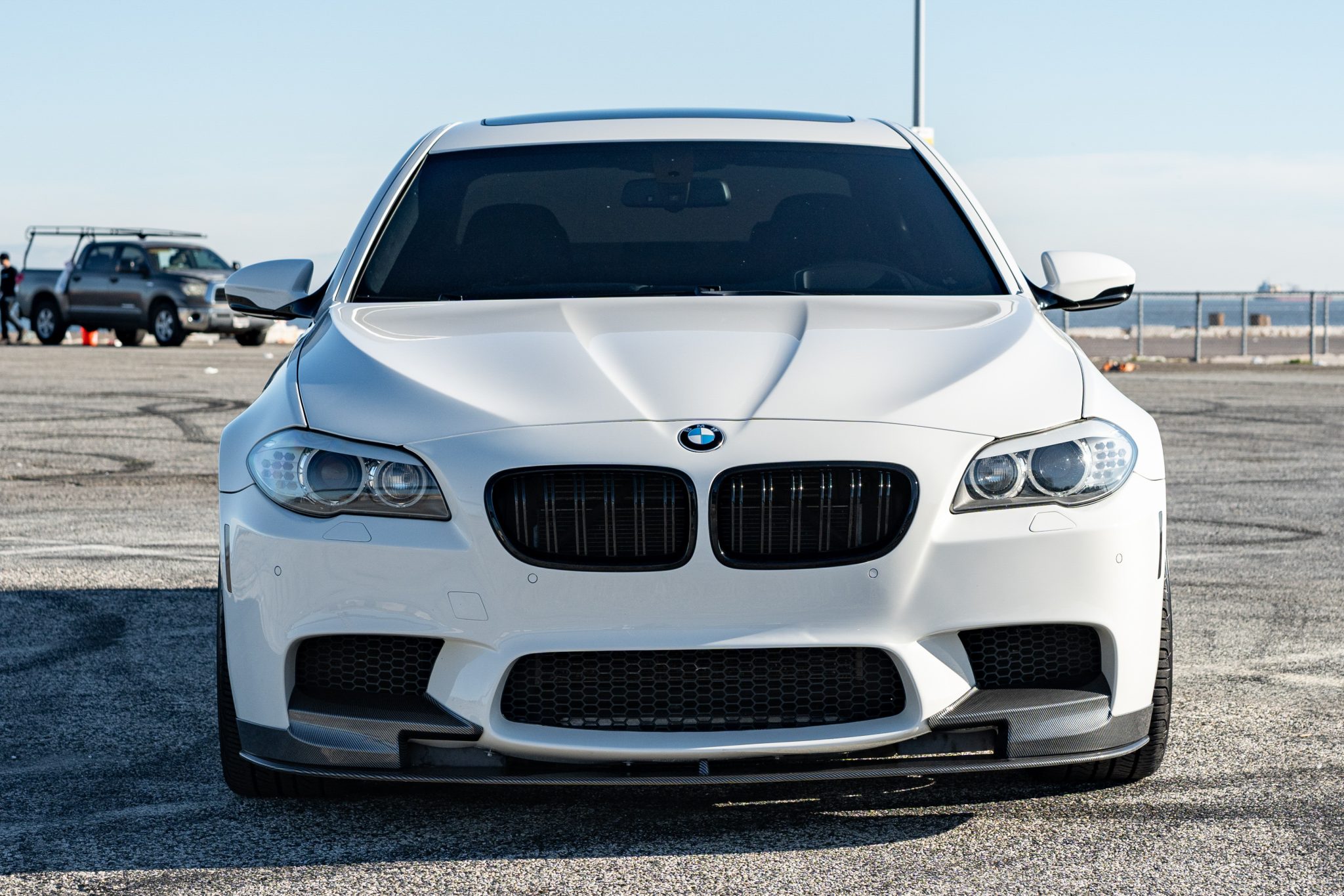 The 20″ Style 343M alloy wheels are mounted with Yokohama front and Toyo rear tires. Braking is handled by blue M-branded calipers over cross-drilled and ventilated rotors at each corner. Curb marks and blemishes are visible on the wheels.
