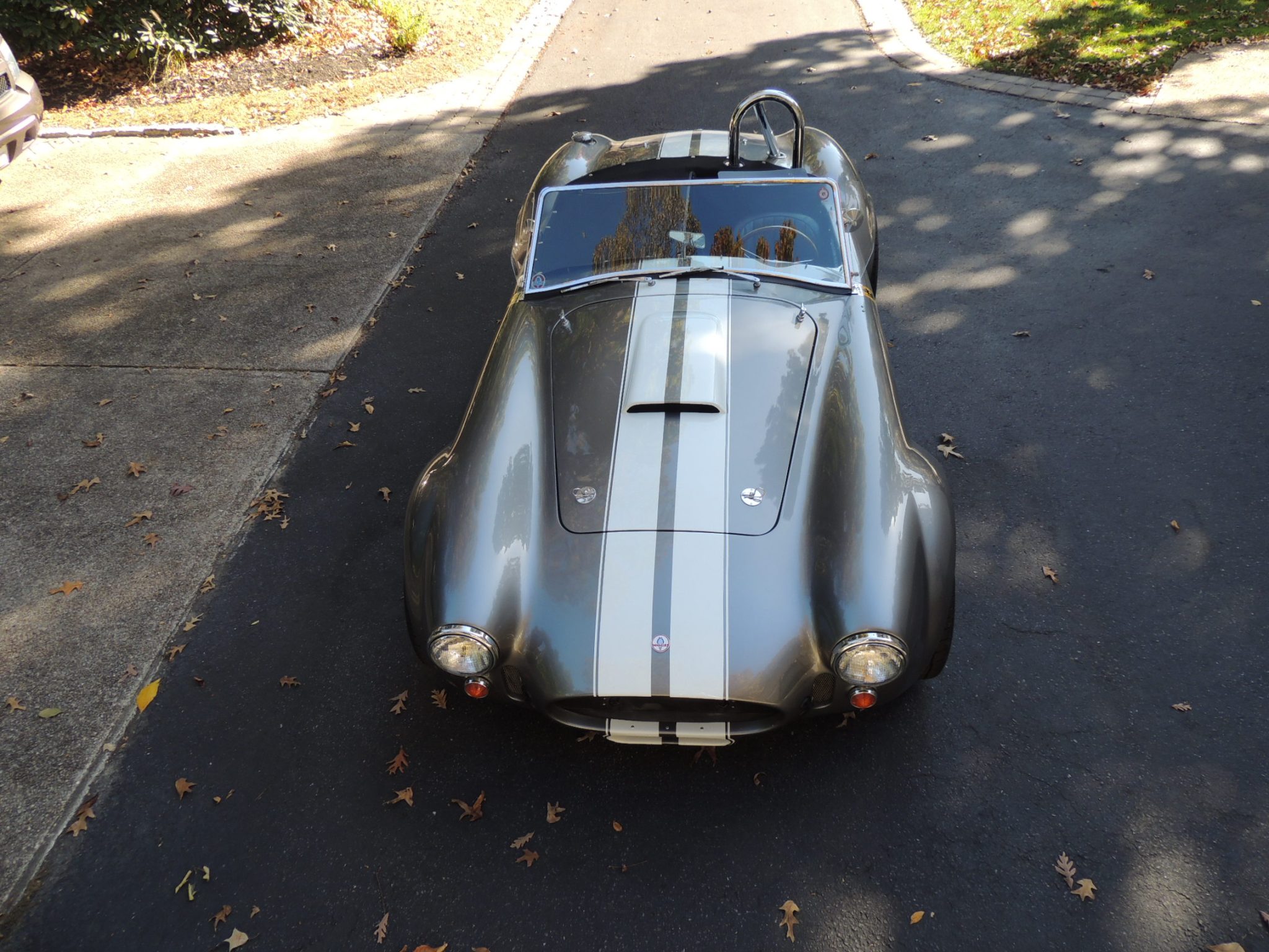 The 17″ Shelby American Racing wheels are secured with safety-wired three-eared knock-off spinners and wear staggered-width Nitto NT555 G2 tires showing 2023 date codes. The car is equipped with electric power-assisted rack-and-pinion steering and rides on coilover suspension at the front, while air shock absorbers are mounted at the rear. Braking is provided by four-wheel discs.