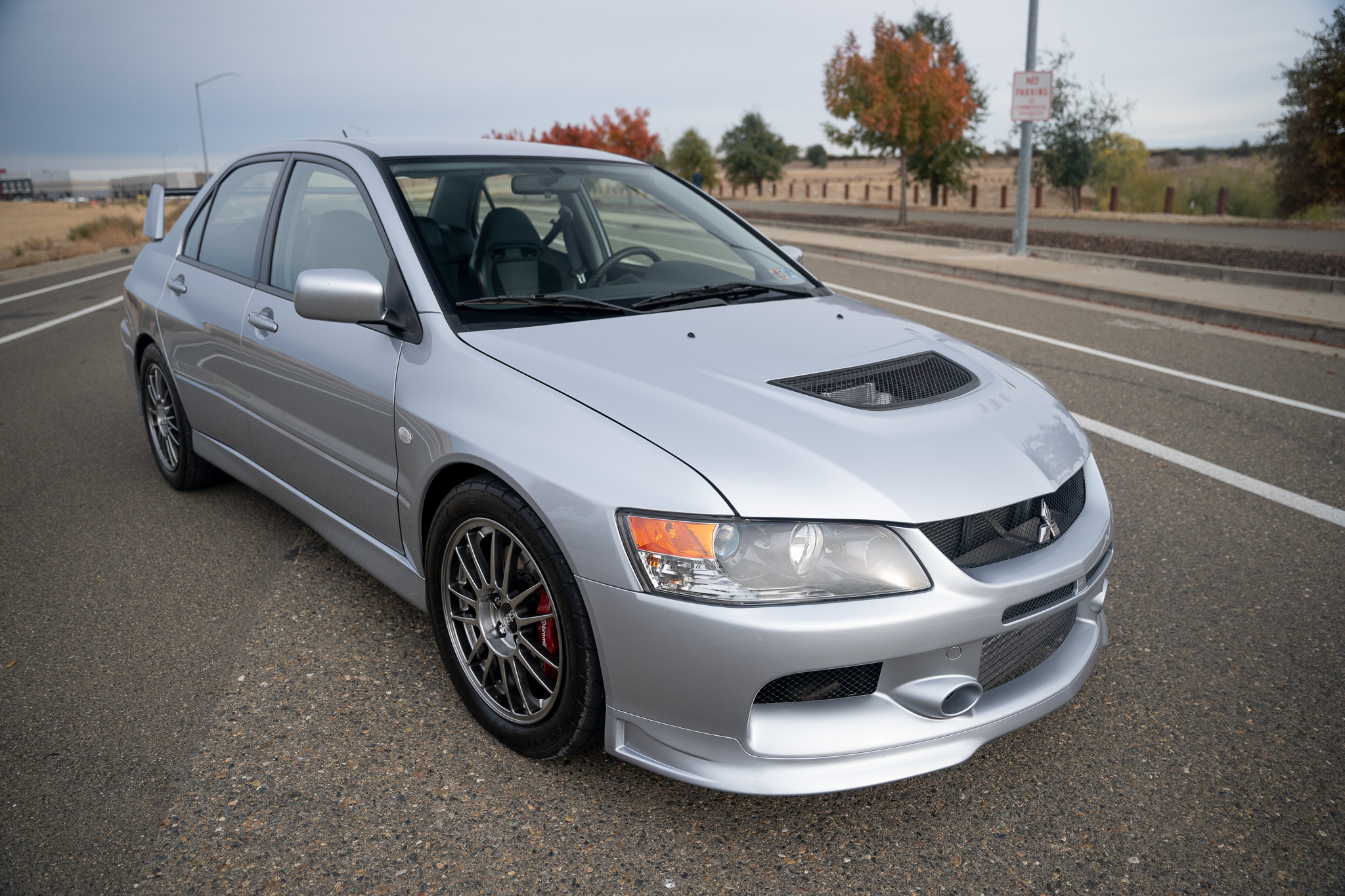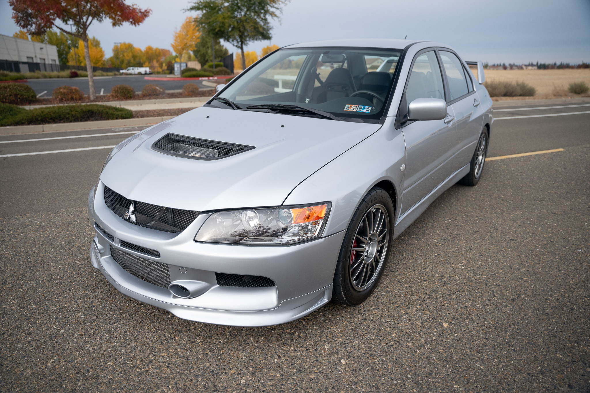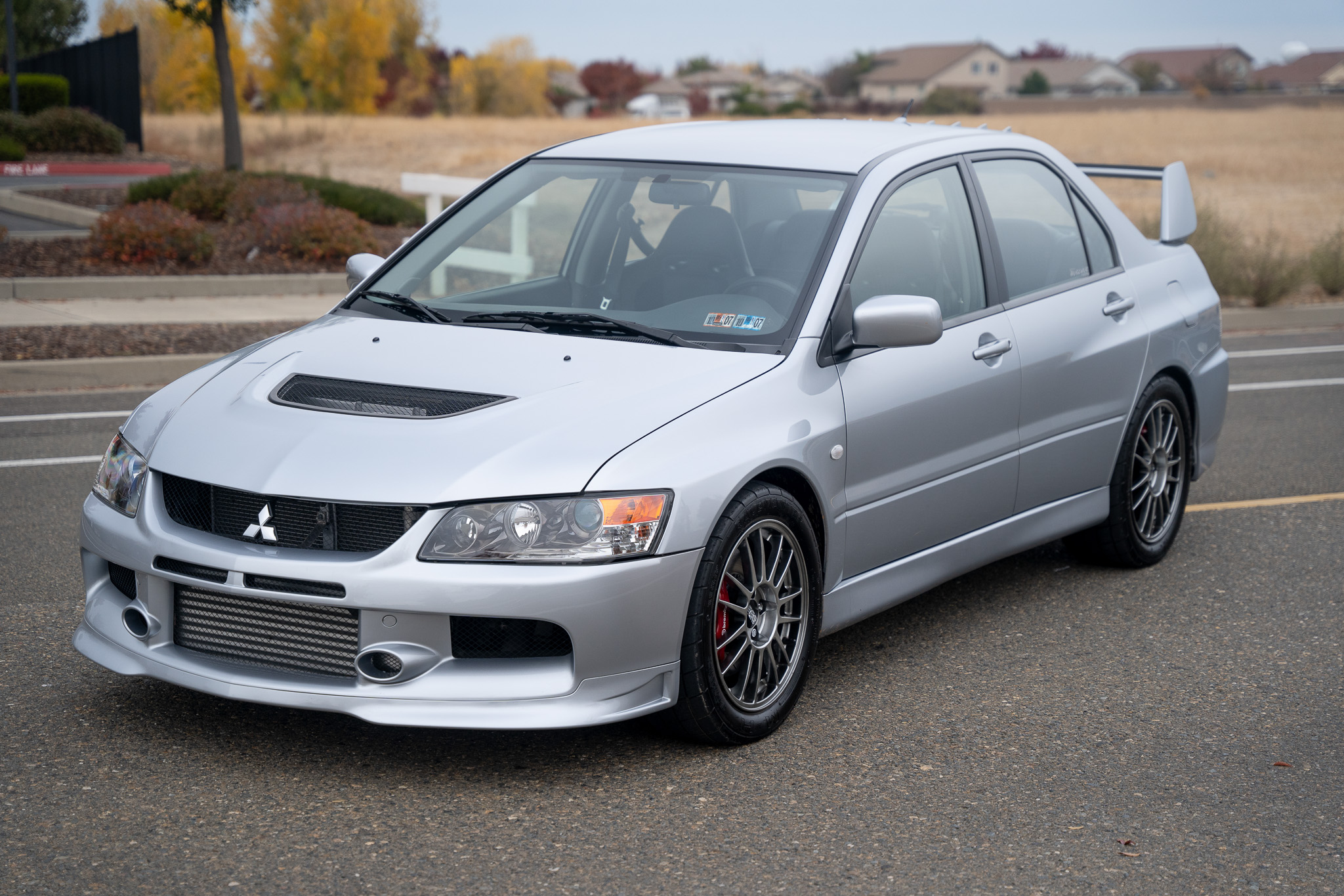 Diamond-Black 17″ BBS forged alloy wheels are mounted with 245/45 Racemaster M/H tires. The suspension has been modified with A’PEXi EXV N1 coilovers, and the brake system has red-finished Brembo calipers, Hawk pads, two-piece slotted Girodisc rotors, and Russell Performance braided stainless-steel lines.