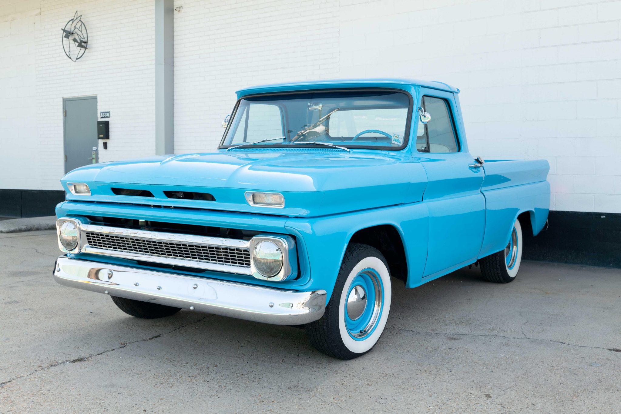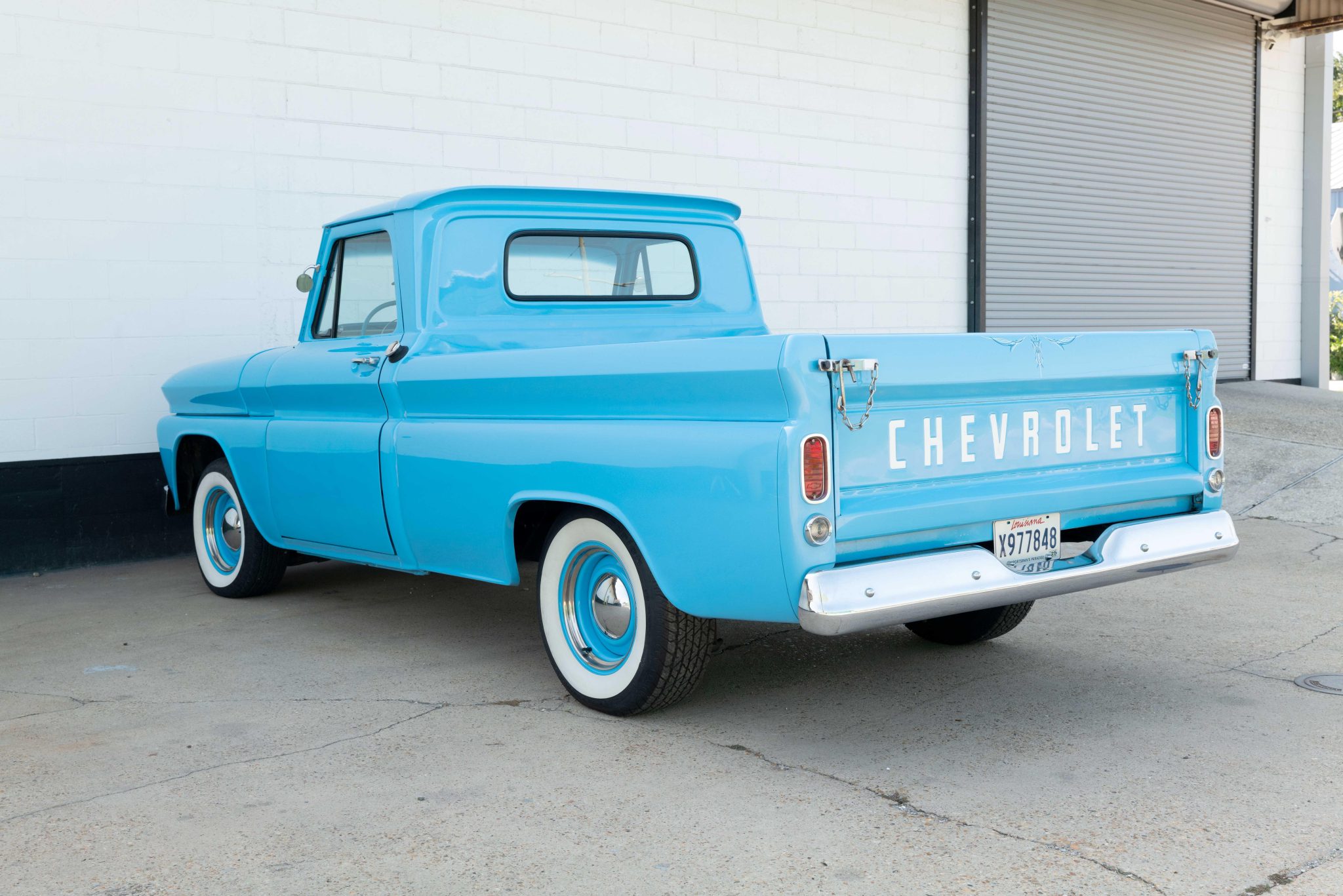 Body-color 15″ steel wheels feature polished hubcaps and are mounted with 215/70 BFGoodrich Silvertown Radial whitewall tires. The truck has been fitted with an air suspension and power steering, and braking is handled by front discs and rear drums.