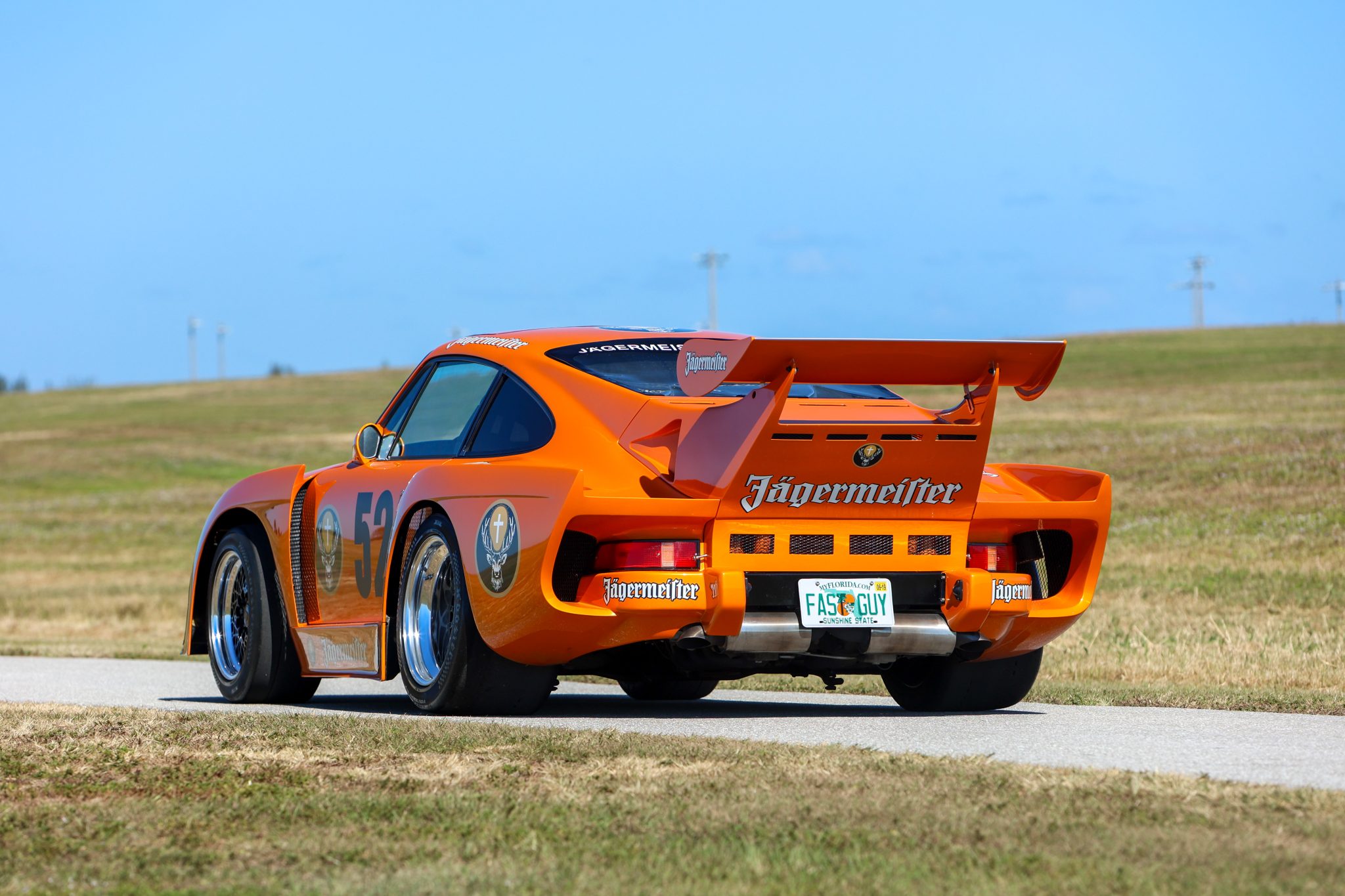 This example was previously finished in white and was painted pearl orange under current ownership, at which time Deutsche Rennsport Meisterschaft-style #52 Jägermeister/Kremer Racing livery was added. The K3-style DP bodywork features slant-nose front fenders, headlights mounted behind plexiglass, widened fenders with brake vents, flush-mount side mirrors, NACA ducts, a rear wing, and taillights.