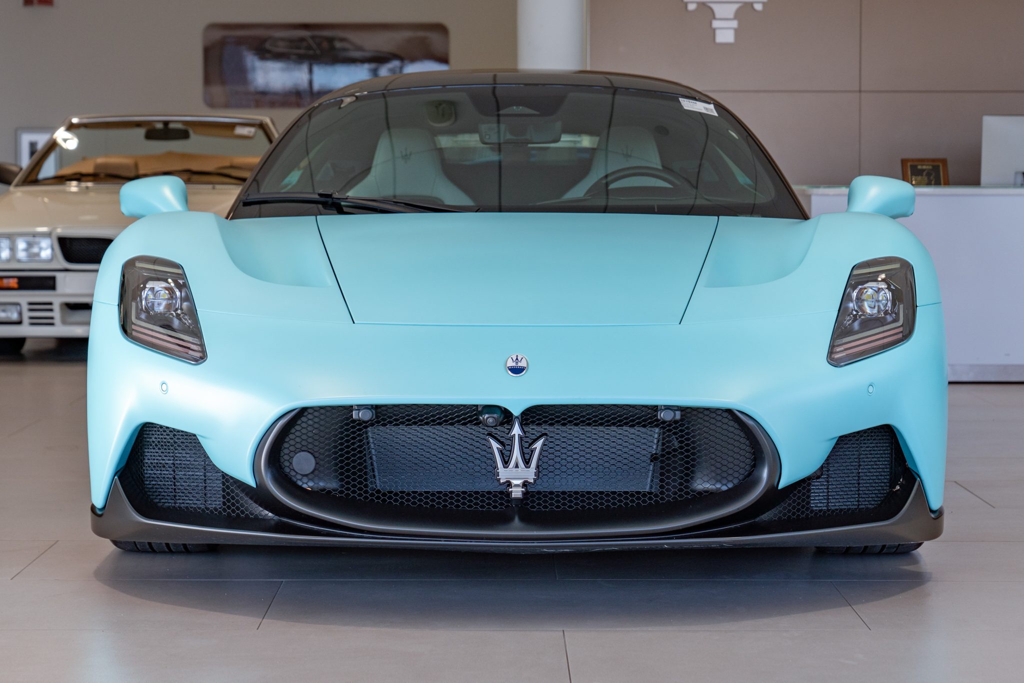 The 20″ Corsa Design forged wheels are finished in Matte Dark Miron and are mounted with 245/35 front and 305/30 rear Bridgestone Potenza Sport tires. Braking is handled by black-painted calipers fitted over ventilated and cross-drilled rotors at each corner. The car is equipped with launch control, a suspension lift system, and a double-wishbone suspension that utilizes active dampers.