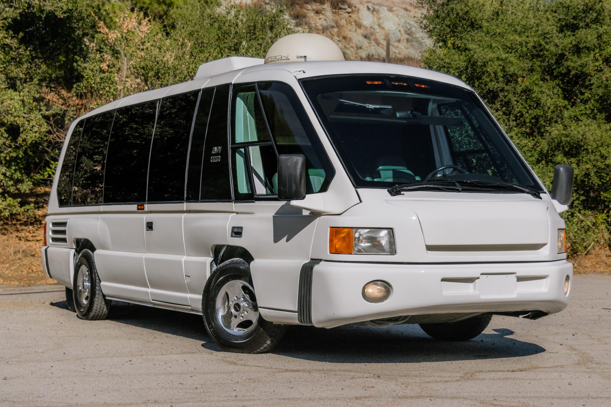 There is also a passenger-side rear entry door along with a rear liftgate for accessing the cargo compartment, tinted glass, an external utility hookup, heated and power-adjustable mirrors, and a rear air conditioning unit and satellite TV receiver mounted to the roof. The generator housed in the vented rear compartment does not work, and the selling dealer notes paint imperfections that can be viewed in the gallery below.