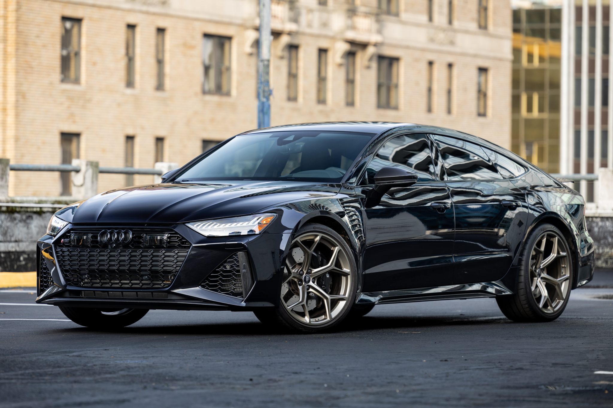 Matte Neodymium Gold-finished 22″ Y-spoke wheels are mounted with Continental SportContact tires measuring 285/30. The car is equipped with rear-axle steering and an RS-tuned suspension with Dynamic Ride Control. Braking is handled by black-finished RS-logo calipers mounted over cross-drilled and ventilated rotors that measure 16.5″ up front and 14.6″ out back.
