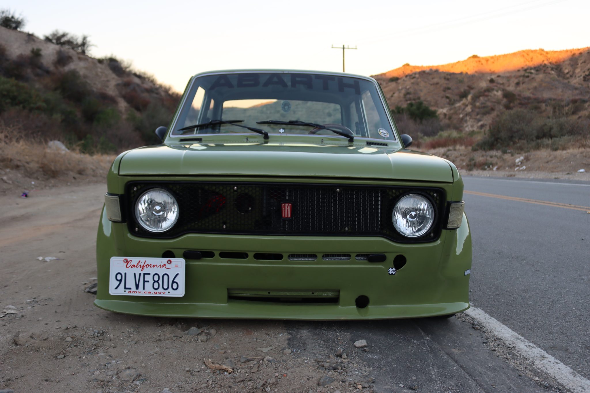 Minilite-style 14″ wheels feature gray centers with Abarth-branded caps and are wrapped in 205/30 tires. The suspension and braking system was overhauled as part of the refurbishment, per the seller.