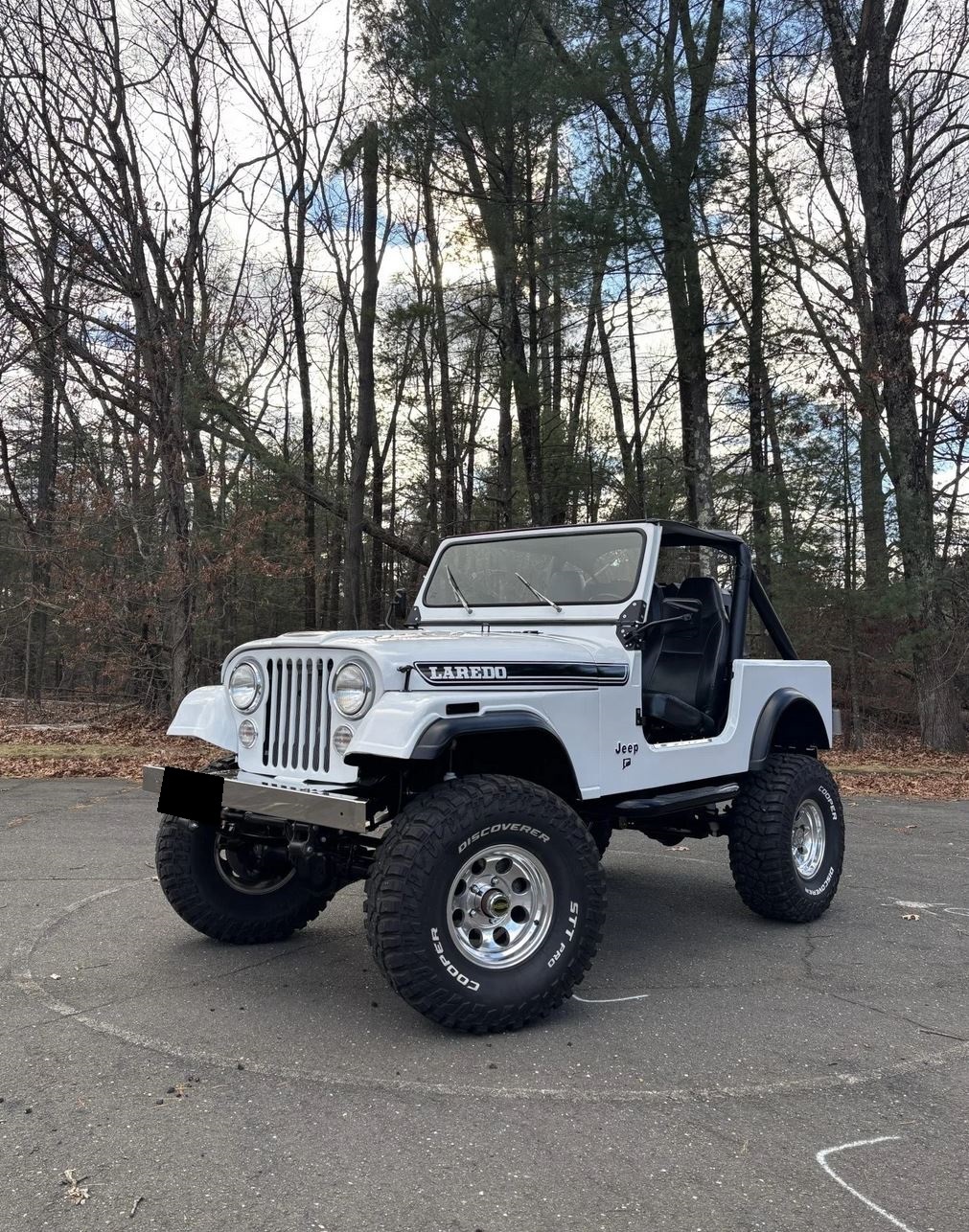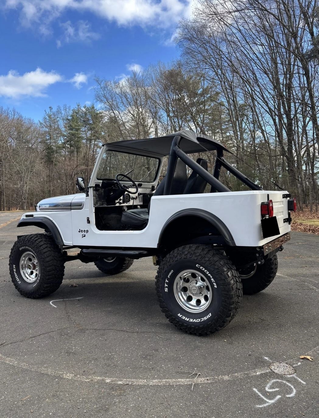 Polished 15″ Pro Comp wheels are mounted with 35×12.5″ Cooper Discoverer STT Pro tires. The Jeep is equipped with manually locking front hubs, power steering, an SPOA suspension lift, and a YJ steering box and springs. Braking is handled by power-assisted front discs and rear drums. The seller states that a high-steer kit was installed along with replacement shock absorbers under previous ownership.