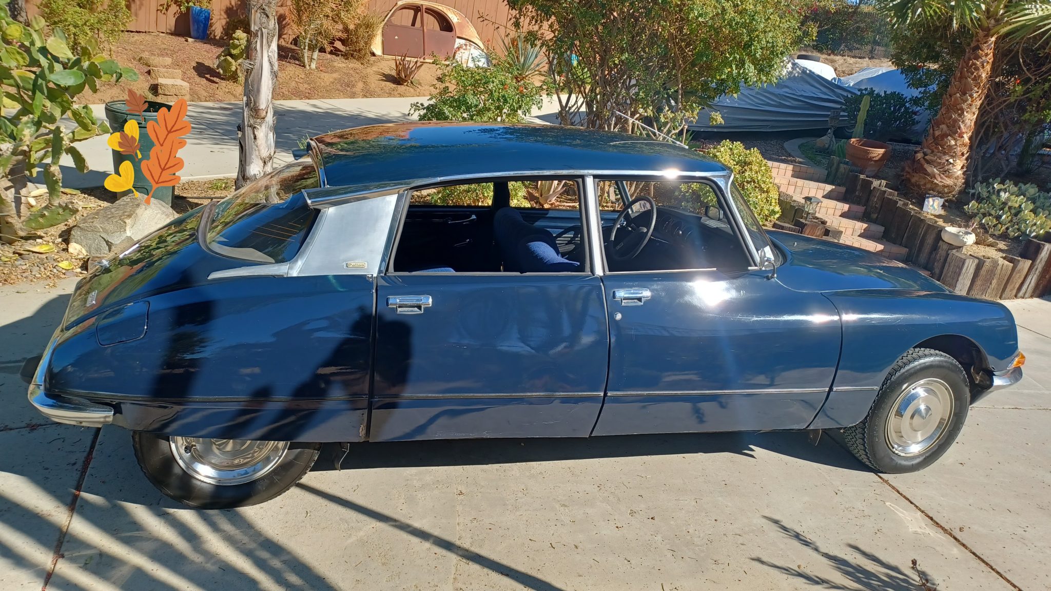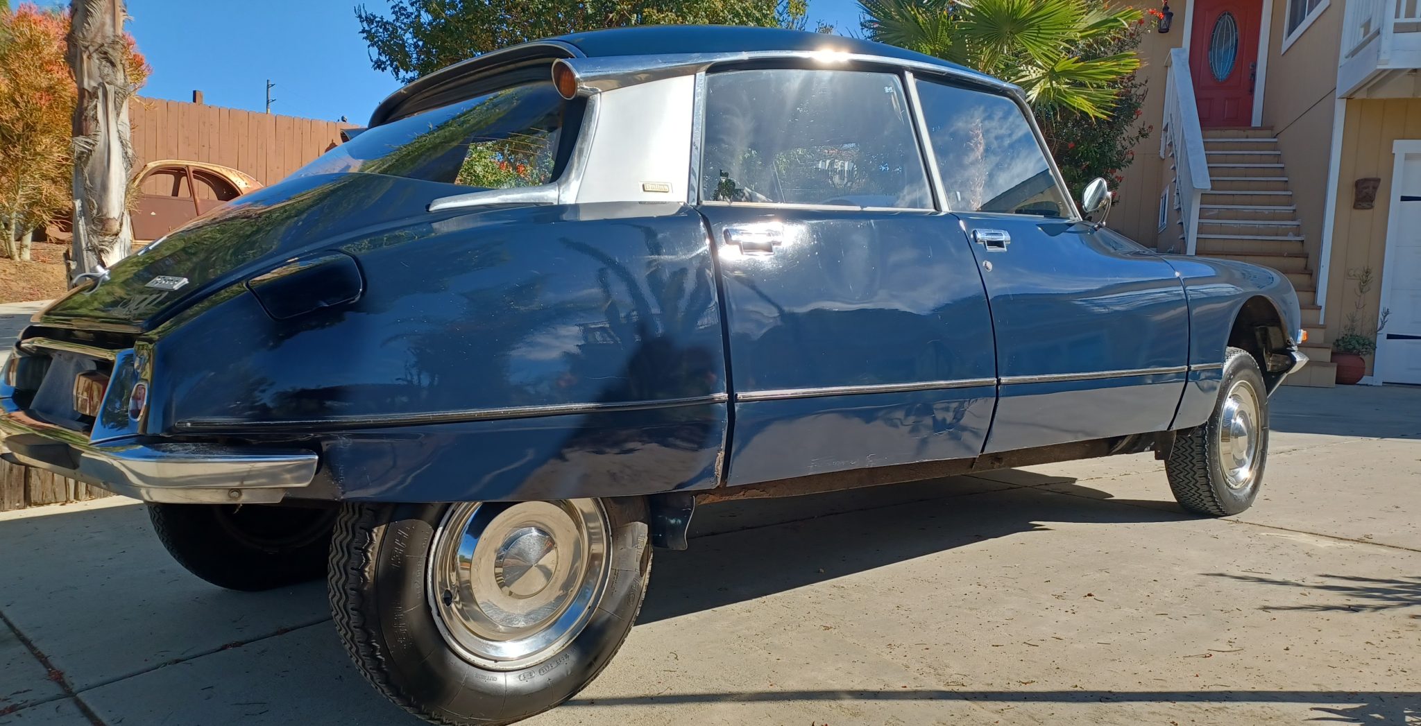 Ivory-finished 15″ steel wheels wearing polished covers are mounted with older 185/80 Retro RC-001 tires, and a spare with a Nexen tire is stored under the hood ahead of the engine. The hydropneumatic system serves the self-leveling, height-adjustable suspension and also provides assistance to the steering and braking systems. Stopping power is provided by inboard front disc and rear drum brakes. Work on the hydropneumatic system and suspension from 2020 to 2021 involved rebuilding the hydraulic pump and repairing the upper bump stop assembly as well as replacing the valve body, hydraulic spheres, lines, and one of the axles.