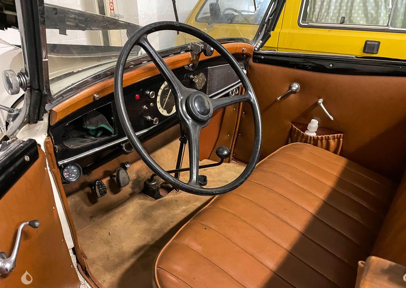 The interior is in good condition. The brown leather upholstery has no tears or holes but shows very slight wear. The steering wheel and the dashboard are in good condition.