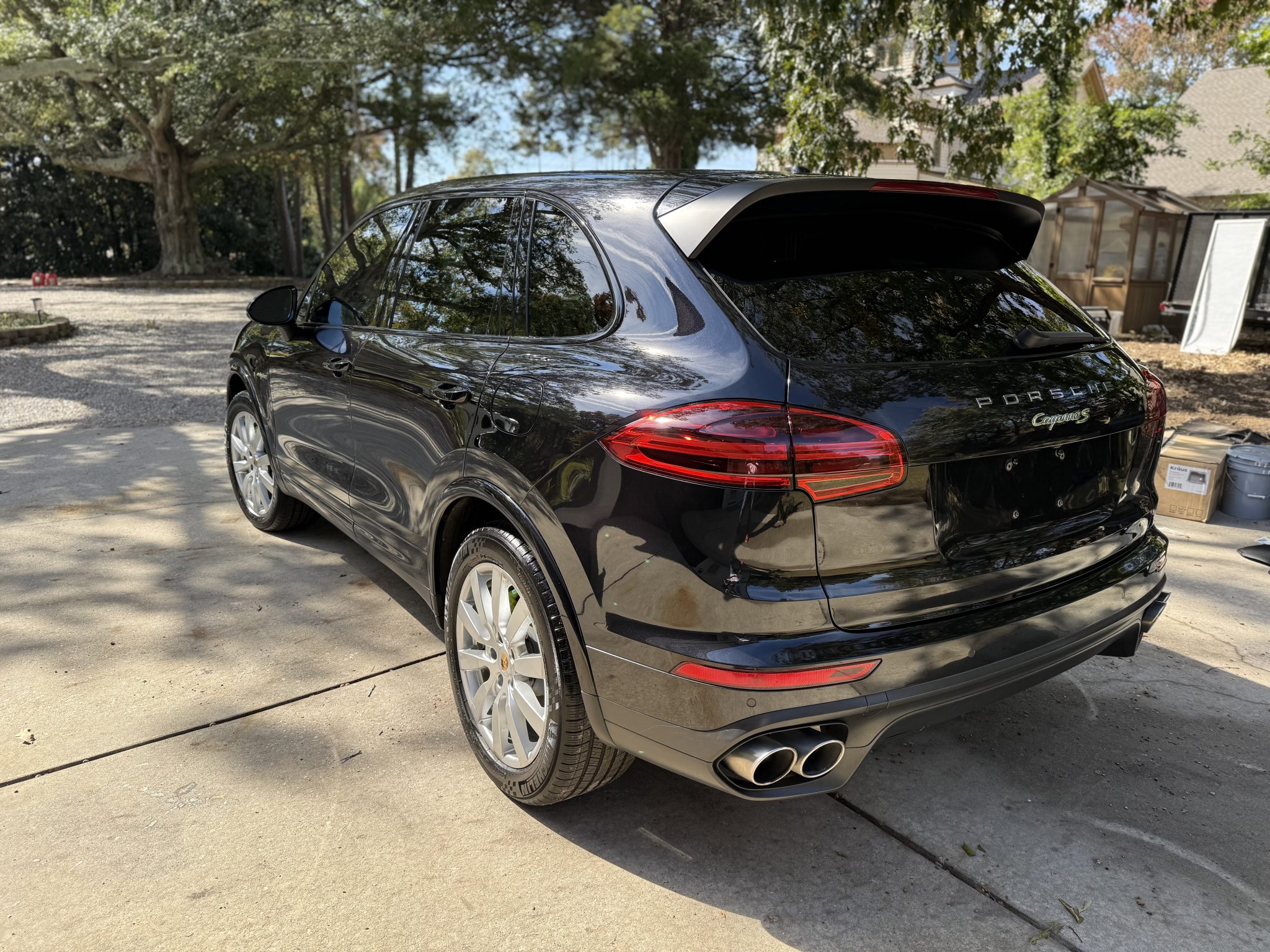The 20″ Cayenne SportDesign II alloy wheels are mounted with 275/45 Michelin tires. Stopping power is provided by green-finished six-piston front and four-piston rear brake calipers over ventilated rotors at each corner. A brake fluid flush as carried out in December 2023, and the front brake pads were replaced in March 2024.