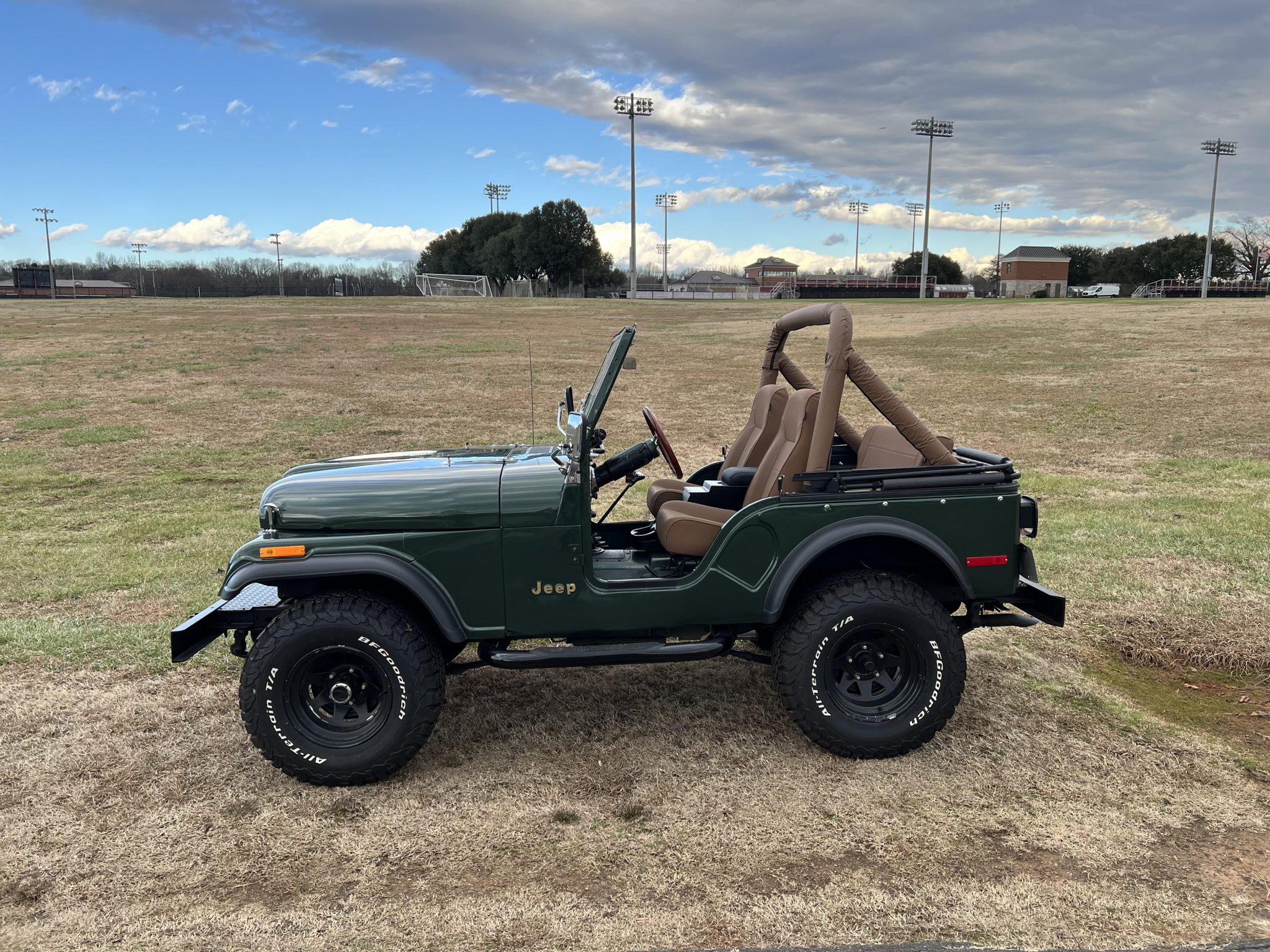 Black 15″ steel wheels were mounted with 31×10.5″ BFGoodrich All-Terrain T/A KO2 tires in 2022. The Jeep is equipped with manually locking front hubs and power steering. Braking is handled drums at each corner.
