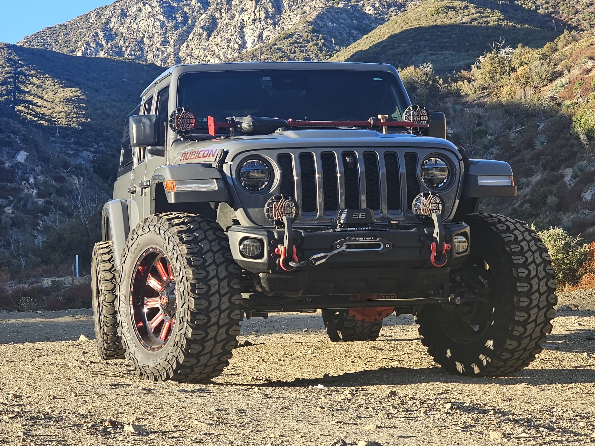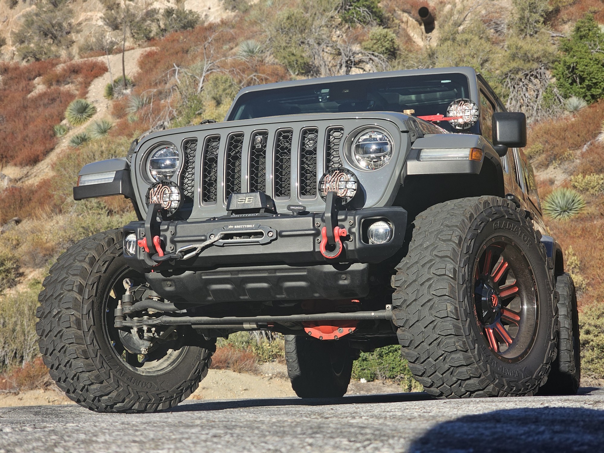 Black-finished 20″ Fuel Hardline wheels with red-anodized accents are wrapped in Gladiator X Compt M/T tires. The suspension features a Falcon steering stabilizer, an Off Road+ driving mode, Fox shocks at all four corners, and a front sway bar that can be disconnected via a button on the center stack. Braking is handled by four-wheel discs with ABS.
