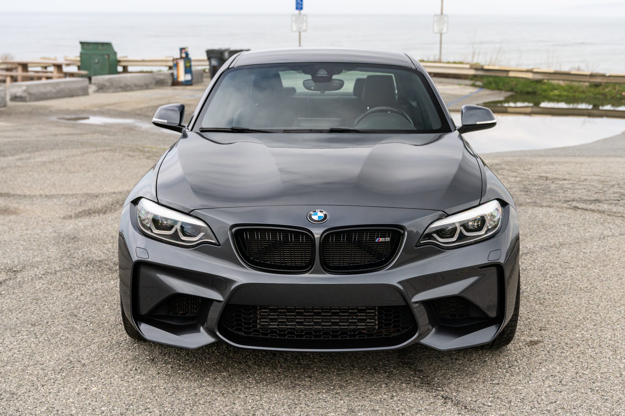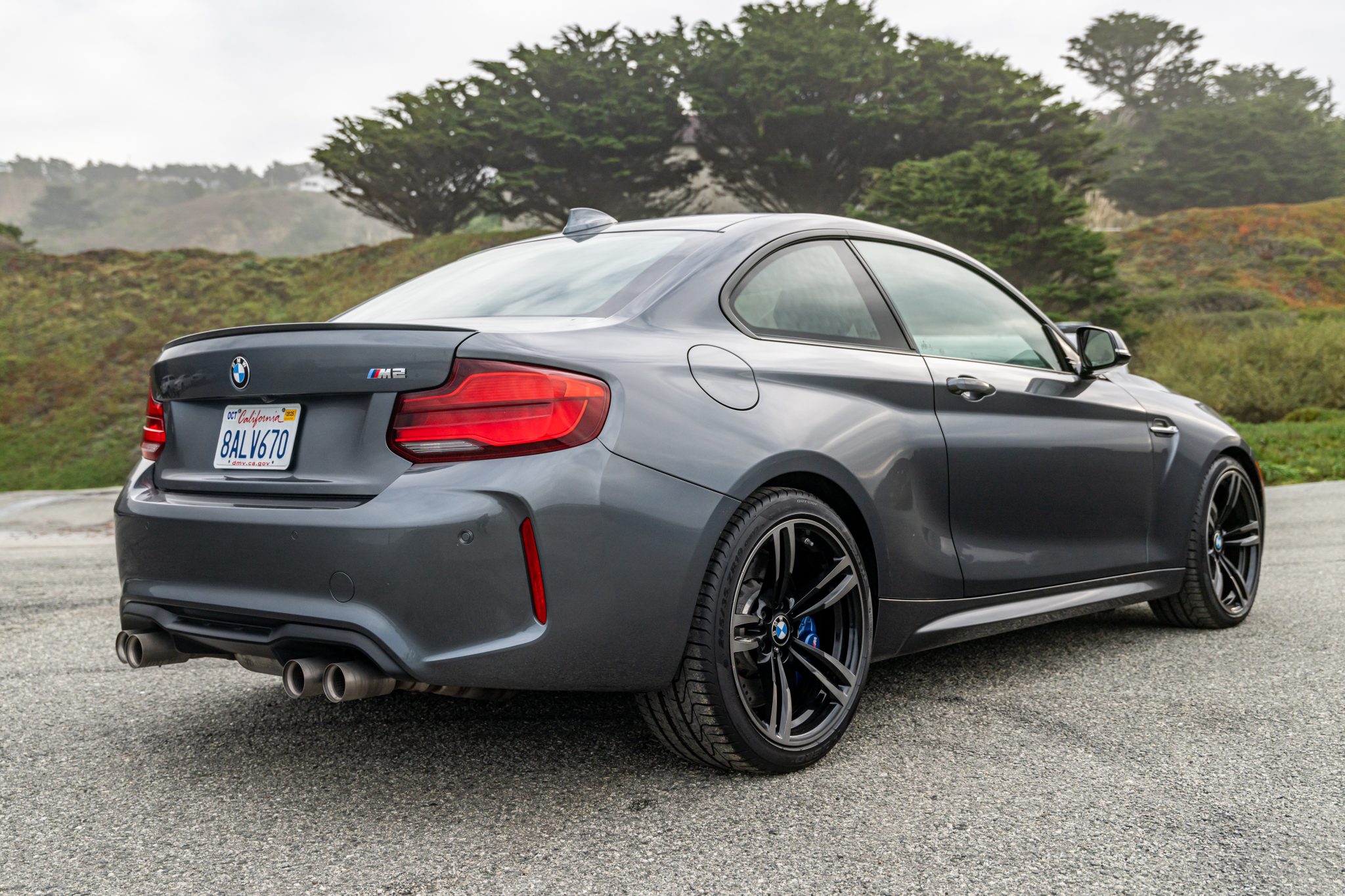 The 19″ Style 437M alloy wheels are mounted with Pirelli P Zero tires, and multiple wheels have curb damage. The car is equipped with an M-specific sport suspension, and braking is handled by blue M-logo calipers mounted over cross-drilled rotors. The Executive Package added Active Driving Assistant, which included lane-keep assist and pre-collision warning.