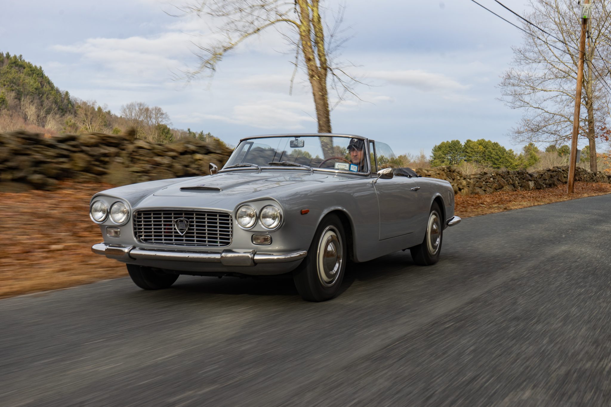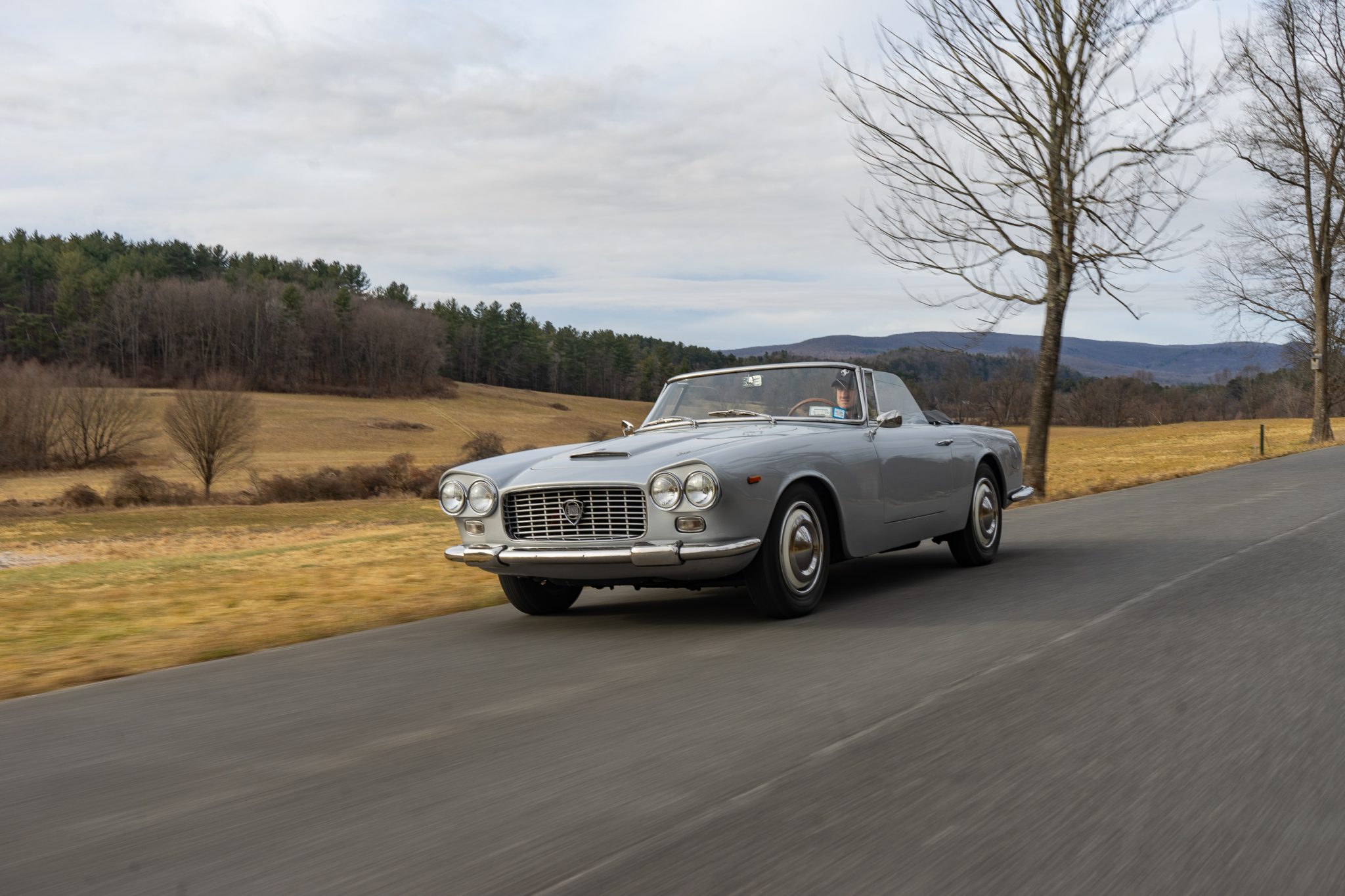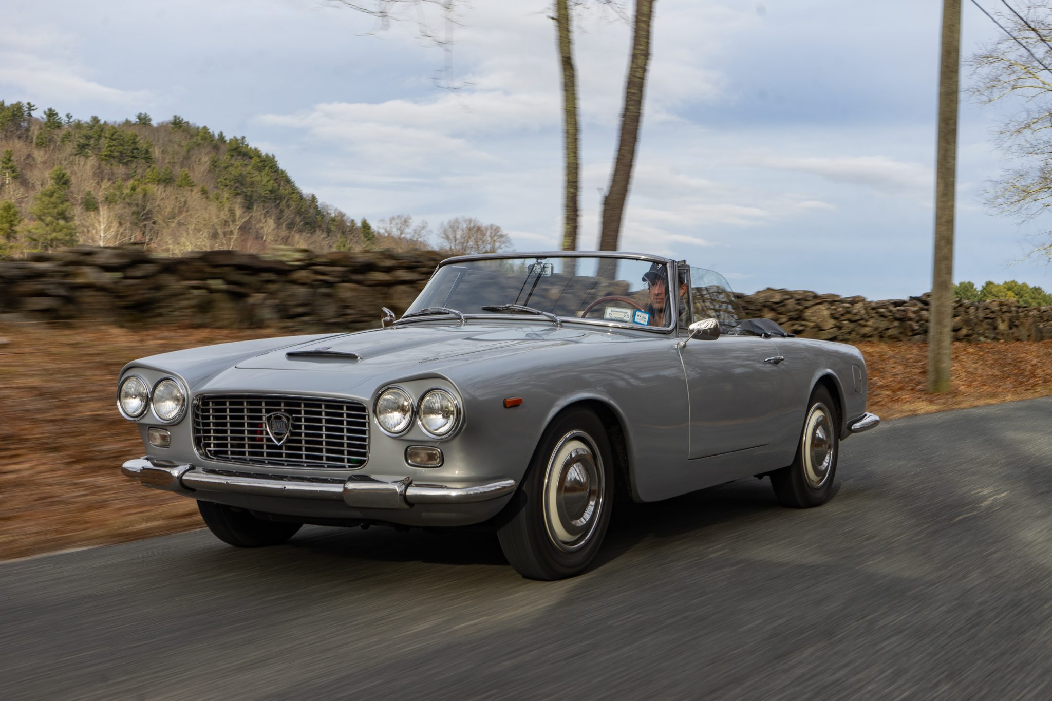 The cream-finished 400mm steel wheels wear polished trim rings as well as Lancia-branded hubcaps, and they are mounted with 165-series Michelin X tires. The Flaminia rides on a 99″ wheelbase and features an independent double-wishbone front suspension and a de Dion tube rear setup with an anti-roll bar. The car has been fitted with power-assisted steering, and braking is handled by four-wheel disc brakes with inboard-mounted rotors out back. The brake booster was repaired in July 2024, at which time the system was adjusted and bled.