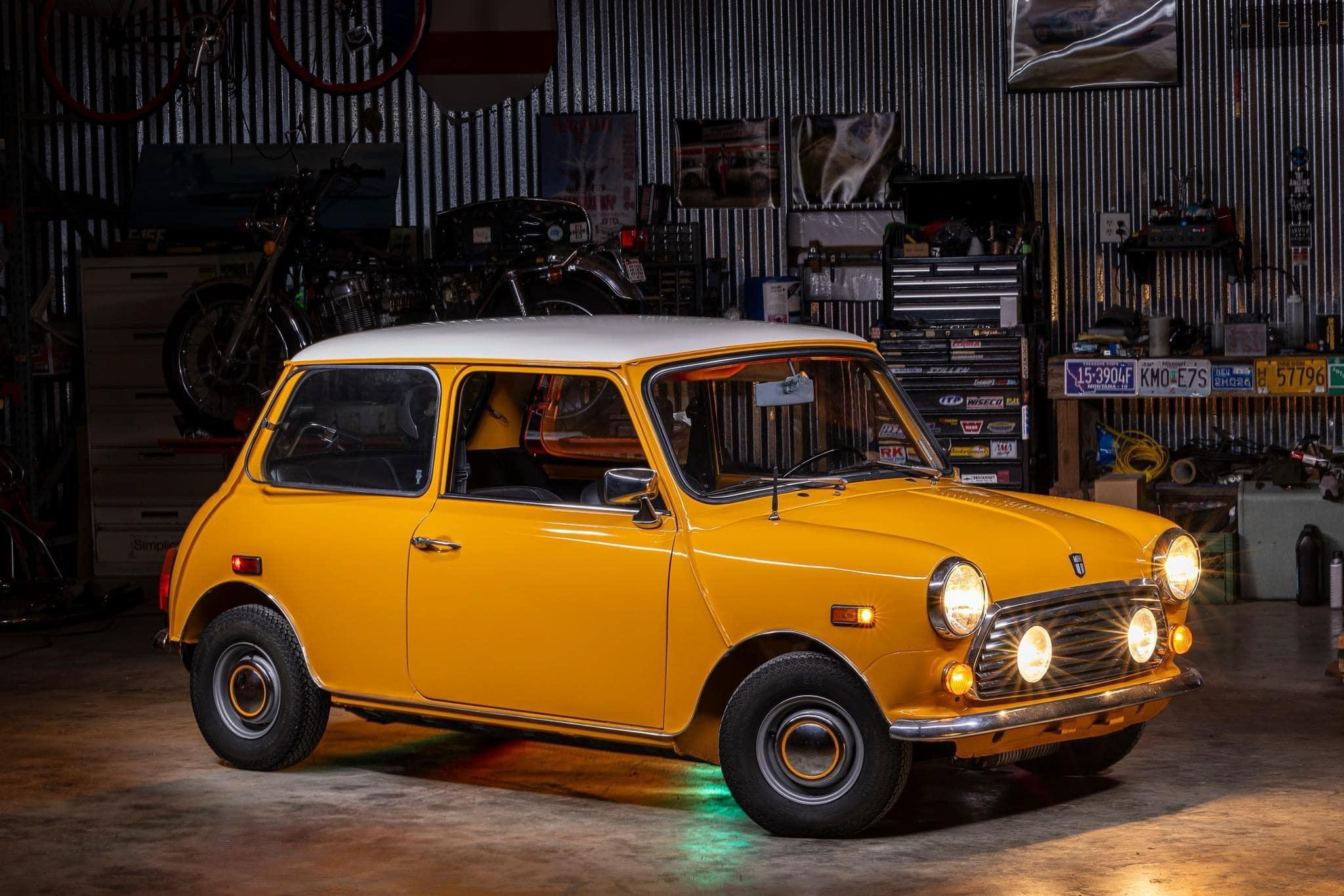 The 10″ steel wheels wear polished hubcaps with body-color accents and wear Coker tires. Stopping is provided by drums at each corner, and the car rides on coil-sprung suspension.