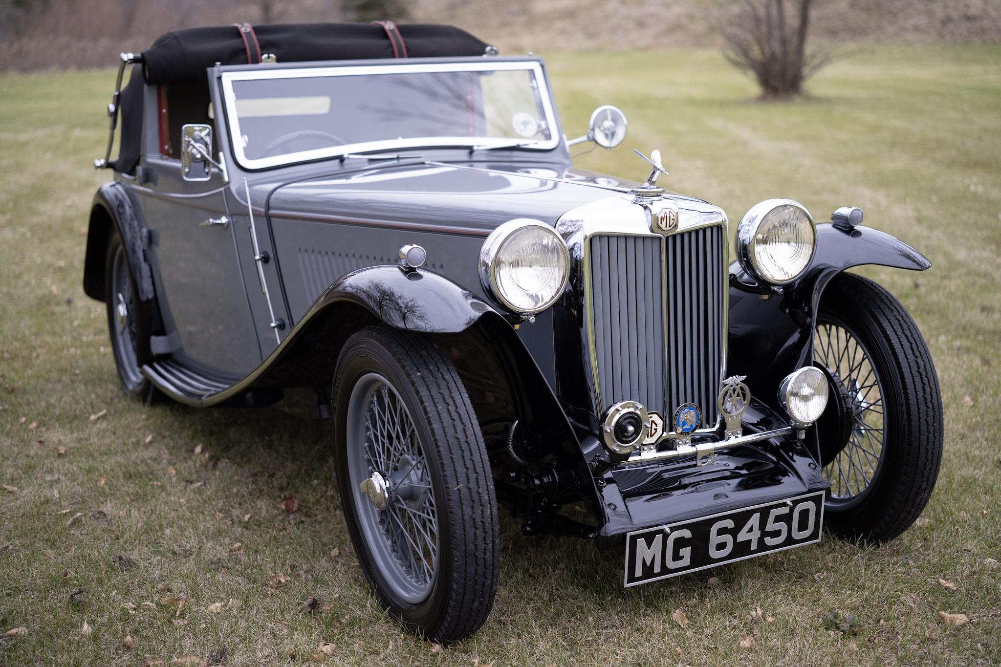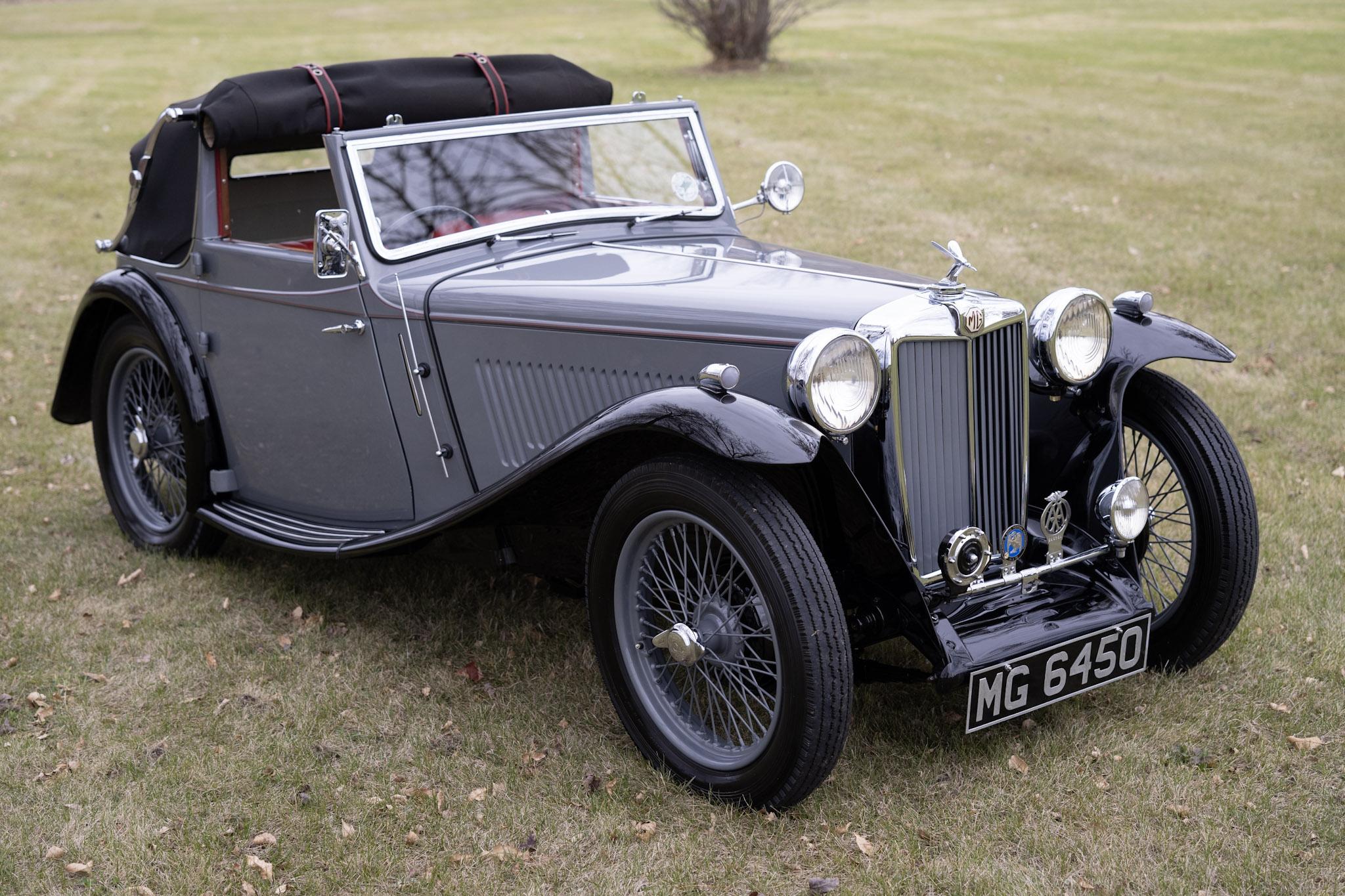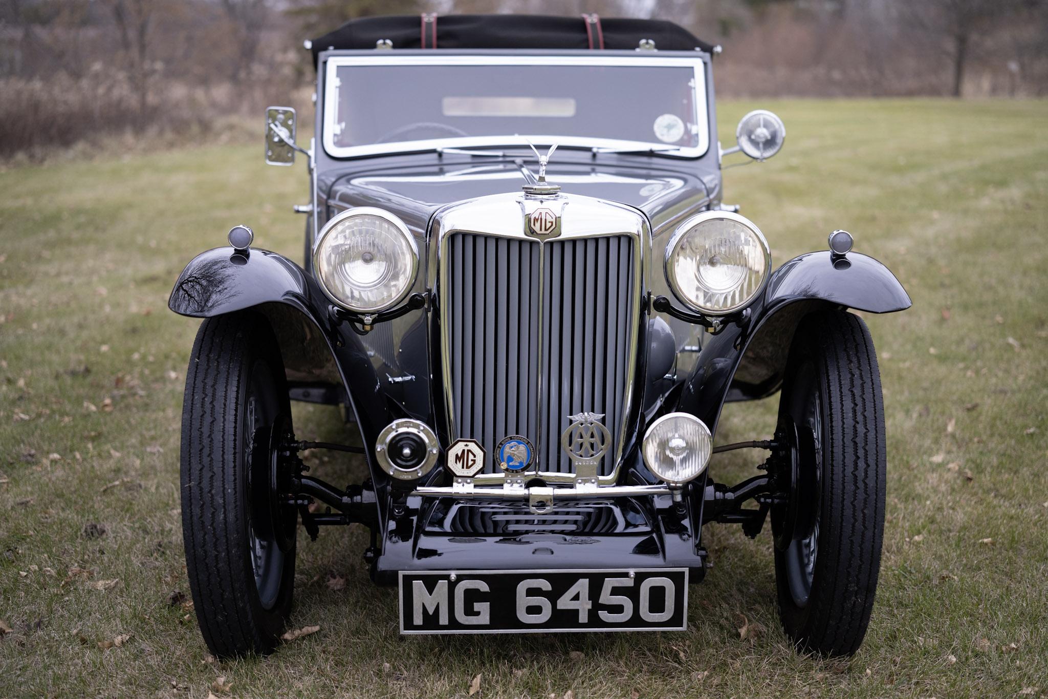 This example was refinished in metallic gun-metal gray with red pinstriping and black fenders during the refurbishment performed between 1987 and 1990, which included repairs to the ash framework and body panels. Features include rear-hinged doors, a badge bar hosting a single driving lamp, a midge radiator mascot, trafficators, a passenger-side spotlamp, a rectangular driver-side mirror, and a black convertible top designed to be used fully open, fully closed, or covering the rear shelf area only. A 1939-expiring UK tax disc is affixed inside the windshield.