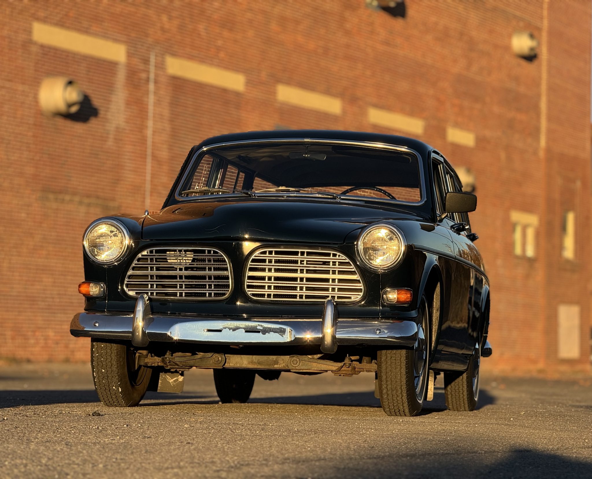 The 15″ slotted steel wheels have bright hubcaps and are mounted with 165-series Michelin thin-whitewall tires. Front disc brakes are paired with rear drums. The steering tie rod ends were replaced in 2024 according to the selling dealer.