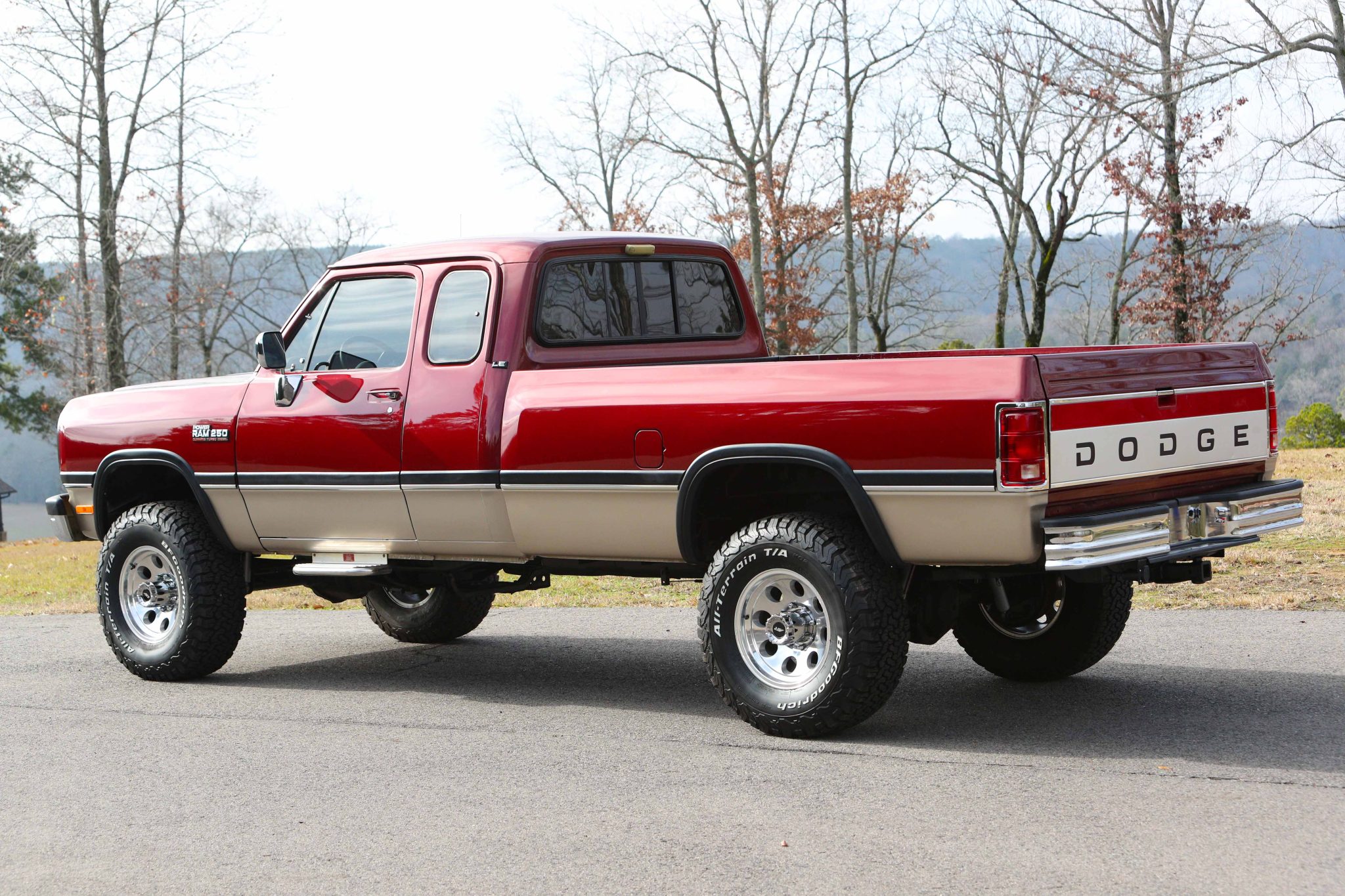 The 17″ American Racing alloy wheels are mounted with 35×12.5″ BFGoodrich All-Terrain T/A white-letter tires. The truck is equipped with manually locking front hubs, a Rough Country 4″ suspension lift, aftermarket shocks, and power steering, and braking is provided by power-assisted front discs and rear drums.